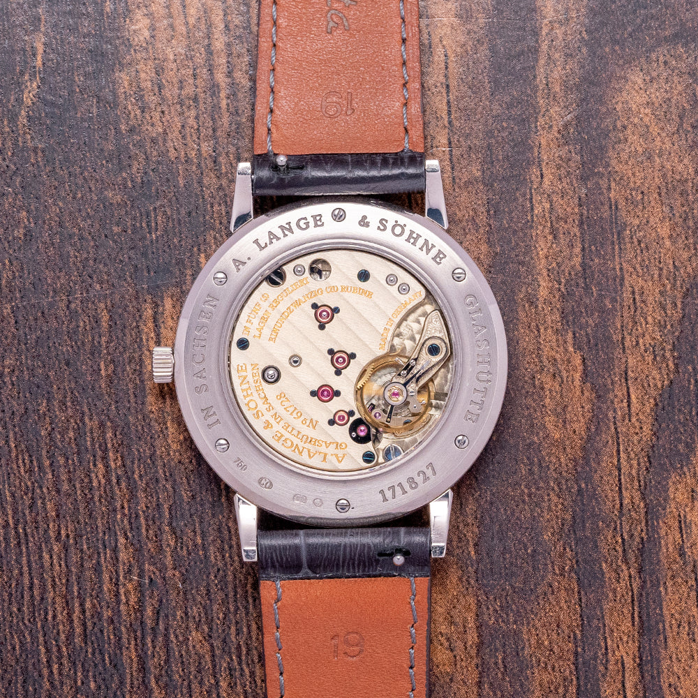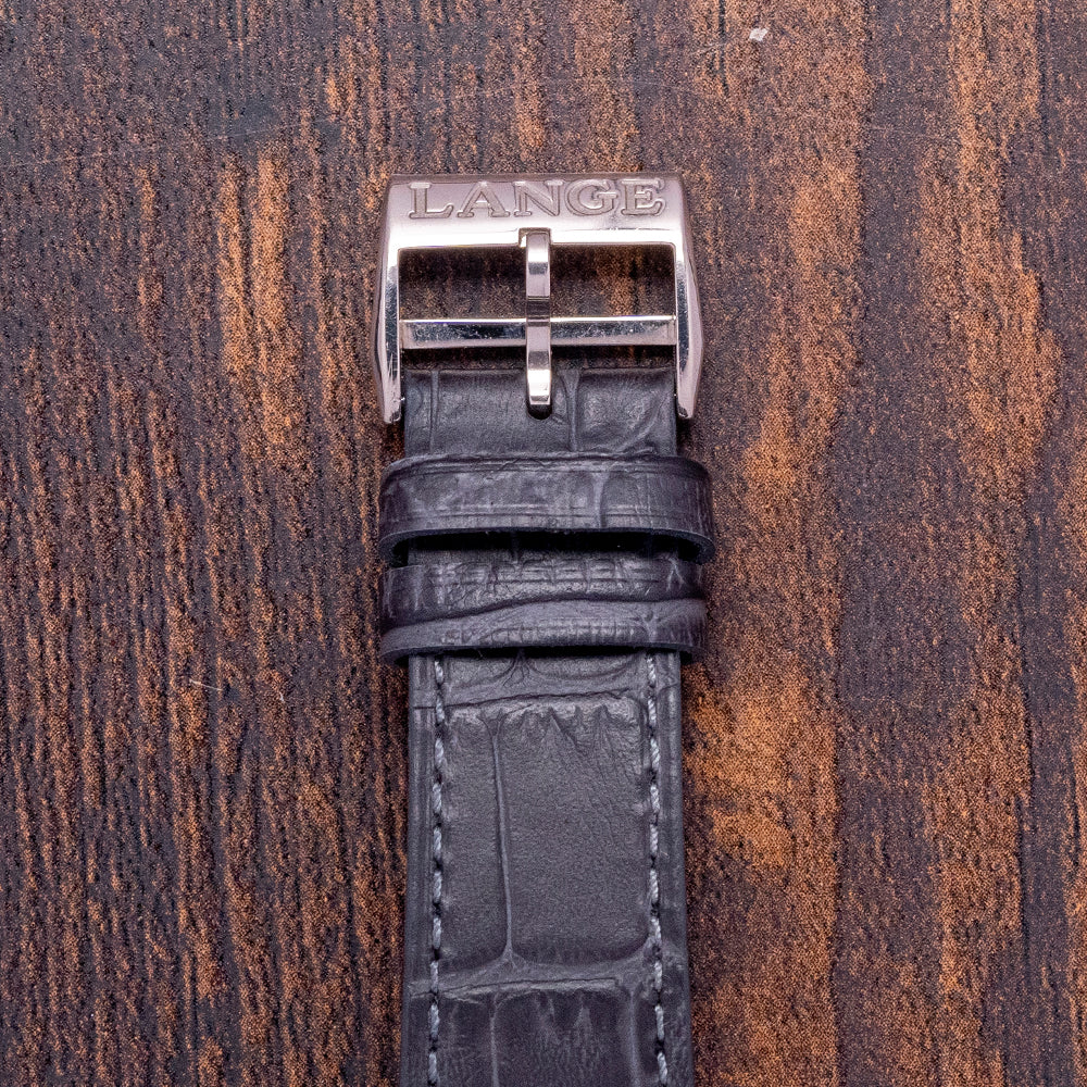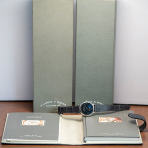 This watch is sold with its A. Lange & Söhne Service box and A. Lange & Söhne paperwork. It comes paired with a 19mm Grey Geckota strap and the original signed 18ct White Gold Buckle. The watch is from March 2008 and is in worn condition; however, as you can see from the photos, the watch is in very fair overall condition. The watch comes with our 12-Months NON-Waterproof Warranty.