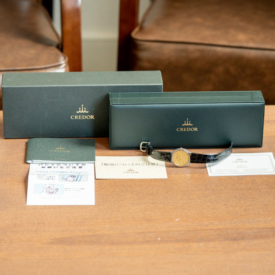 Seiko, with the success of the Grand Seiko quartz line in 1974, decided to create another luxury line called “Crêt D’or.” The term in English translates to Gold Crest, which was used to describe the top of the mountain. Later, in 1978, they produced their first catalogue and renamed the brand Credor, a combination of the original name. In 1980, they produced the world's thinnest movement at just under 1mm thick. Since then, Credor has been free to pursue exotic watchmaking, the likes of which we associate companies like Vacheron Constantin with A. Lange & Sohne.