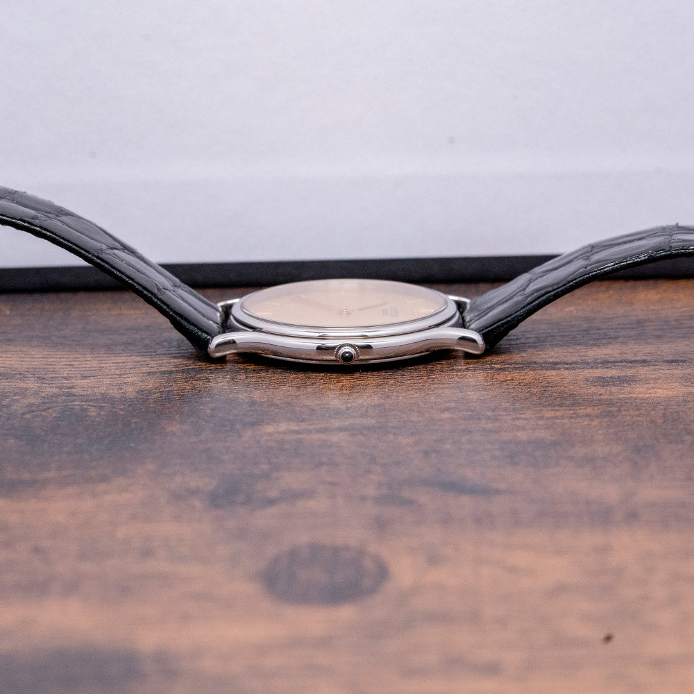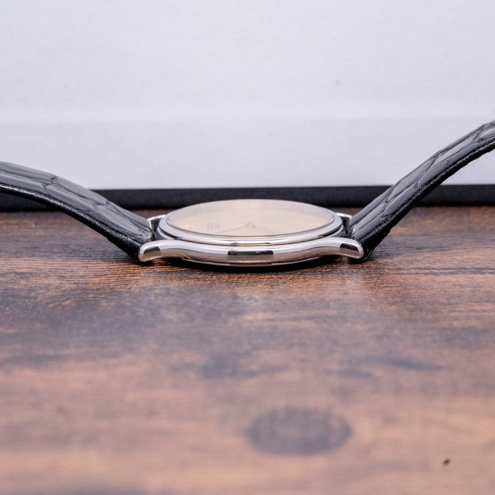 Here we have a 2008 Credor Seiko Signo Ultra-Thin Quartz GCAR051 with a curvaceous polished 32mm stainless steel case that delicately curves over your wrist thanks to the thin, sculpted lugs, and a lug-to-lug length of 36mm and a case thickness of an incredibly thin 5mm ensures a comfortable fit. On the right side, a domed cabochon inset crown. The polished bezel holds a flat sapphire crystal above a stunning dial in a golden hue; a minute track has applied gold-toned baton indexes marking the hours that magically play with the light as you rotate your wrist. Gold-toned sword hands sit majestically in the centre, complemented by a tapered second hand; at 12 o’clock, we have the applied Credor motif and Credor Seiko printed underneath, completing this sophisticated dress watch. On the reverse, a snap-off brushed stainless steel case is back with the details of the watch engraved inside a quality high precision Quartz Credor Cal. 8J81 movement. The watch comes paired with its original Credor 17mm leather strap and polished pin buckle and comes with its Credor presentation box and paperwork.