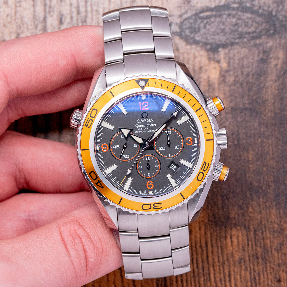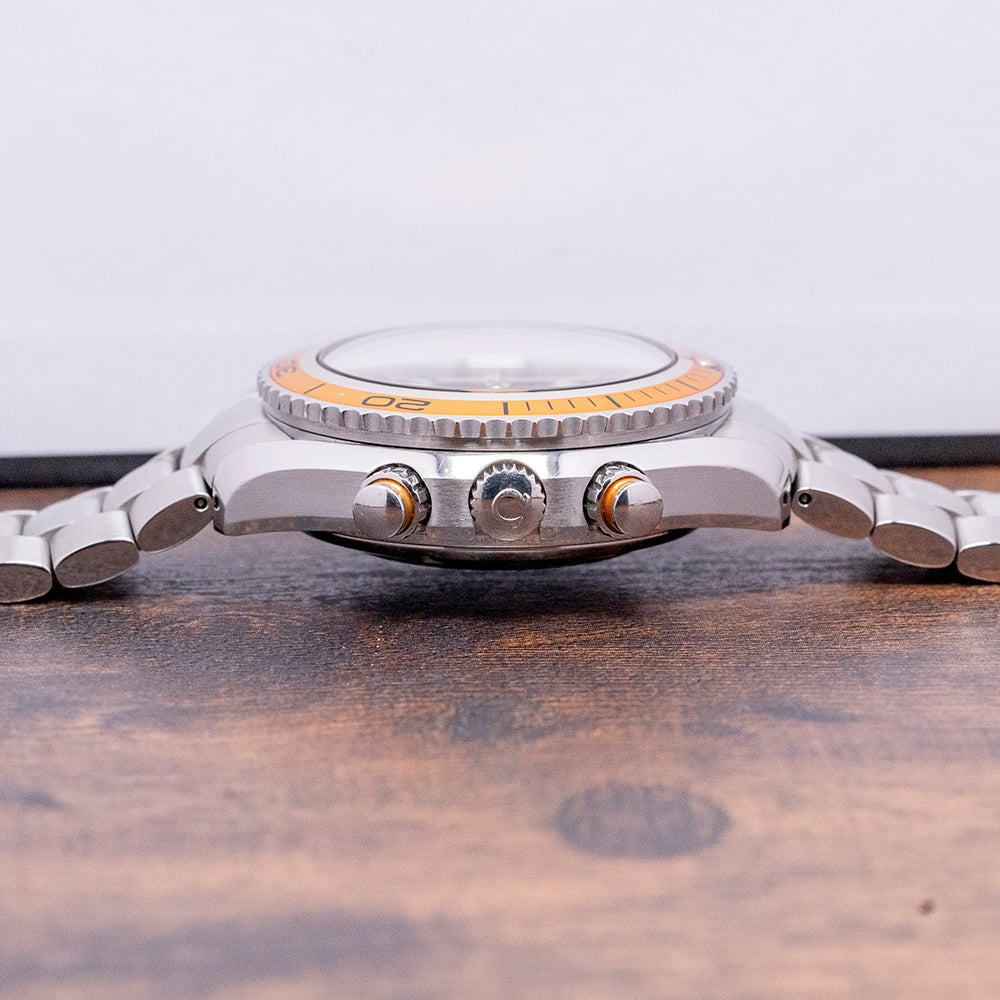 Here we have a 2008 Omega Seamaster Planet Ocean Chronograph with a 45.5mm polished and brushed 316L stainless steel case that sits comfortably on your wrist thanks to the characteristic twisted lugs, and a lug-to-lug length of 51.5mm and a case thickness of 17mm giving the watch an impressive wrist presence. Down the right side, we have the chronograph pushers with orange collars and a signed screw-down crown, which sits recessed in the centre. On the left side, at 10 o’clock, you find a manual Helium escape valve. The scalloped unidirectional stainless steel bezel has an orange 60-minute dive insert with black numerals and markings, and a slightly domed sapphire crystal AR coated sits above a dynamic black dial. An outer minute track is precisely executed, surrounding orange numerals at the cardinal points and applied baton indexes marking the hours, coated in Super-LumiNova; at 3 o’clock, we have a 30-minute register; at 6 o’clock, a 12-hour register and a colour-matched date window between the 4 and 5; finally, at 9 o’clock, the small seconds register, each slightly recessed with an orange ring, white numerals, broad arrow hands filled with Super-LumiNova are complemented by a red-tipped, at 12 o’clock we have an Omega motif “Seamaster Co-Axial Chronometer” complete this dive themed chronograph. On the reverse, a screw-down case back with the details of the watch engraved around the edge and an embossed polished Hippocampus in the centre, a seahorse that represents Neptune, the God of the sea; Pierre Borie conceived it after seeing a picture of Neptune riding a chariot pulled by seahorses; it is the reason why the seahorses are wearing a harness, first seen on the Seamaster in 1958. In the centre, inside an automatic Omega Cal. 3313, 36 jewels, beating at 28,800 beats per hour, this column-wheel chronograph has the iconic Co-Axial Escapement. The watch comes paired with its brushed 22mm Omega three-link Stainless steel bracelet secured by a signed push button released folding clasp; all links are provided, and it comes with its Omega presentation box and paperwork.