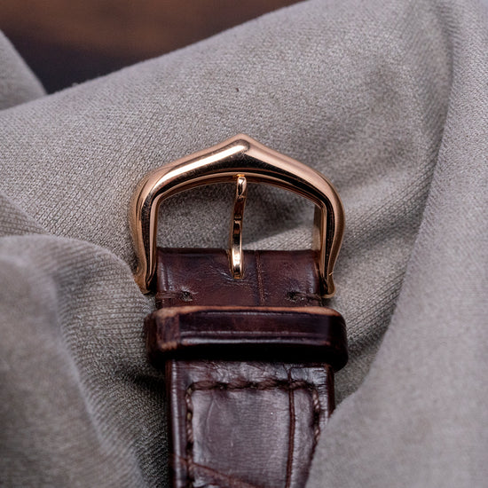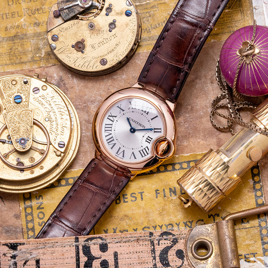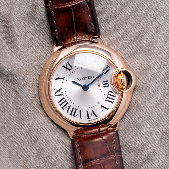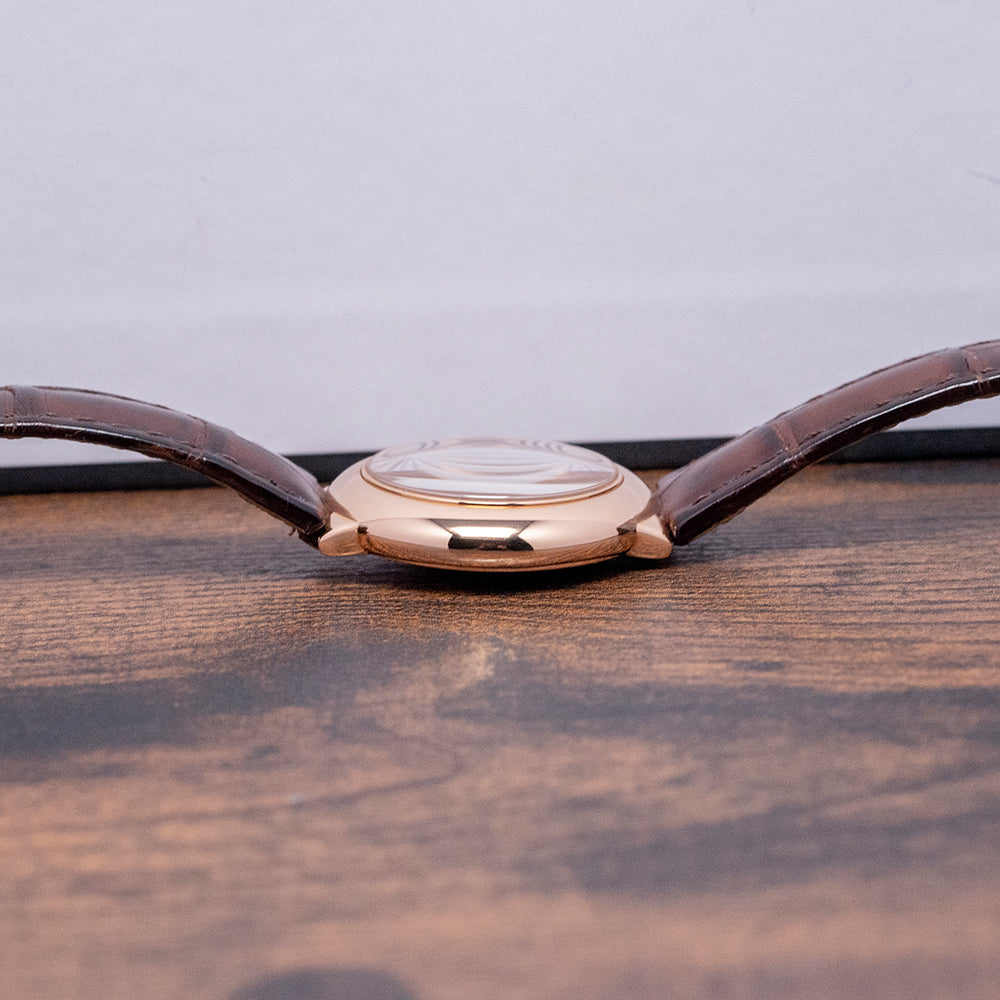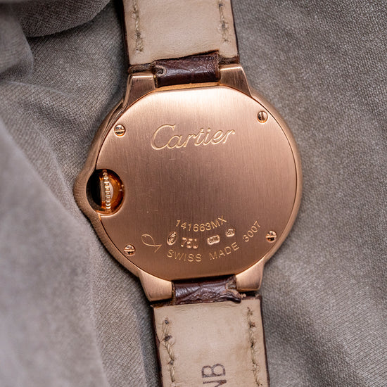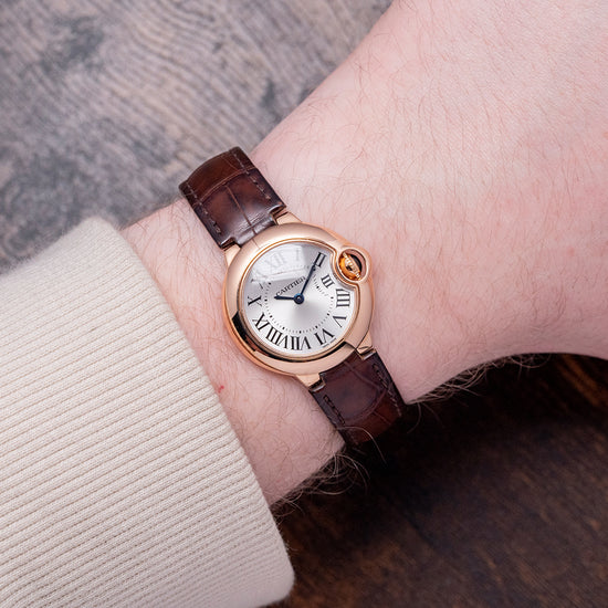 Here we have a curvaceous 2009 Cartier Ballon Bleu Quartz W6900256, introduced in 2007; its name means “blue balloon” and refers to the crown at 3 o’clock that appears to float magically within a protective bubble. Thanks to the integrated leather strap, it has a 28mm 18ct Rose Gold “Au 750” round convex case that flows effortlessly over your wrist. Its soft, rounded flanks lead to a lug-to-lug length of 29mm and a case thickness of just 8.5mm, ensuring a comfortable fit on your wrist. The beautiful case shape integrates a fluted crown capped with a blue sapphire cabochon. A slightly curved sapphire crystal follows the distinctive contours of the case above a stunning lacquered silver opaline dial. Large Roman numeral indexes mark the hours surrounding an inner minute track, and elegant blue steel sword hands sit majestically in the centre. At 12 o’clock, the Cartier motif completes this beautifully sculpted dress watch. On the reverse, a vertically brushed 18ct Rose Gold (Au 750) screwed-down case back engraved with the details of the watch, inside a quality Quartz movement. It comes paired with a 7.5mm integrated Cartier leather strap with an 18ct Rose Gold (Au 750) pin buckle. The watch comes with its Cartier presentation box and paperwork, including 2022 Cartier Service paperwork.