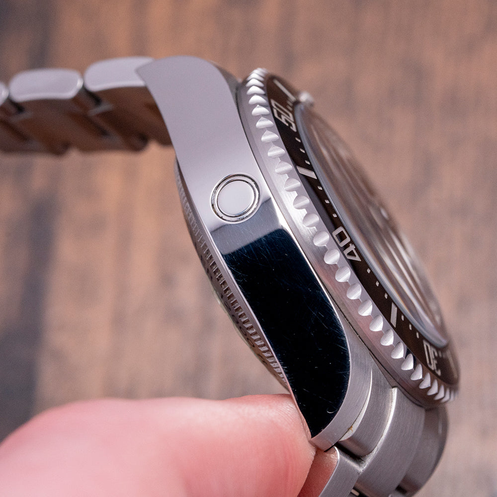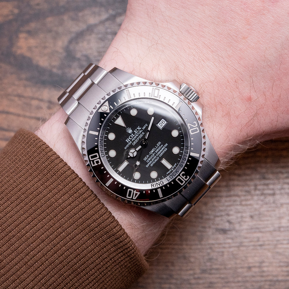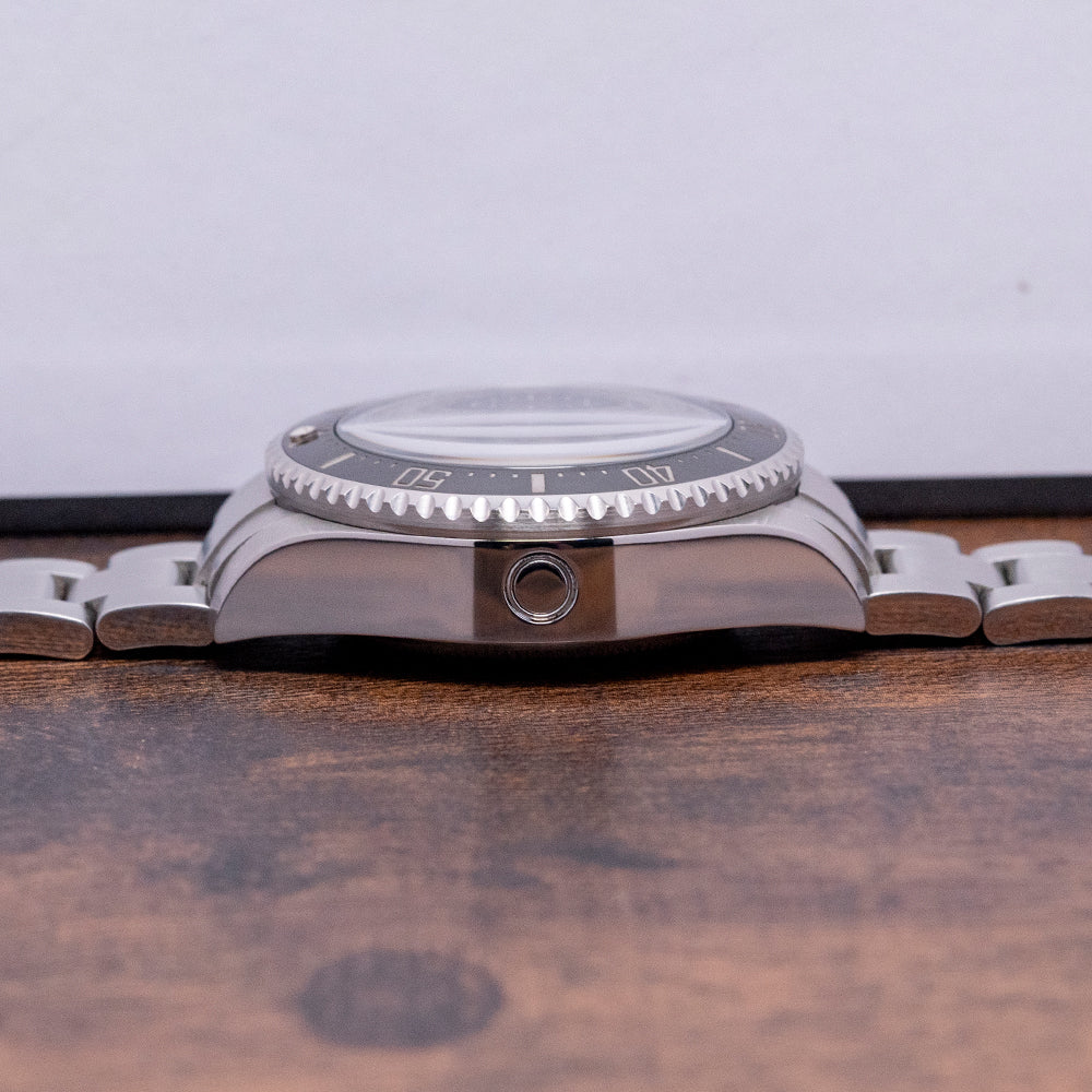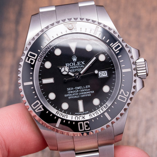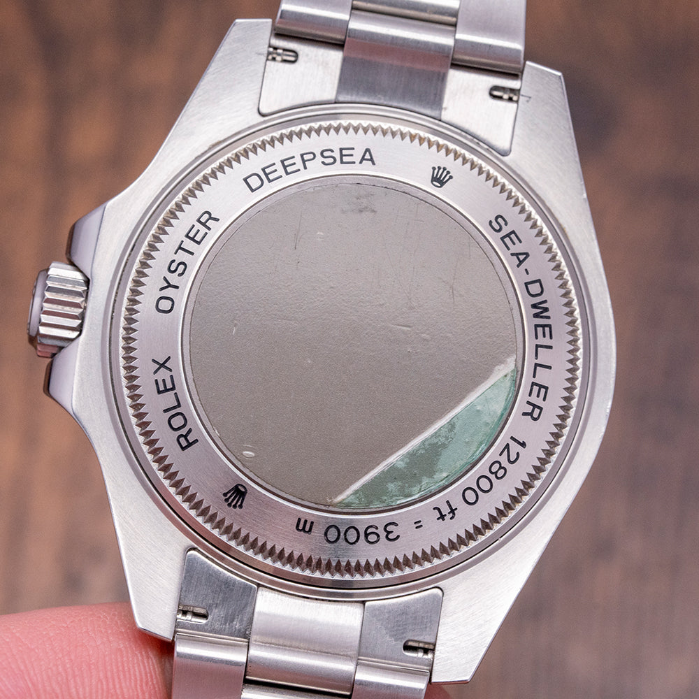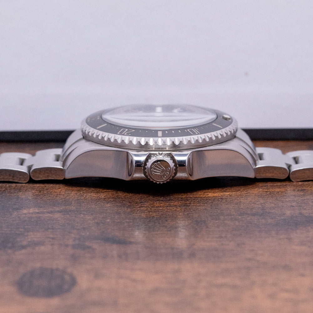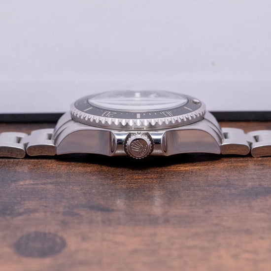 The reference number 116660 was launched at Baselworld in 2008; at the time, it was the most water-resistant watch in production. To achieve its depth rating, the Sea-Dweller deepsea is tested to an incredible depth of 4,875 meters (15,994 ft), with a 25% safety reserve required by the ISO 6425 divers' watches standard. Our 2009 Rolex Deepsea Sea-Dweller Black Ceramic 116660 has a 44mm stainless steel Oyster case. The polished and brushed surfaces transition with crisp edges. A lug-to-lug length of 52mm and a case thickness of 17mm give the watch an imposing wrist presence. Such dimensions are necessary for the watch to achieve its incredible water resistance. On the right side is a Triplock screw-down crown, a system introduced on the Sea-Dweller in 1970, it consists of three sealed zones, two gaskets within the tube, and a third gasket under the winding crown. On the left side, you find the Helium escape valve flush with the case; it automatically releases the Helium when it reaches a critical point. The stainless steel unidirectional bezel has a Ceramic 60-minute dive insert. A domed sapphire crystal is 5.5mm thick, enabling it to descend to those incredible depths. An outer ring surrounded by an “Original Gas Escape Valve “ “Ring Lock System”. A matte black dial with Chromalight coated discs and baton indices mark the hours. Chromalight was debuted on this watch, a Rolex proprietary compound that gives off a blue glow in the dark. At 3 o’clock a date window, you’ll notice that there are no cyclops, the reason being that extra thick crystal. Mercedes' hands are complemented by a second hand with a lollipop counterweight coated in Chromalight. On the reverse, a coin-edged case back. Inside an Automatic Rolex Cal. 3135, 31 jewels, 28,800 beats per hour. COSC Chronometer Certified workhorse. It is fitted with a Parachrom hairspring designed by Rolex; it offers greater resistance to shocks and to temperature variations. The watch comes fitted on its original Rolex 21mm solid end link 904L stainless steel Oyster bracelet with OysterLock safety clasp and glide-lock extension system, which allows the watch to be worn over a divers suit, or be adjusted on the fly during the day, all links are provided. The watch comes with its Rolex presentation box and papers.