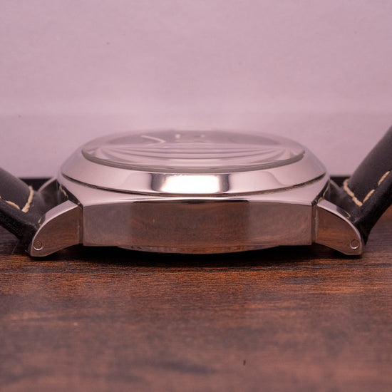 Here we have a 2010 Panerai Luminor Marina 44mm Manual PAM00111 inspired by Panerai’s 1950s combat watch, the ref. 6152 with its iconic 44mm cushion stainless steel case, polished surfaces lead to thick straight screwed lugs that hug the wrist with a lug-to-lug length of 52.5mm and a case thickness of 14.5mm giving the watch an impressive wrist presence. On the right side is the characteristic crown guard with its release and locking mechanism, a smooth polished bezel holds a sapphire crystal above a black sandwich dial. A black stencil dial bearing the indexes and numerals is overlaid atop a fully-painted luminescent disc, this process has been perfected since its inception in the 1930s. Luminor is based on Luminova and has been developed by Panerai since the 1950s. The two hands are black-oxidised and infilled with Luminor luminance in striking contrast to the black of the dial. At 9 o’clock a small second sundial, at 12 o’clock we have “Luminor Marina" and at 6 o’clock “Panerai” motif completes this distinctive dive watch. On the reverse, a screw-down exhibition case back with the details of the watch engraved into it, inside a manually wound Panerai Cal. OPXI, 17 jewels, beating at 21,600 beats per hour, based on the ETA/Unitas 6497/2, Panerai has used this movement in various models since 2002. The watch comes paired with a 24mm Panerai leather strap with a signed buckle and the watch comes with its Panerai presentation box and paperwork.