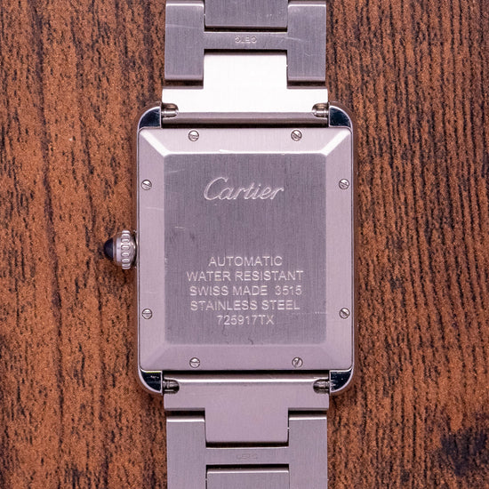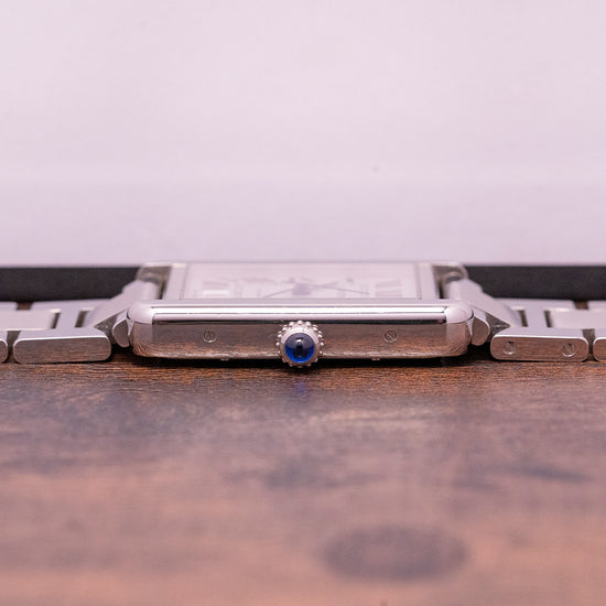 Here we have a 31mm Cartier Tank Solo XL Automatic that has an understated elegance in its stainless steel case, its slim profile has screw detailing and ends with soft rounded corners. A lug-to-lug length of 40.5mm and a case thickness of just 7.5mm leads to a comfortable fit on the wrist, polished and brushed surfaces transition with perfect lines. On the right side is a crown with a blue cabochon stone inset. A flat sapphire crystal sits above an Opaline silver dial, large Roman numerals mark the hours that radiate from the centre and surround an inner minute track. At 6 o'clock we have a framed date window. Elegant heat-blued pencil hands complete the sophisticated dial. On the reverse, we have a screwed-down case back, engraved with the details of the watch, inside an automatic Cartier Cal. 049, 21 jewels, beating at 28,800 beats per hour, this movement has a base of the ETA 2892-A2 and has hand winding and hacking seconds for your convenience. The watch comes paired with its 23mm Cartier polished and brushed stainless steel bracelet complete with its hidden Cartier deployment clasp, all links are provided. This watch is sold with its original Cartier box, Cartier booklets, and Cartier booklet holder.