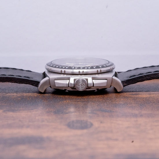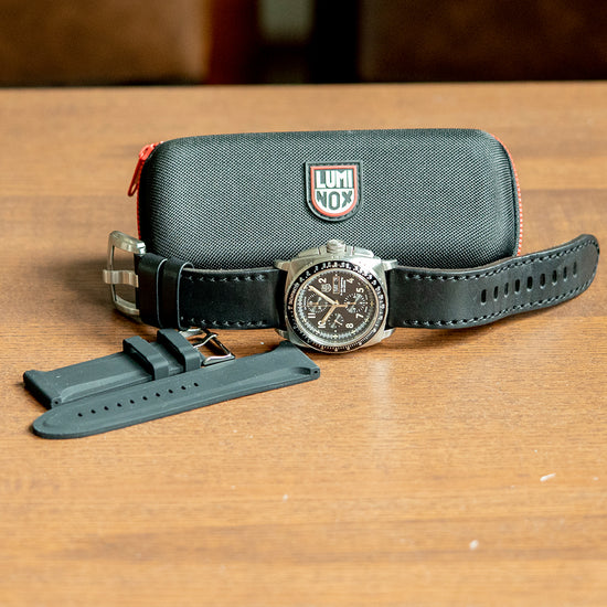 This watch is sold with its original Luminox case but no Paperwork. The watch comes paired with its 28mm Luminox black leather strap and signed pin buckle, plus a 28mm rubber strap. The watch is from Circa. 2010s and is sold in worn condition, but overall, it is in very fair condition, as you can see. The watch comes with our 12-Months NON-Waterproof Warranty.
