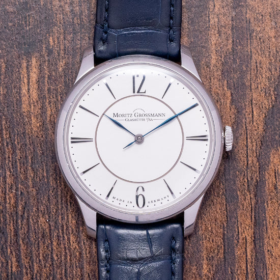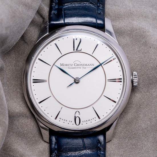 Here we have a classic 2010s Moritz Grossmann Tefnut Stainless Steel Cal. 202.0. It features a polished 38.5mm stainless steel round case that sits comfortably on your wrist, thanks to its finely tapered lugs. The curved, polished flanks lead to a lug-to-lug length of 45mm and a case thickness of just 8mm. On the right side, there is a coin-edged crown. The smooth, polished bezel holds a flat crystal above a stunning silver sector dial. An outer minute track surrounds the applied 12 and 6 with fine indexes in between, marking the hours. Delicate Moritz Grossmann hands sit majestically in the centre. At noon, the Moritz Grossmann motif completes this distinctive, sophisticated dress watch. On the reverse, a screwed-down exhibition case back engraved with the details of the watch around its edge, inside a stunning manually wound Moritz Grossmann Cal. 202.0, 26 jewels, beating at 21,600 beats per hour, made up of 188 components with the frame parts in untreated German silver, fitted with a Nivarox 1 balance spring. It comes paired with its 20mm Moritz Grossmann leather strap and pin buckle.