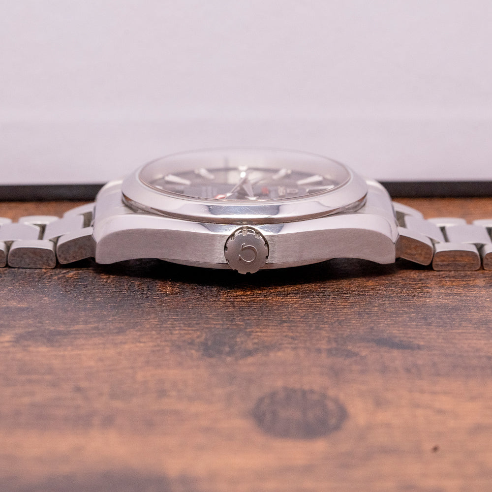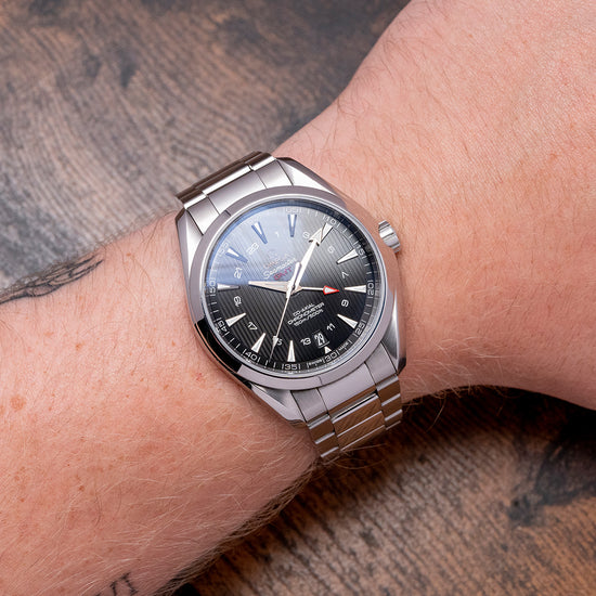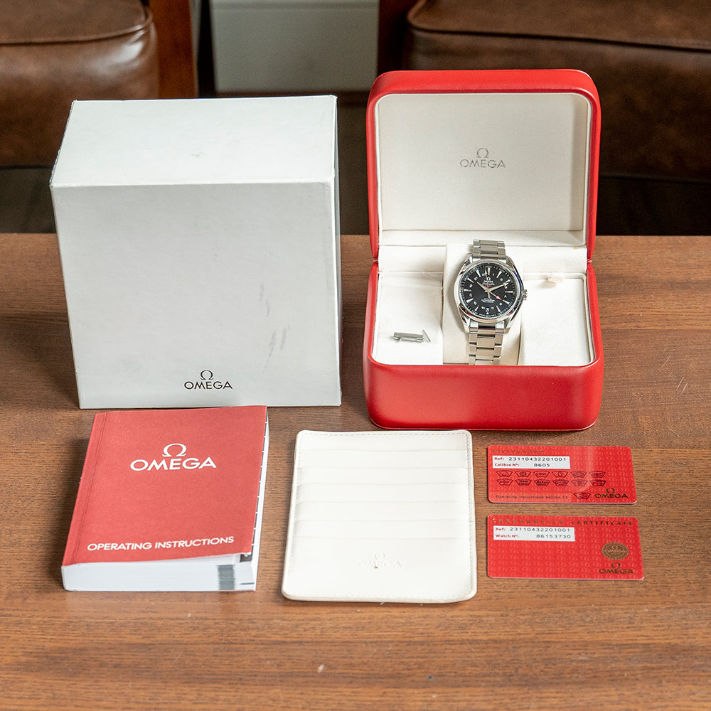 Here we have a 2010s Omega Seamaster Aqua Terra GMT 231.10.43.22.20.01.001, drawing inspiration from their classic Omega Seamasters of the 1960s with their simple lines and elegant design. A curvaceous 43mm polished and brushed 316L stainless steel case has the characteristic twisted lugs that effortlessly curve over your wrist with a lug-to-lug length of 51mm and a case thickness of 14mm, giving the watch an impressive wrist presence. Polished and brushed surfaces transition with crisp edges. On the right side is a recessed signed screw-down crown with deep knurling for extra grip. A polished smooth bezel holds a domed sapphire crystal AR coated on both sides above the striking Teak Concept black dial with distinctive vertical striping and an outer 60-minute chapter ring. Applied dagger indexes infilled with SuperLumiNova mark the hours and at 6 o’clock a date window. Around the centre, we have the 24-hour numerals, complete with a red arrow-tipped GMT hand that rotates once every 24 hours. The Broad-Arrow hands are filled with Super-LumiNova and complemented by an arrow pointed sweeping second hand. At noon, we have the applied Omega “Seamaster”, a red GMT, and at 6 o’clock “, a “Co-Axial Chronometer 150m/500ft” complete this dynamic versatile traveller dive sports watch. On the reverse, a screw-down exhibition case back with the details of the watch engraved around its edge, inside an automatic Omega Cal. 8605, 38 jewels, 25,200 beats per hour, COSC Certified, Omega Co-Axial Escapement movements use modern materials to achieve accuracy and reliability, such as a silicon hairspring and a free-sprung balance wheel, two barrels mounted in series, the Rotor and balance bridge is Rhodium plated and is bidirectional for improved efficiency, decorated in luxurious Côtes de Genève. The watch comes paired with its original 21mm Omega brushed and polished 3-link stainless steel bracelet with an Omega-signed push-button butterfly clasp. It also comes with its original Omega presentation box and cards, but the original warranty card is not included.