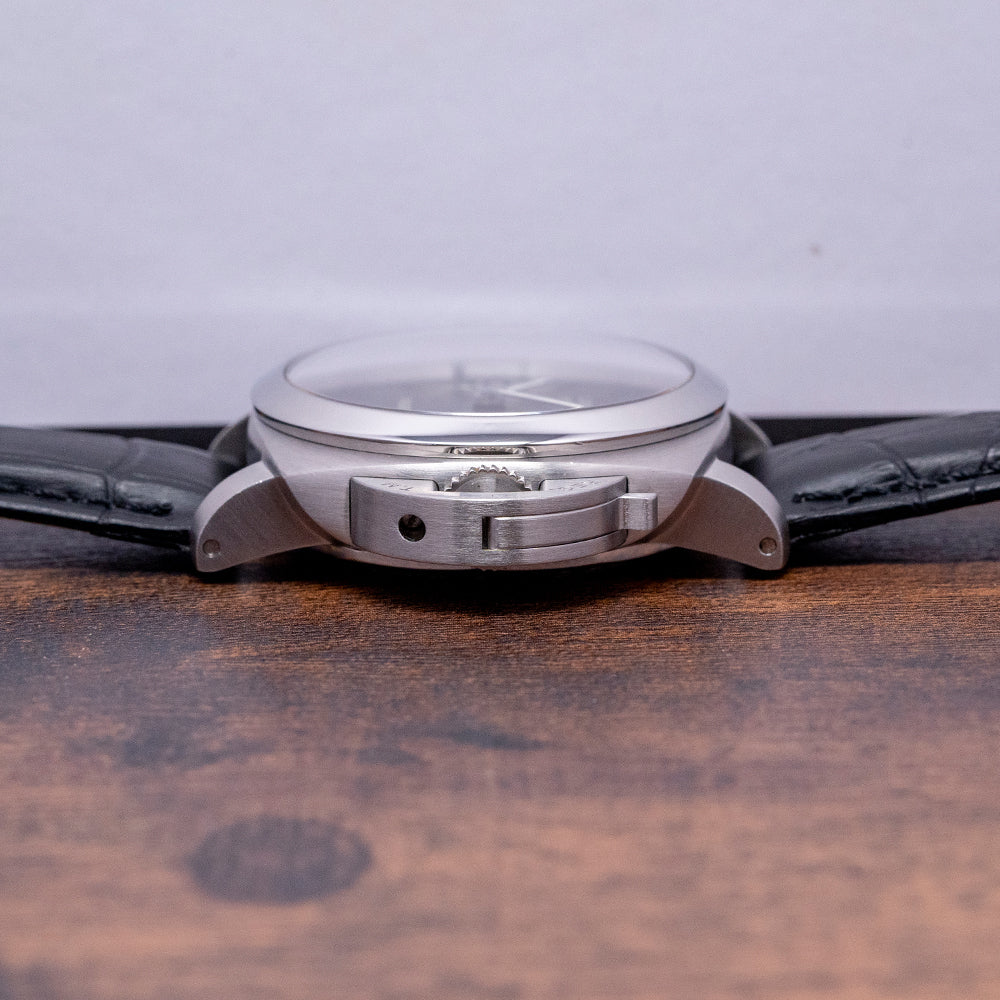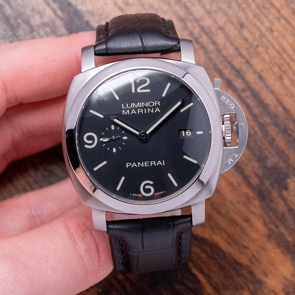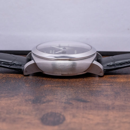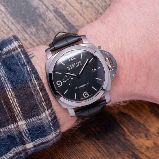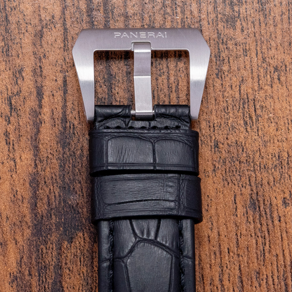 Here we have a 2010s Panerai Luminor Marina 1950 3 Days Automatic PAM00312 that was first introduced in 2009, a modern take on the Luminor watches of the 1950s. The distinctive 44mm brushed cushion case curves at the lugs, and a lug-to-lug length of 53mm and a thickness of 17mm give the watch an impressive wrist presence. On the right side, a pressed-secured crown with the large crescent crown guard, a Panerai trademark, ensures that the crown is pushed against the case. A polished bezel holds a domed sapphire crystal above a black sandwich dial. The upper level has cut-out numerals and batons, with the luminescence coming through from the lower level. At 3 o’clock, a date window. At 9 o’clock, a small seconds register. Long sword hands have luminescence infill. The text is finely printed in white. On the reverse, a screw-down exhibition case back with sapphire crystal, inside an automatic Panerai Cal. P.9000, 28 jewels, 28,800 beats per hour. The movement has two barrels and a bidirectional skeletonised rotor for excellent efficiency, and it has a quick set-hour mechanism that allows you to set the date and hour without stopping the movement. It comes paired with its original well-worn 24mm Panerai leather strap with a signed buckle and a new 24mm aftermarket strap.