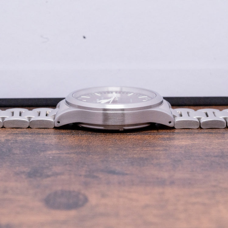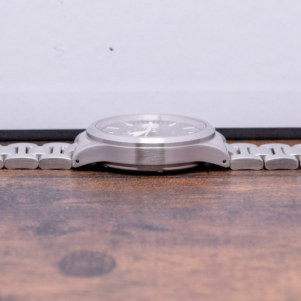 Here we have a 2010s Sinn 556 Brown Japan Limited Edition of 150 556BR, sold exclusively in Isetan department stores in Japan. The 38mm satin brushed stainless steel case gently curves over your wrist with finely tapered drilled lugs, the lug-to-lug length of 45.5mm and a case thickness of 11mm ensure a comfortable fit on your wrist. On the right side, we have a screw-down crown protected with short crown guards. A thin smooth bezel with a bevelled edge holds a flat sapphire crystal AR coated on both sides, the matte brown dial has an outer minute track with Super-LumiNova coated baton indexes marking the hours. Sword's hands are coated with Super-LumiNova complemented by a tapered sweeping second hand. At 12 o’clock we have the Sinn motif, “FRANKFURT AM MAIN” a nod to the city Sinn was founded and at 6 o’clock “Automatic” completes this contemporary designed timepiece. On the reverse, a screw-down sapphire exhibition case back with the details of the watch engraved around its edge, inside an automatic ETA Cal. 2824, 25 jewels, 28,800 beats per hour, the movement has hand winding and hacking for your convenience. The watch comes paired with its Sinn 20mm H-link satin brushed stainless steel bracelet and signed folding clasp and flip-lock, all links are provided plus a brown calf leather strap and signed pin buckle. This watch is sold “Watch Only” and therefore comes without its Sinn box or Sinn paperwork but does come with its bracelet box and spring bar removal tool.