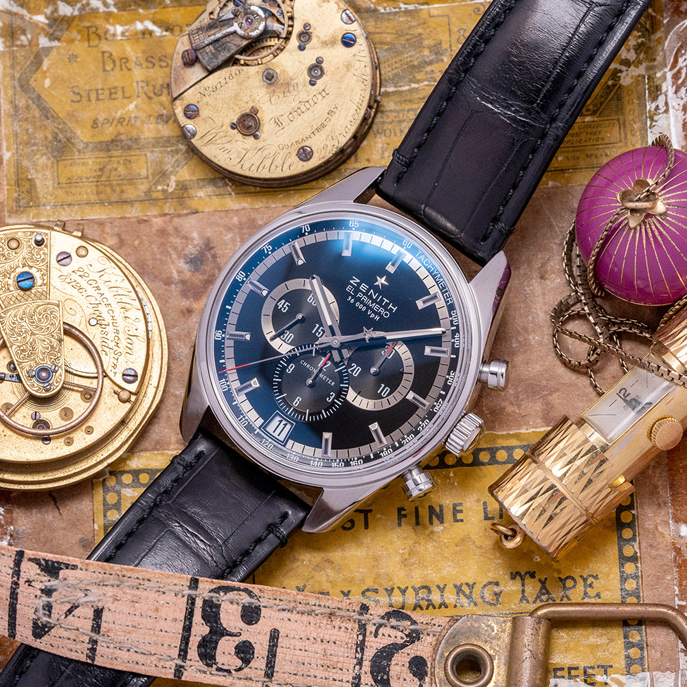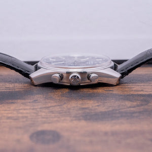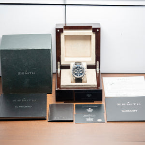 Here we have a 2011 Zenith El Primero Black 03.2040.400/21.C496 with a 42mm curvaceous polished and radial brushed stainless steel case that curves over your wrist with flat-ended tapered lugs, this is a faithful modern interpretation of the Zenith A386 chronograph that was introduced in 1969, and a lug-to-lug length of 50mm and a case thickness of 12.5mm ensure a comfortable fit on your wrist. Polished and brushed surfaces transition with crisp flowing lines; down the right side, we have piston-style chronograph pushers and a signed crown with deep knurling for grip, a smooth polished bezel that holds a domed sapphire crystal above a dynamic black and silver dial. A blue outer Tachymeter scale chapter ring surrounds a silver minute track, precisely executed, and applied polished baton indexes have faceted edges that play with the light as you rotate your wrist. At 3 o'clock, a blue 30-minute counter inside a silver ring; at 6 o'clock, a blue 12-hour counter with white numerals and markings; and finally, at 9 o'clock, a small blue second counter inside a silver ring; at 6 o’clock, a framed date window, slender baton hands infilled with Super LumiNova complemented by white chronograph hand with its signature Zenith star counterweight and red tip, at 12 o'clock we have the Zenith El Primero motif “36 000 VPH” and “Chronometer” inside the 12-hour register completes this striking vintage-inspired chronograph. On the reverse, a screwed-down exhibition case back showcasing the stunning automatic Zenith El Primero Cal. 400, 31 jewels, a high-frequency column-wheel movement beating at 36,000 beats per hour with a skeletonised Zenith star rotor. The watch comes paired with a 21mm black leather strap with a folding signed deployant clasp, and the watch comes with its Zenith presentation box and paperwork.