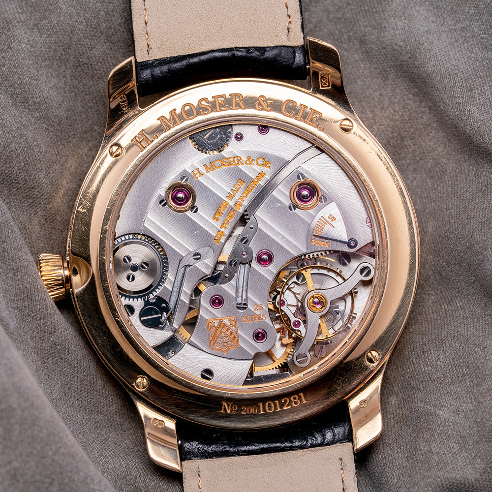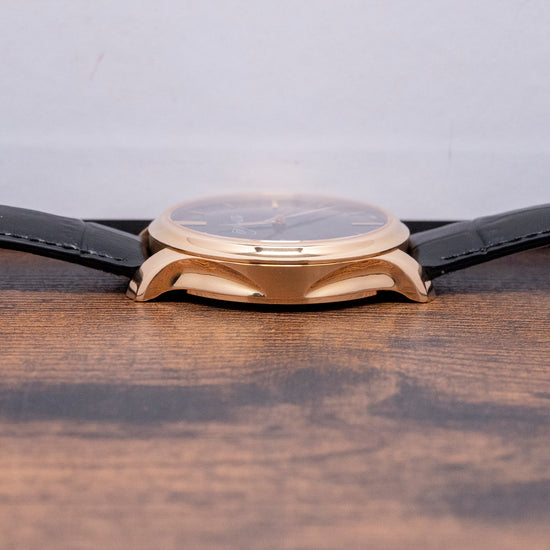 Here we have a stunning 2012 H.Moser & Cie E Rose Gold 7-Days 343.505-017 an early “Monard”, now the Endeavour, with a 41mm 18ct Rose Gold round case that flows over your wrist with elegant tapered concave hallmarked lugs and a lug-to-lug length of 47mm and a case thickness of 11mm ensuring a comfortable fit. Sculpted sides flow effortlessly with a signed crown in the centre on the right side, and a smooth bezel holds a domed sapphire crystal above a deep black dial. Applied single and double 18ct Rose Gold baton indexes mark the hours and play with the light as you rotate your wrist; 18ct Rose Gold leaf hands are complemented by a tapered sweeping second hand; at 12 o’clock, we have the H. Moser & Co motif completing this sophisticated contemporary minimalist dress watch. On the reverse, a screwed-down sapphire exhibition case back, engraved with the details of the watch, showcasing the manually wound HMC Cal. 343.505, 26 jewels, beating at a leisurely 18,000 beats per hour; this beautiful hand-finished movement has an in-house Straumann hairspring, a double hairspring that beats in opposite directions, this reduces any external effects on the escapement, and a 7-day power reserve indicator and the movement is tastefully decorated in Moser double stripes. It comes paired with a well-suited aftermarket 20mm leather strap with its original 18ct Rose Gold pin buckle.