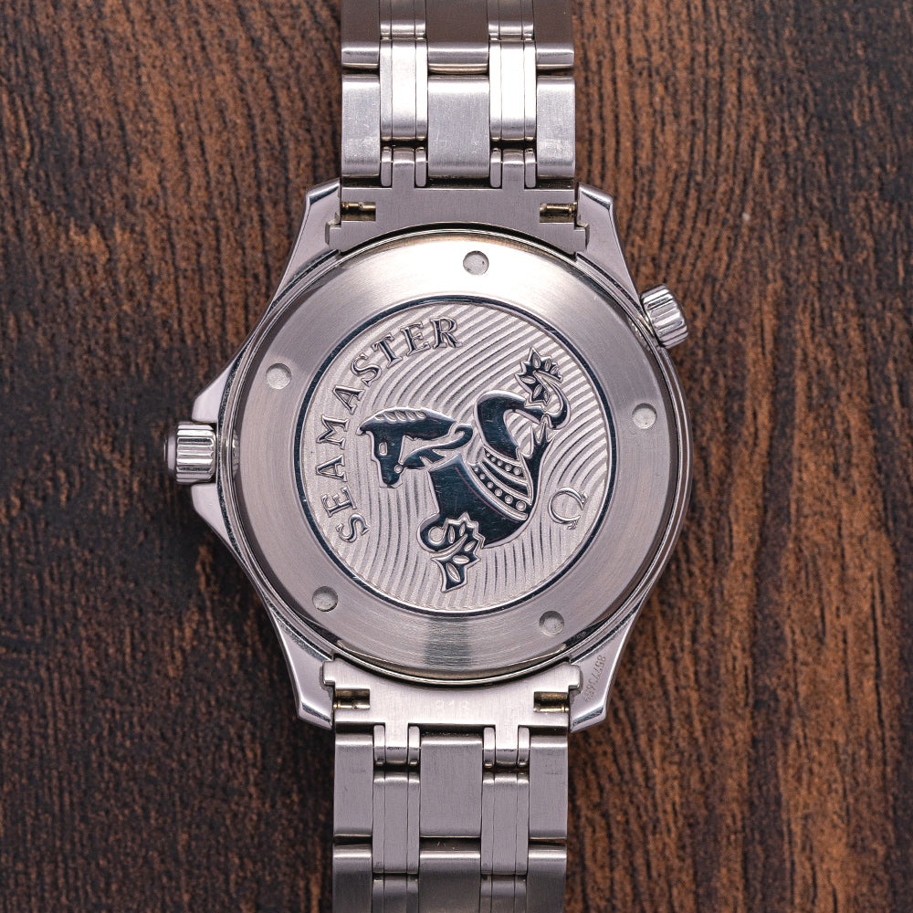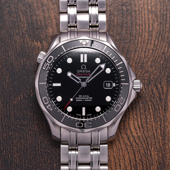 Celebrating Omega’s maritime and dive heritage, in 1957 Omega introduced the 300 Seamaster series created for the professional diver. This modern Seamaster has a 41mm polished stainless steel case that curves over your wrist with twisted lugs, a lug-to-lug length of 47mm and a case thickness of 13mm giving the watch an impressive wrist presence. Manual helium escape valve at the 10 o’clock position. A unidirectional bezel with scalloped sides and a black ceramic insert with dive minutes marked clearly holds a domed AR-coated sapphire crystal. The black dial has applied baton and disc indexes coated in lume marking the hour, and skeletonised hands have lume tips, making low-light visibility impressive, and at 3 o'clock position sits the date window. On the case back we have the embossed Hippocampus along with Seamaster sitting on a deeply engraved wave pattern, inside automatic Omega Co-Axial Cal. 2500, 29 jewels, 25,200 beats per hour, Chronometer Certified. The watch comes fitted on a 20mm Omega highly polished and brushed stainless steel bracelet with a signed deployment clasp including a push-button release and micro-adjustment, for the perfect fit and the watch comes with its Omega presentation box and papers.