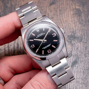 This is a watch that has left a lot of people perplexed as they had no idea Rolex even made such a watch, part of the Oyster Perpetual line in 36mm, this reference 116000 features an "Explorer" dial with pink for the numerals and indices! A beautiful play on a simple watch which makes you take a second glance. I would not hesitate to add this wonderful example to your collection.