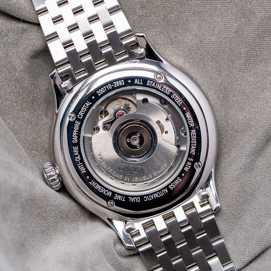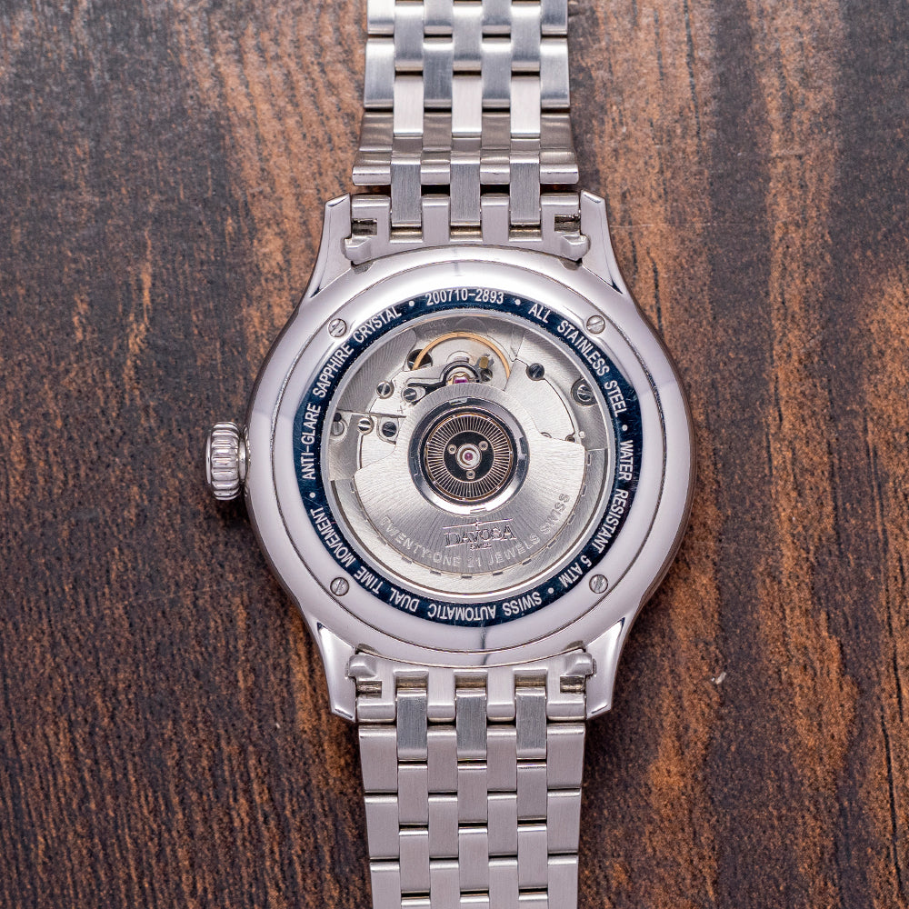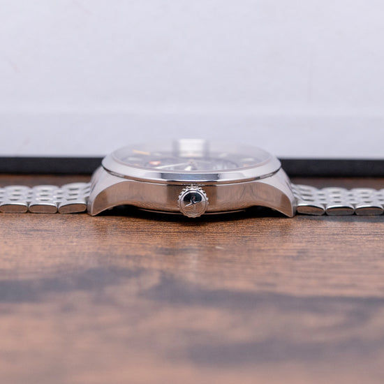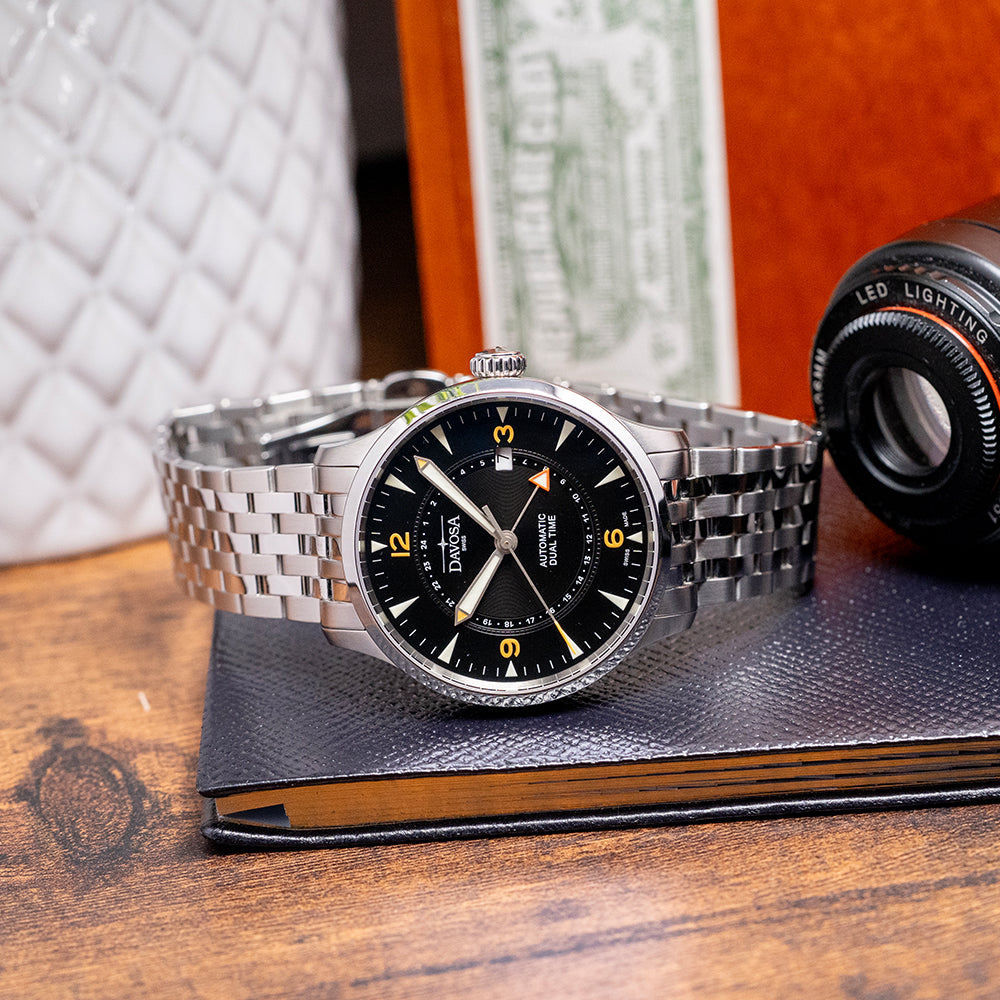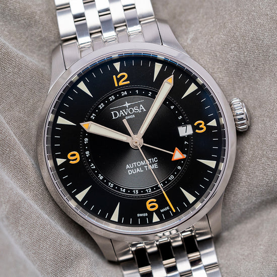 Here we have a curvaceous 2013 DAVOSA Vigo Dual Time Auto on a Bracelet 16147554, featuring a polished and brushed stainless steel round case that curves over our wrist, thanks to the rounded, tapered lugs. Its polished flanks lead to a lug-to-lug length of 46.5mm and a case thickness of 11mm, ensuring a comfortable fit on your wrist. On the right side, a deeply knurled signed push/pull crown. Its polished, smooth bezel holds a slightly domed sapphire crystal AR-coated above a striking matte black dial. An outer minute track features lume-coated spear indexes surrounding bright, day-glow orange Arabic 12, 3, 6, and 9 numerals, marking the hours. An inner 24-hour chapter ring surrounds the orange-tipped bi-luminous sword hands, which are complemented by an orange-tipped sweeping second hand and a red arrow-tipped GMT hand, at 3 o’clock, a date window. The Davosa motif sits at noon and at 6 o’clock, ‘Automatic Dual Time’ completes this dynamic traveller companion. On the reverse, a screw-down exhibition case back is engraved with the details of the watch around its edge. Inside, an automatic ETA 2893-2 movement, featuring 21 jewels, beats at 28,800 beats per hour. This high-quality movement offers hand-winding, hacking seconds, and an adjustable GMT hand at position 2 of the crown. It comes paired with its 20mm leather strap and signed pin buckle, plus a 20mm Davosa 7-link polished and brushed stainless steel bracelet secured concealed butterfly clasp. This watch is sold with its original Davosa presentation box and paperwork.