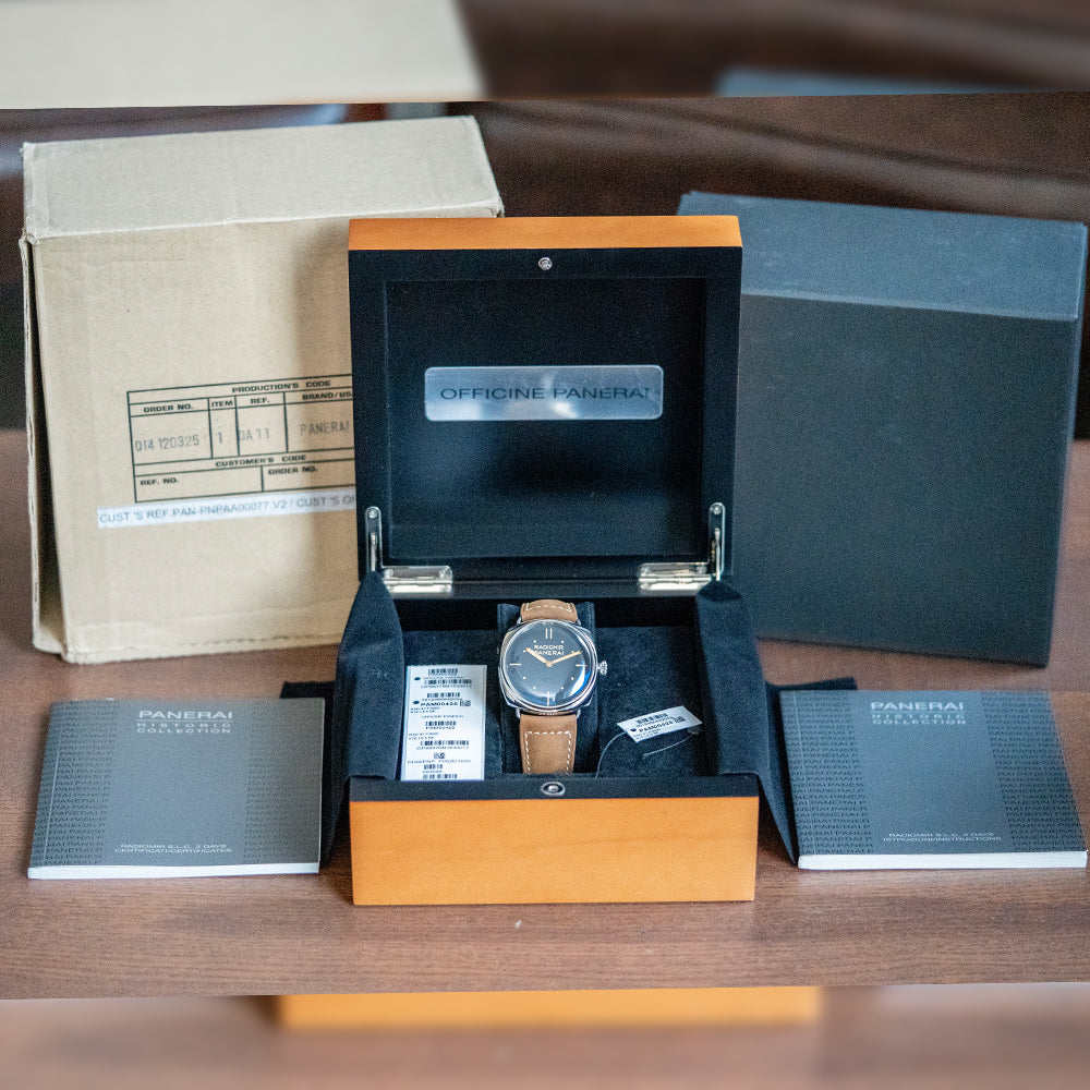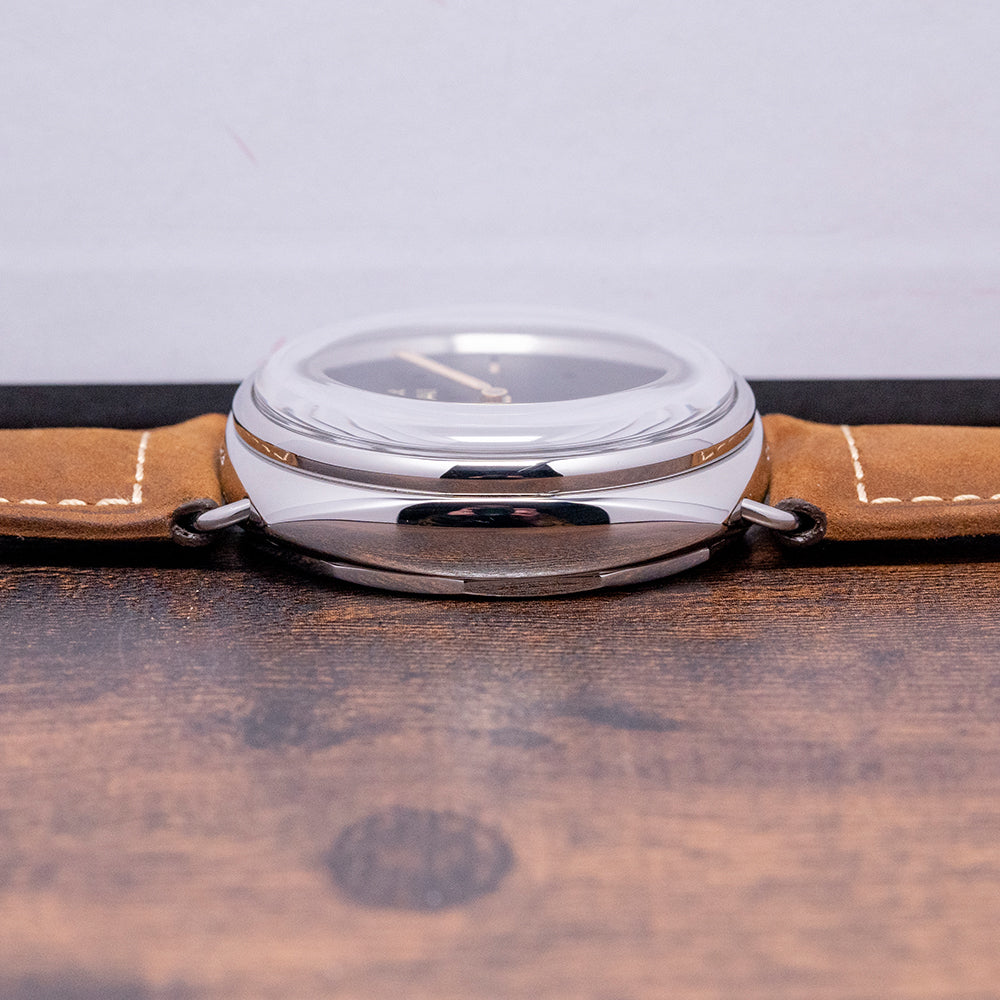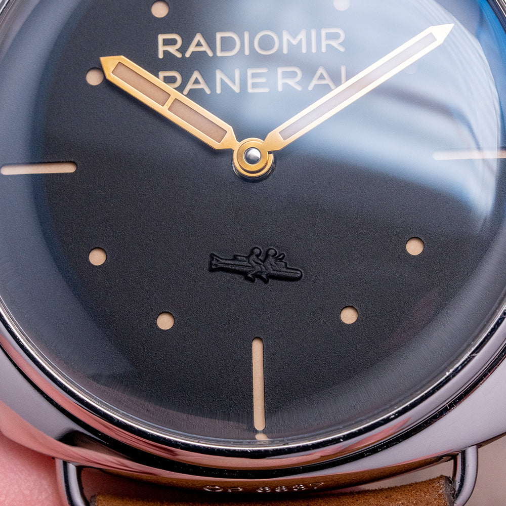 The PAM425 was released around 2013 and emphasises the strong historical connection between Rolex and Panerai and is based on a 1936 Rolex-built prototype, heavily modified by Panerai, becoming the Panerai 3646. Italy’s Decima Flottiglia MAS commandos were issued with them during World War Two. Our Panerai Radiomir S.L.C. 3 Days PAM425 47mm has a distinctive 316L stainless steel cushion case in high polish; the fixed screw-in lugs make strap changing a breeze. A polished bevelled bezel holds the double dome sapphire crystal, its sandwich dial is made up of a tinted lume lower plate and a black (factory-aged brown) upper plate, and the baton and dot hour markers are cut out, allowing the tinted lume to show through and give it an authentic vintage look. At 12 o'clock, the text Radiomir Panerai is cut out, showing through the tinted lume. The rose gold fence hands are filled with the same lume. At 6 o'clock, it features a silhouette of the Panerai Blackseal icon in bas-relief in recognition of the commandos onboard the attack torpedo boat “Siluro a Lenta Corsa” which in 1941 took out three Royal Navy warships. An open case-back allows us to see in full glory the in-house Panerai hand wound Cal. P3000, 21 jewels, 21,600 beats per hour, 3-day power reserve, Glucydur balance, Incabloc anti-shock, and made up of only 161 components. t is paired with a new Panerai thick 27mm leather and a new original Panerai signed buckle, both correct to how the reference was originally sold, and comes with its Panerai presentation box, swing tag and paperwork.