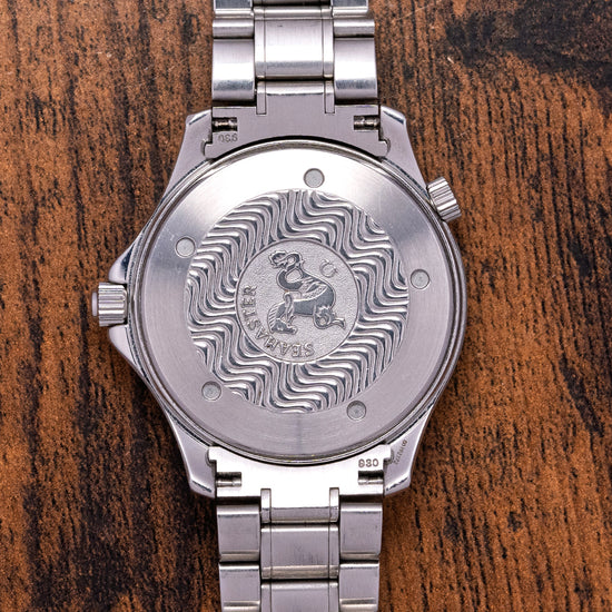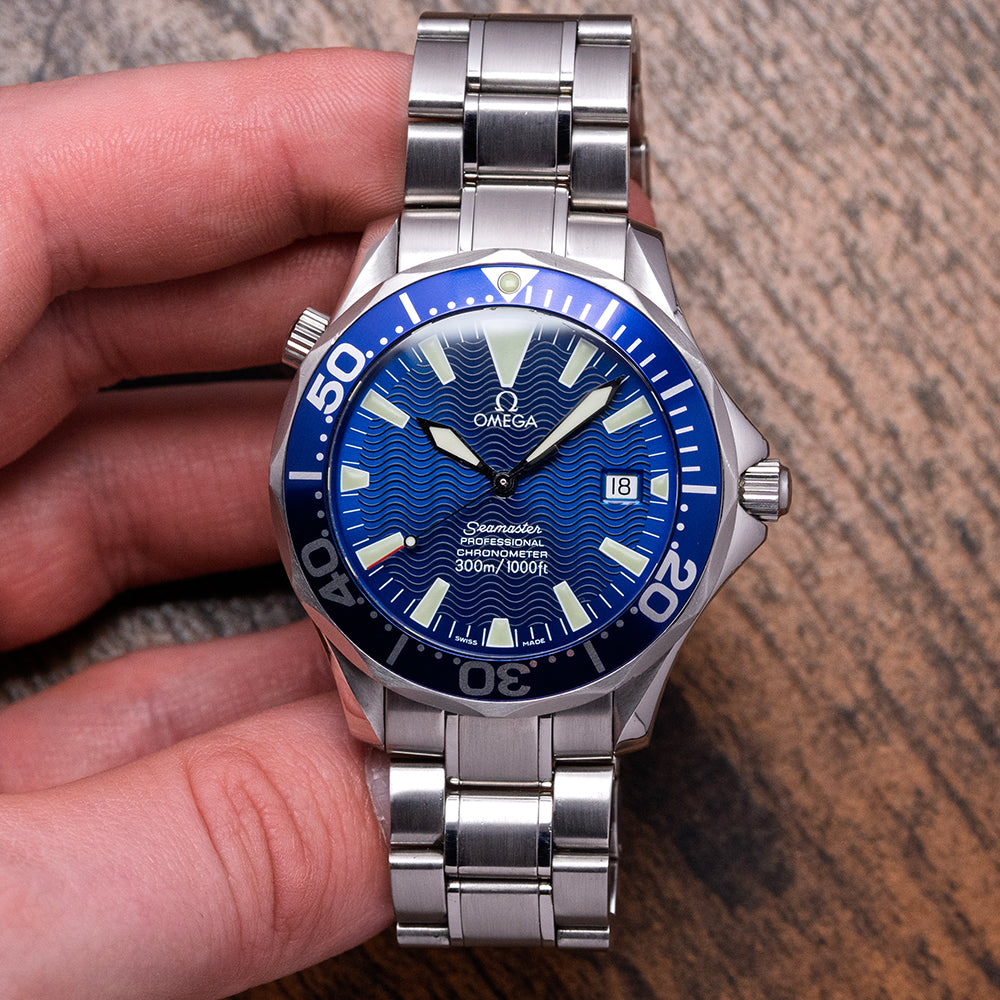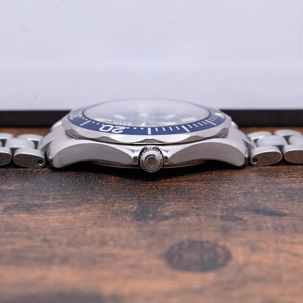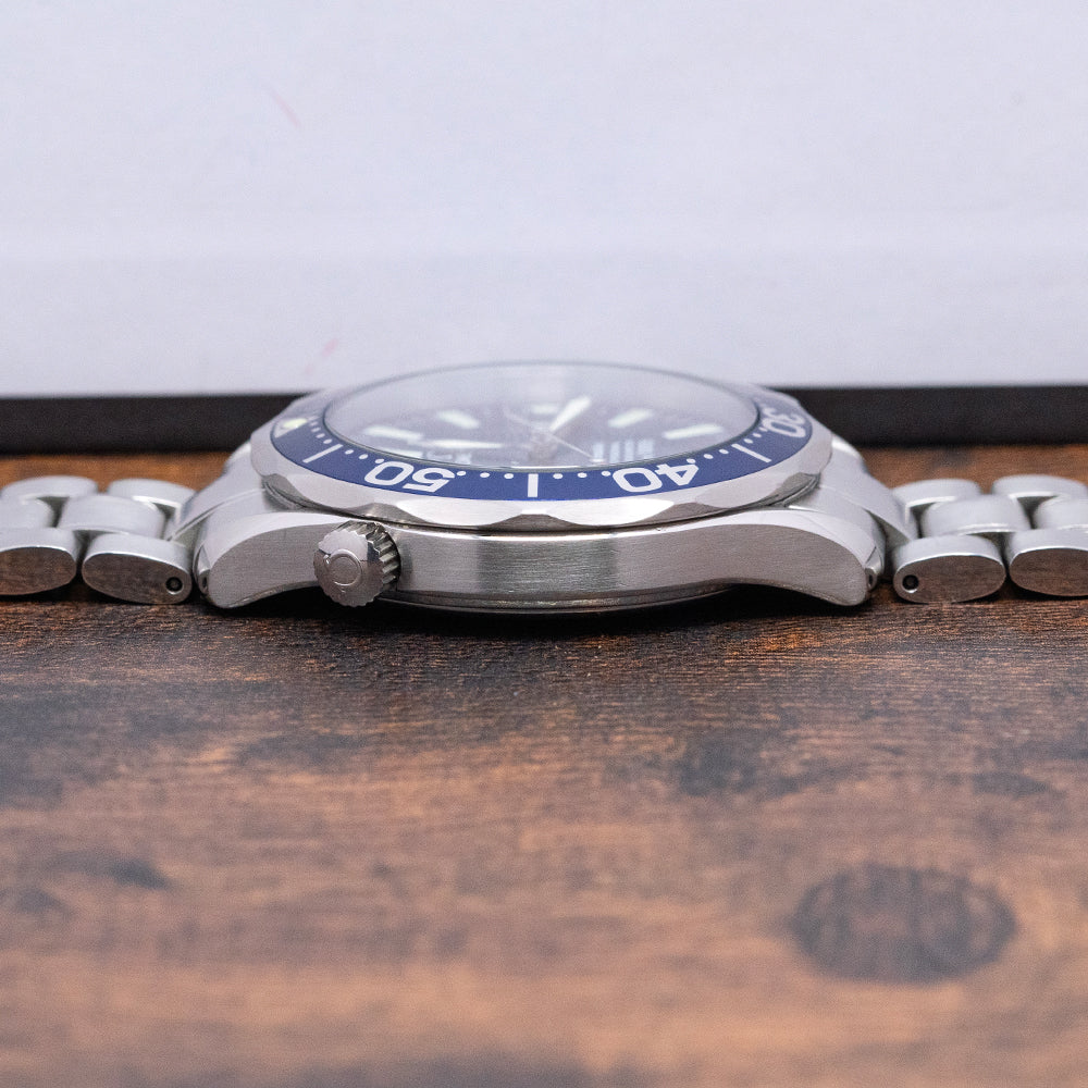Here we have a 2014 Omega Seamaster 300M Automatic Electric Blue 2255.80 with a 41mm polished and brushed stainless steel case, twisted lugs with a lug-to-lug length of 47mm and a case thickness of 11.5mm, giving the watch an impressive wrist presence. On the right side is a signed screw-down crown protected by crown guards, and at 10 o’clock on the left side, a helium escape valve. The unidirectional bezel has scalloped sides for extra grip and is fitted with a matching blue aftermarket bezel, the original polished steel bezel is in the box. Sapphire crystal sits above an electric blue dial with a dynamic wavy pattern, and an outer minute track has large indexes coated in luminance marking the hours. At 3 o’clock, a date window and characteristic sword hands are lume-filled and complemented by a red-tipped lollipop sweeping second-hand; at 12 o’clock, we have the Omega motif and at 6 o’clock “Seamaster Professional Chronometer 300m/1000ft'' is printed underneath. On the reverse, a screw-down case back with engraved waves and a polished Hippocampus in the centre, a seahorse that represents Neptune, the God of the sea; Pierre Borie conceived it after seeing a picture of Neptune riding a chariot pulled by seahorses, it is the reason why the seahorses are wearing a bridle, first seen on the Seamaster in 1958. Inside an automatic Omega Cal. 1120, 23 jewels, 28,800 beats per hour. This movement is based on the ETA 2892-A2; the movement has hacking seconds, and a quick-set date for your convenience. The watch comes paired with its 20mm Omega stainless steel brushed and polished bracelet and an upgraded signed push button-released folding clasp and it comes with an Omega presentation box and Omega paperwork.