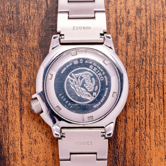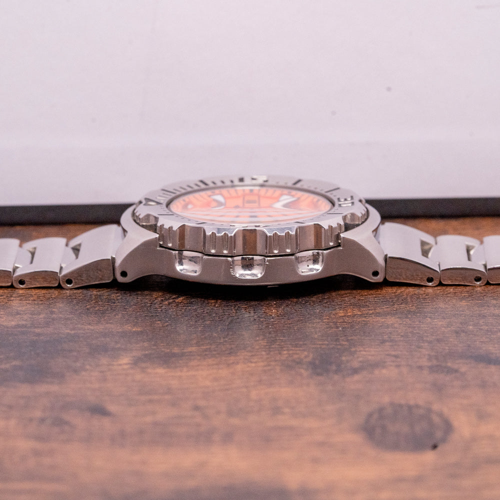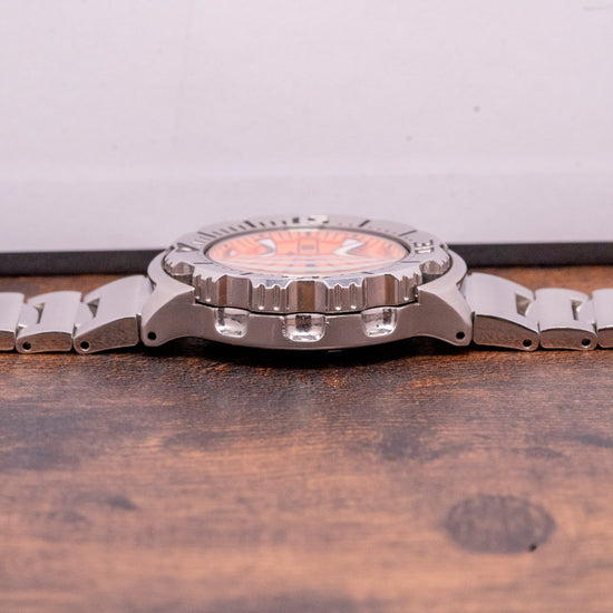 Here we have a 2014 Seiko Orange Monster 2nd Gen SRP309 heritage that can be traced back to the earliest Seiko divers, such as the coveted 62MAS. First launched in 1996, it attained ISO 6425 Certification for diving with a 200m water resistance, and this second generation was launched in 2012. The curvaceous 42.5mm stainless steel case has a lug-to-lug length of 47.5mm and a case thickness of 12.5mm, giving the watch an impressive wrist presence. The flowing sides are brushed with the lug tops expertly brushed. The bezel is unidirectional with a satisfying click, and the bezel has a triangle with a lume pip sitting at 12 o’clock, batons, and deeply engraved numerals indicating the minutes, nicely painted in black in contrast to the steel bezel. The large knurled, surfaced screw-down unsigned crown at 4 o’clock is protected by guards. Seiko’s flat Hardlex crystal protects a striking orange dial; shark tooth-shaped indexes indicate the hours painted in LumiBrite luminescence for a bright luminance. The hands are both sword and arrow, again coated in the same LumiBrite. Its second hand has a lumed arrow point counterbalance. A day date sits at 3 o’clock, black with white numerals, making reading the date a breeze. On the back, we have the screw-down case back with the Seiko Tsunami wave embossed on it, inside is the automatic Seiko Cal. 4R36 with hand winding and hacking functionality, 24 jewels and 21,600 beats per hour. The watch comes fitted on its Seiko 20mm Stainless steel bracelet with its signed folding clasp; all links are provided, and it comes with a Seiko presentation box and unsigned papers.