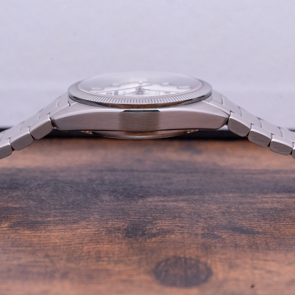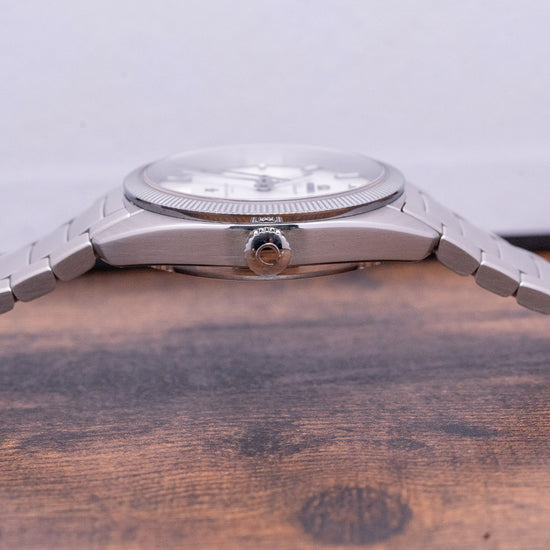 Here, we have a 2015/17 Omega Globemaster Master 39mm 130.30.39.21.02.001, introduced at the 2015 Baselworld, an updated contemporary design inspired by the classic 1952 “Pie Pan” Constellation Globemaster collection released for the USA market; this is the world's first Master Chronometer. The 39mm tonneau-shaped stainless steel case sits comfortably on your wrist with tapered lugs, polished chamfer edges transition with crisp lines, leading the eyes towards a lug-to-lug length of 46.5mm and a case thickness of 12.5mm. On the right side is a signed crown. An attractive Tungsten Carbide fluted bezel holds a domed sapphire crystal AR coated on both sides above a stunning sunburst opaline silver pie-pan dial, in keeping with its vintage aesthetic. An outer minute track surrounds applied baton indexes filled with Super-LumiNova, marking the hours; at 6 o’clock, a date window, elegant slender sword hands filled with the same lume are complemented by a tapered sweeping second hand; at noon, you find an applied Omega motif “Globemaster” printed underneath and at 6 o’clock “Co-Axial Master Chronometer” and the characteristic Rhodium Constellation “Star.” On the reverse, an exhibition screwed-down case back, inside an automatic Omega Co-Axial Cal. 8900, 39 jewels, 25,200 beats per hour, beautifully decorated in Côtes de Genève, Omega uses modern materials to achieve accuracy and reliability, such as twin barrels, a silicon hairspring and a free-sprung balance wheel, resistant to magnetic fields reaching 15,000 gausses, the Rotor has the Eight Star Observatory in the centre and is bidirectional for improved efficiency. Certified Master Chronometer, approved by METAS, ”Swiss National Metrology Institute'', the watch goes through COSC certification before being selected for the eight tests run by METAS. The watch comes paired with its original Omega 20mm brushed stainless steel bracelet with an Omega-signed push-button butterfly clasp, and the watch also comes with its original Omega presentation box.