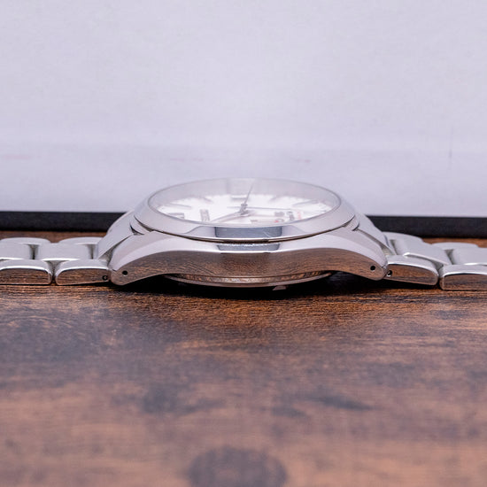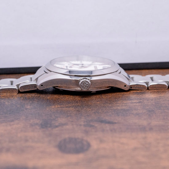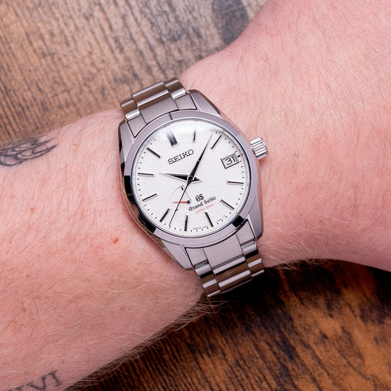Here we have a 2015 Grand Seiko Spring Drive AJHH "Redflake" Limited SBGA129, a limited edition of 369 pieces to celebrate the 10th anniversary of the Association Japan de la Haute Horlogerie (AJHH). The impressively sculptured 39mm stainless steel case, created by craftsmen and women inspired by the mountainous region outside the window of their Shinshu Watch Studio, expertly brushed and Zaratsu polishing provides razor-sharp defined edges that curve over your wrist towards the tapered drilled lugs with a lug-to-lug of 46mm and a case thickness of 12.5mm giving the watch an impressive wrist presence. On the right side is a screw-down signed crown sitting slightly recessed, and a smooth bezel holds a flat sapphire crystal above a stunning white dial with a “Snowflake” textured pattern that resembles freshly drifted snow. Zaratsu polished facet-edged baton indexes mark the hours, and at 3 o’clock, a framed colour-matched date window. Elegant dauphine hands are Zaratsu polished with razor edges complemented by a tapered sweeping second hand and, between the 7 and 8, a power reserve with a red indicator. At 12 o’clock, an applied “Seiko”; at 6 o’clock, an applied “GS” “Grand Seiko” and a red “Spring Drive” complete this striking, sophisticated dial. On the reverse is a screwed-down exhibition case with the details Limited by (AJHH) Association Japan de la Haute Horlogerie. Inside a Spring Drive Grand Seiko Cal. 9R65, the innovative Spring Drive movement is mechanical but with an electromagnetic escapement regulated by a quartz oscillator. It has 30 jewels and a power reserve of an impressive 72 hours; its sole power source is a mainspring that drives a series of gears. A rotor connected to the end of these gears then generates a small electrical charge that activates an electronic circuit and quartz oscillator; therefore, there is no need for a battery. Expertly decorated to showcase the Côtes de Genève. It comes paired with its original Grand Seiko 19mm 3-link stainless steel bracelet and signed push button folding clasp with a polished and brushed finish. It comes with its Grand Seiko presentation box and papers.