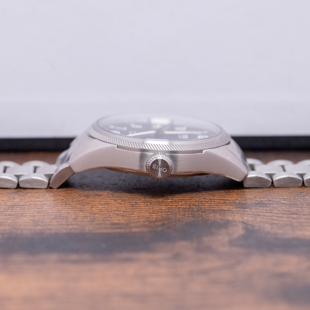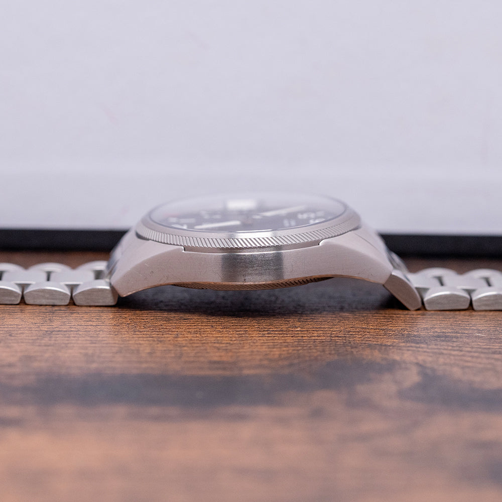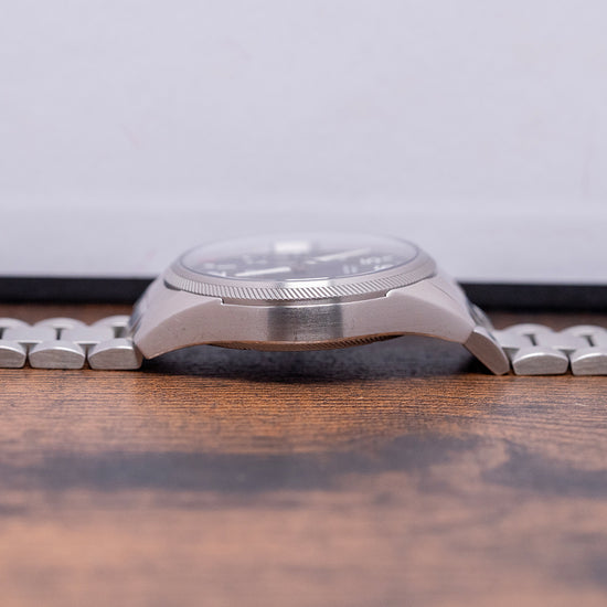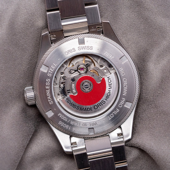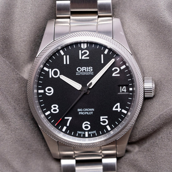 Here we have a 2015 Oris Big Crown ProPilot Big Date featuring a curvaceous 41mm brushed stainless steel case that curves over your wrist with tapered lugs, and a lug-to-lug length of 49mm and a case thickness of 12mm ensures a comfortable fit. On the right side is the large signed crown that sits slightly recessed into the case, a brushed coin-edge, inspired by the blades of a turbine jet bezel, holds a domed sapphire crystal AR-coated on the inside above a matte black dial. An outer minute chapter ring is precisely executed with lume batons surrounding large raised Arabic numerals in white, marking the hours, creating depth and interest to the dial, at 3 o’clock, a colour-matched Big date window. Slender sword hands are complemented by a red-tipped, tapered, sweeping second hand. At noon, we have the Oris motif, “Automatic” printed underneath and at 6 o’clock, “Big Crown ProPilot”. On the reverse, a screw-down exhibition case back, inside an automatic Oris Cal. 751, 26 jewels, beating at 28,800 beats per hour, based on the Sellita SW220-1, with the characteristic red rotor. It comes paired with an Oris 20mm stainless steel bracelet with a signed folding clasp. This watch is sold with its original Oris box, swing tag, travel case and Oris paperwork.