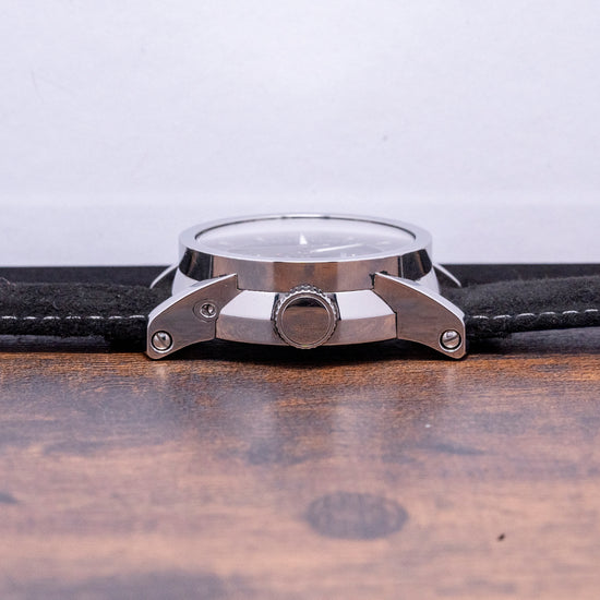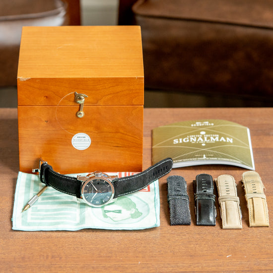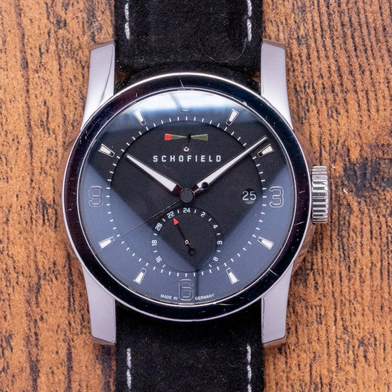 This watch is sold with its original Schofield box, cloth, spring bar removal tool, and paperwork. It is paired with five 24mm Schofield straps, the one paired on the watch is new and unworn, and the remaining 4 are used. The watch is from April 2015 and is worn, as you can see, and has come back from a polish with Schofield. It comes with our 12-Month NON-Waterproof Warranty.