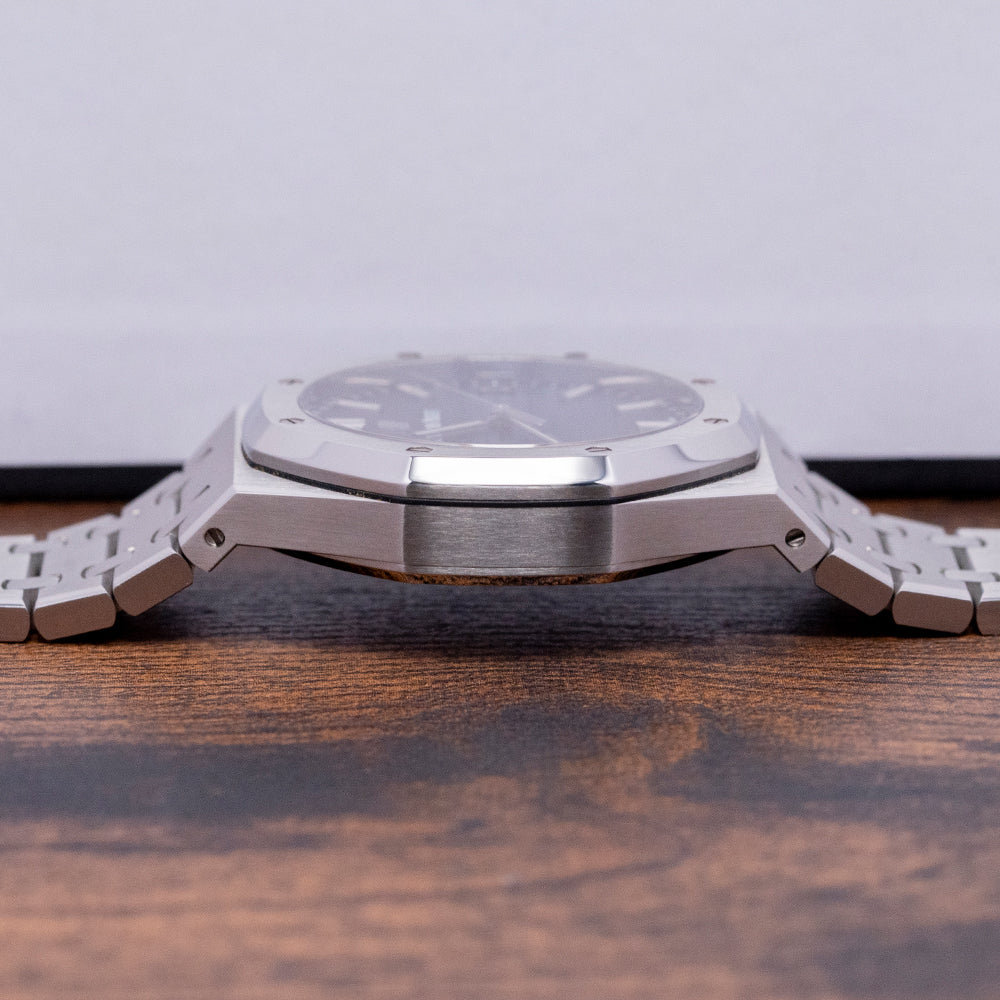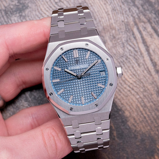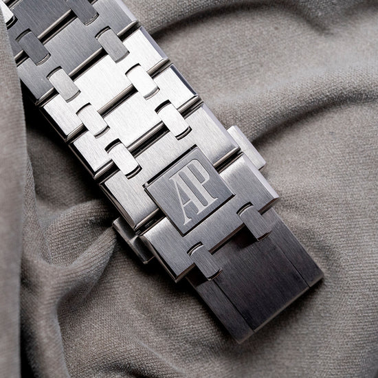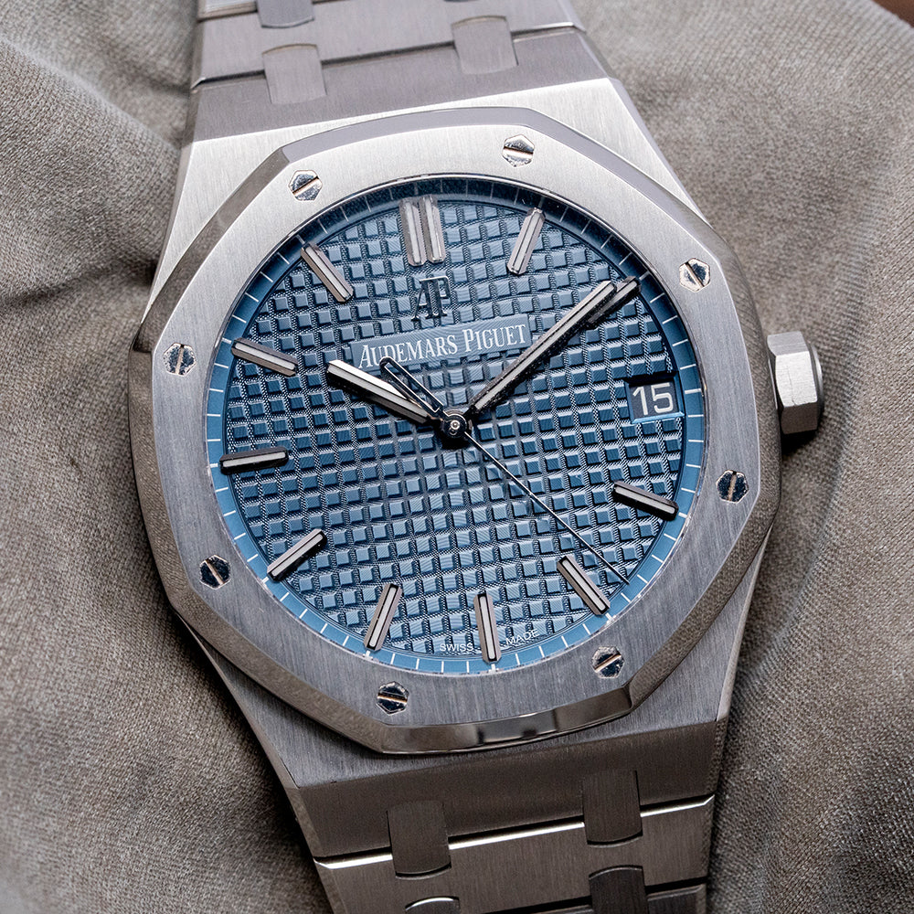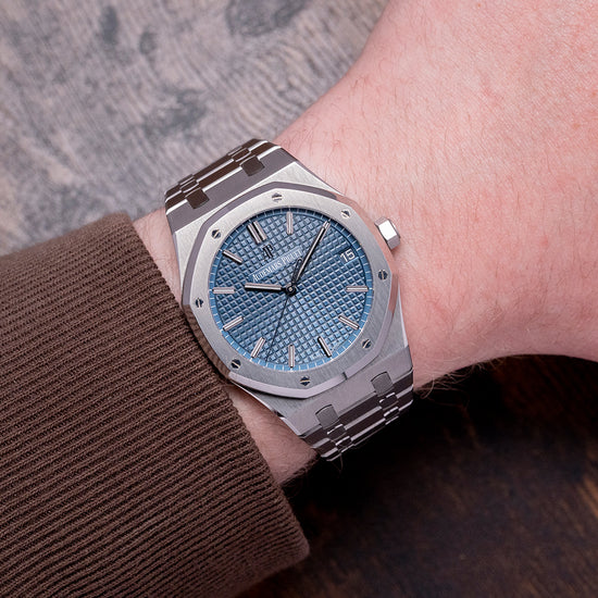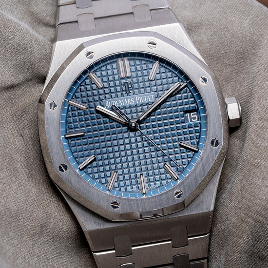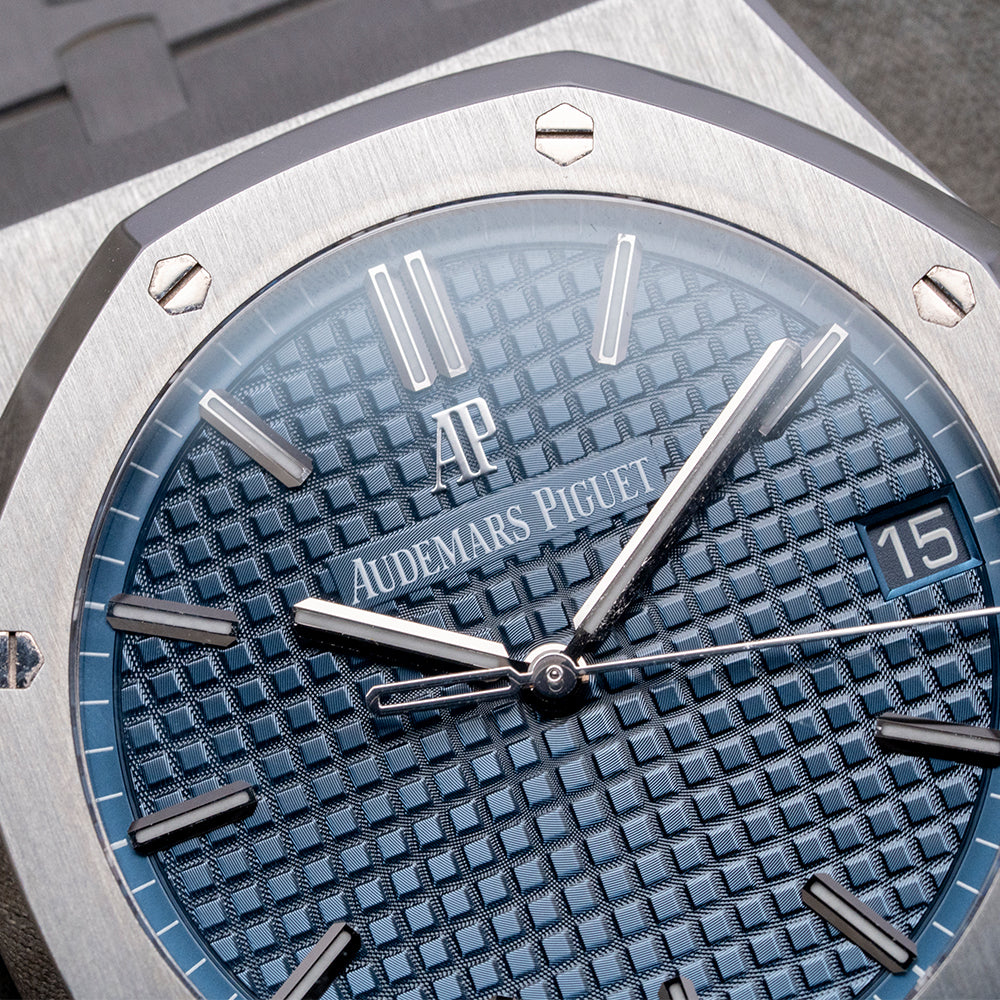 Here we have the iconic 2016/17 Audemars Piguet Royal Oak 41mm Blue Dial 15500ST, designed by Gerald Genta in 1971 the original Ref 5402A design is inspired by a commercial divers scuba helmet; he got the name Royal Oak from a series of eight ships of the Royal Navy that took their naming convention from the hollowed oak tree that King Charles 2nd hid whilst escaping the roundheads who were supporters of the English parliament during the English civil war 1642-1651. The 15500ST was launched in 2019 and remained in production until 2022; its distinctive 41mm tonneau-shaped brushed and polished stainless steel case flows over your wrist with angular sloped screwed lugs that perfectly encompass the integrated bracelet, the polished chamfer-edge leads the eye to a lug-to-lug length of 50mm and a case thickness of 10mm ensure a comfortable fit on your wrist. On the right side, the characteristic hexagonal crown, the polished and brushed octagonal bezel, has screw detailing reminiscent of a commercial divers helmet holding a flat sapphire crystal above a blue Grande Tapisserie (waffle) dial. An outer minute chapter ring surrounds applied multi-facet baton indexes filled with Super-LumiNova to mark the hours; at 3 o’clock, a date window, slender baton steel baton hands sit majestically in the centre complemented by a tapered sweeping second hand. At 12 o’clock, we have the Audemars Piguet motif complete this iconic, versatile luxury sports watch. On the reverse, a screwed-down case back with “Royal Oak” engraved at the top, inside an Automatic Audemars Piguet Cal. 4302, 32 jewels, beating at 28,800 beats per hour. It comes paired with its AP 25.5mm brushed and polished integrated brushed steel bracelet with a signed hidden clasp, and the watch comes with an Audemars Piguet presentation box and paperwork.