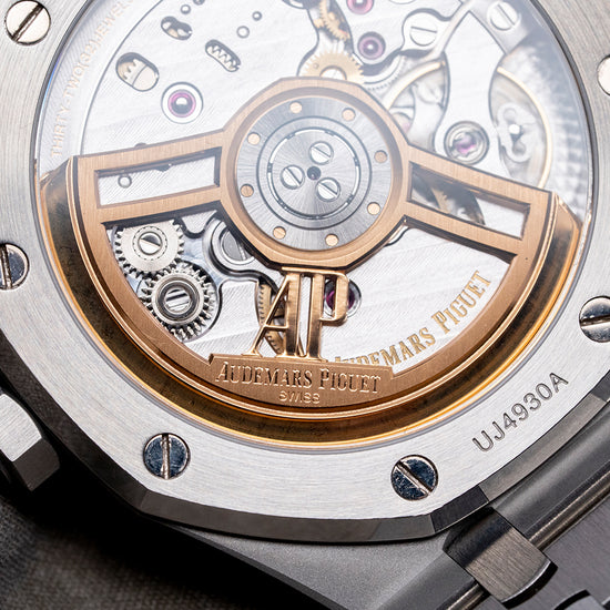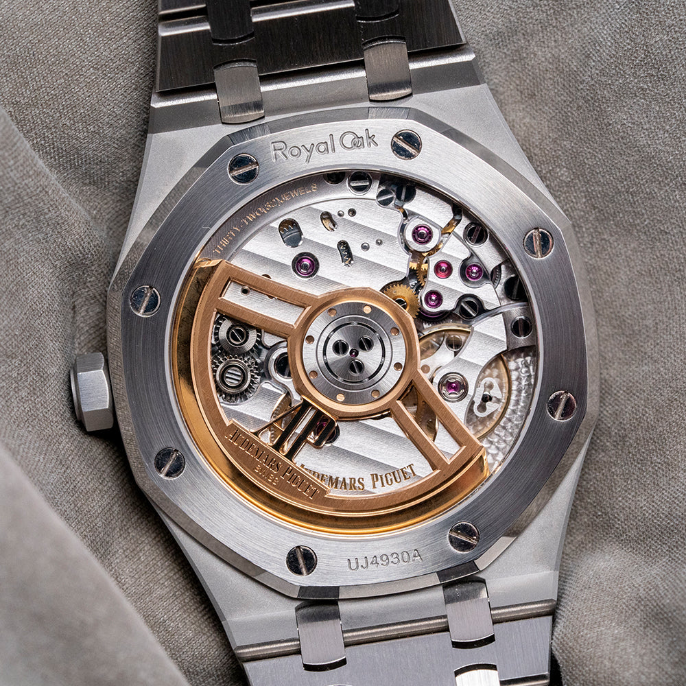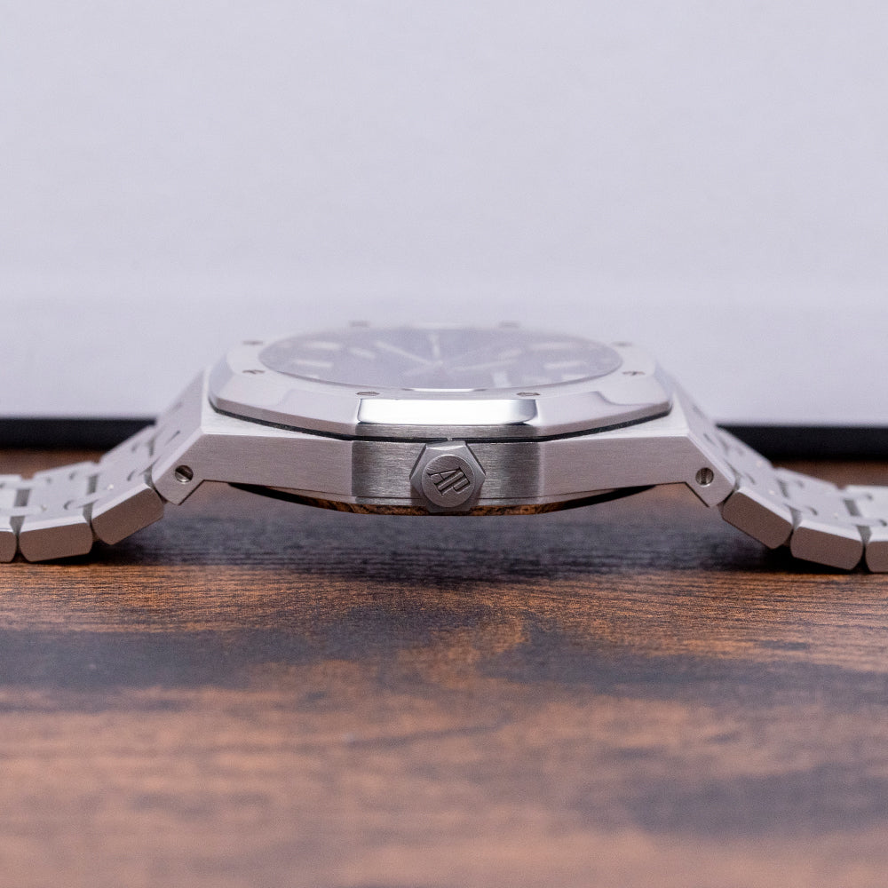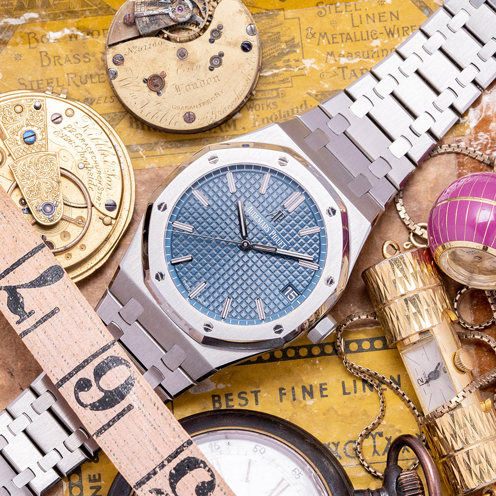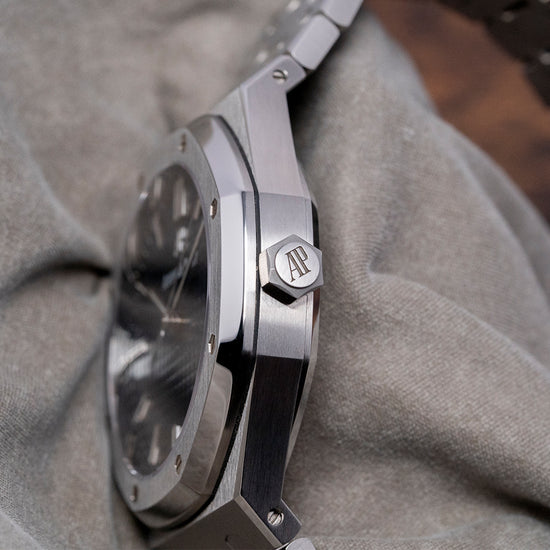 Here we have the iconic 2016/17 Audemars Piguet Royal Oak 41mm Blue Dial 15500ST, designed by Gerald Genta in 1971 the original Ref 5402A design is inspired by a commercial divers scuba helmet; he got the name Royal Oak from a series of eight ships of the Royal Navy that took their naming convention from the hollowed oak tree that King Charles 2nd hid whilst escaping the roundheads who were supporters of the English parliament during the English civil war 1642-1651. The 15500ST was launched in 2019 and remained in production until 2022; its distinctive 41mm tonneau-shaped brushed and polished stainless steel case flows over your wrist with angular sloped screwed lugs that perfectly encompass the integrated bracelet, the polished chamfer-edge leads the eye to a lug-to-lug length of 50mm and a case thickness of 10mm ensure a comfortable fit on your wrist. On the right side, the characteristic hexagonal crown, the polished and brushed octagonal bezel, has screw detailing reminiscent of a commercial divers helmet holding a flat sapphire crystal above a blue Grande Tapisserie (waffle) dial. An outer minute chapter ring surrounds applied multi-facet baton indexes filled with Super-LumiNova to mark the hours; at 3 o’clock, a date window, slender baton steel baton hands sit majestically in the centre complemented by a tapered sweeping second hand. At 12 o’clock, we have the Audemars Piguet motif complete this iconic, versatile luxury sports watch. On the reverse, a screwed-down case back with “Royal Oak” engraved at the top, inside an Automatic Audemars Piguet Cal. 4302, 32 jewels, beating at 28,800 beats per hour. It comes paired with its AP 25.5mm brushed and polished integrated brushed steel bracelet with a signed hidden clasp, and the watch comes with an Audemars Piguet presentation box and paperwork.