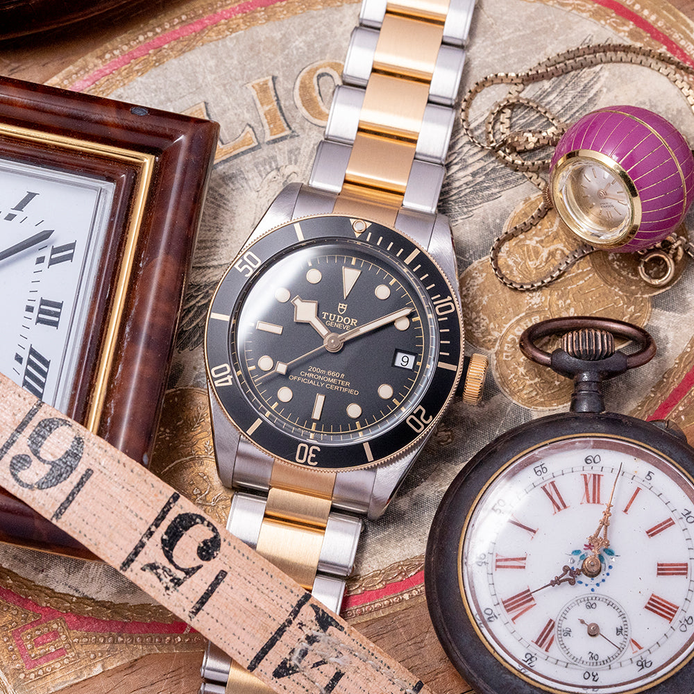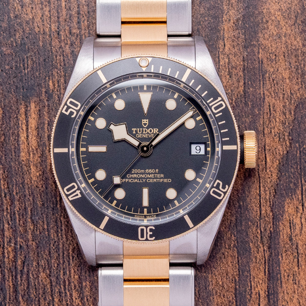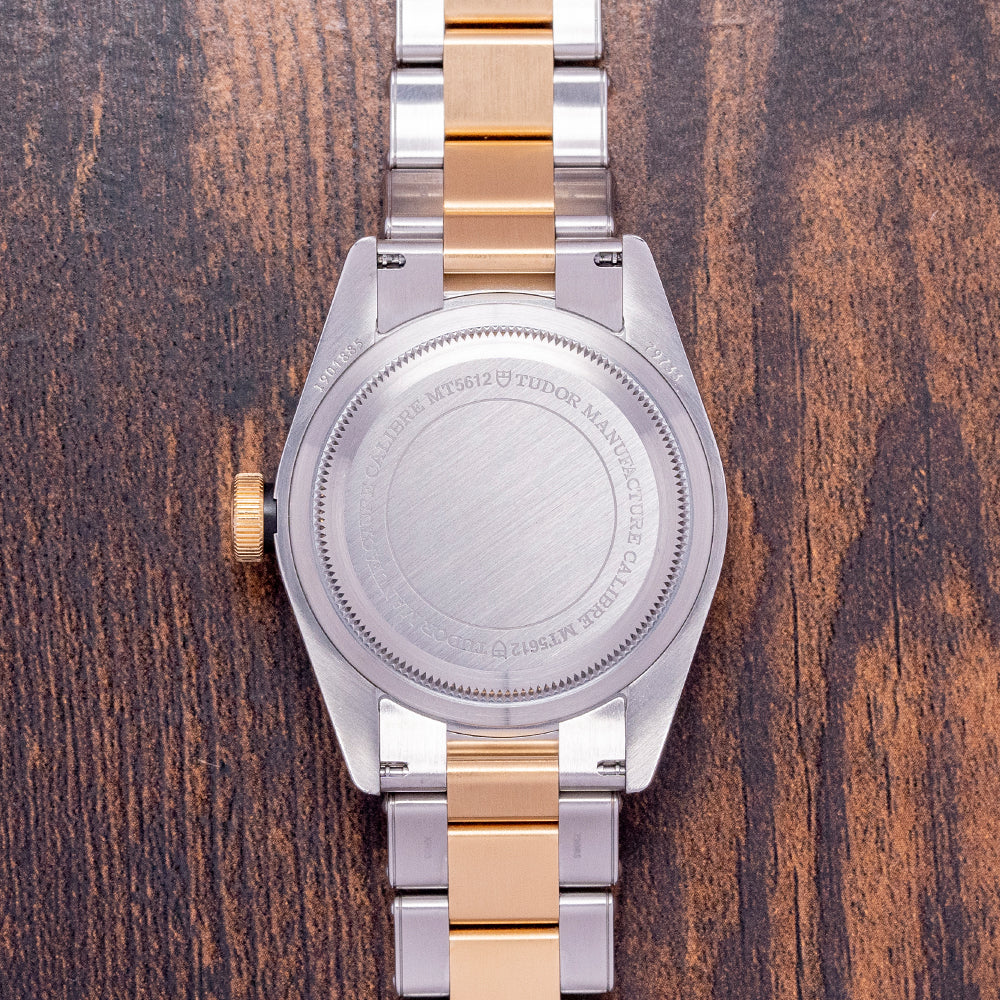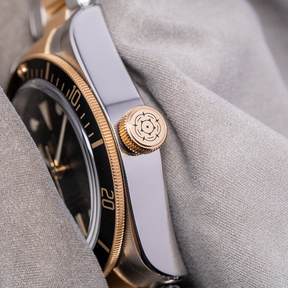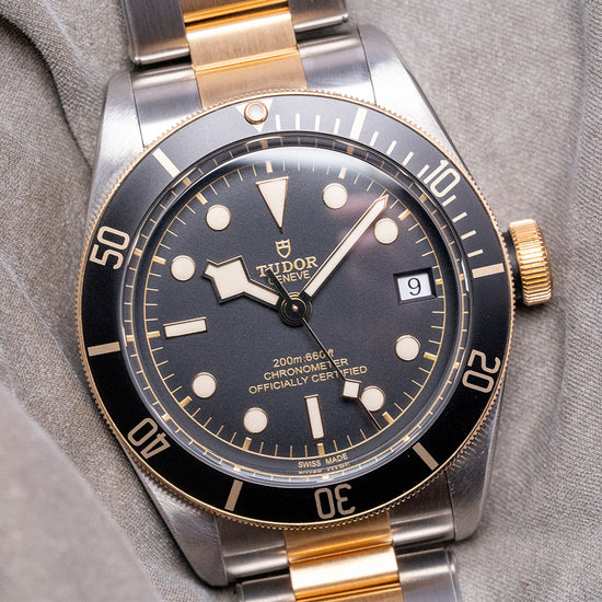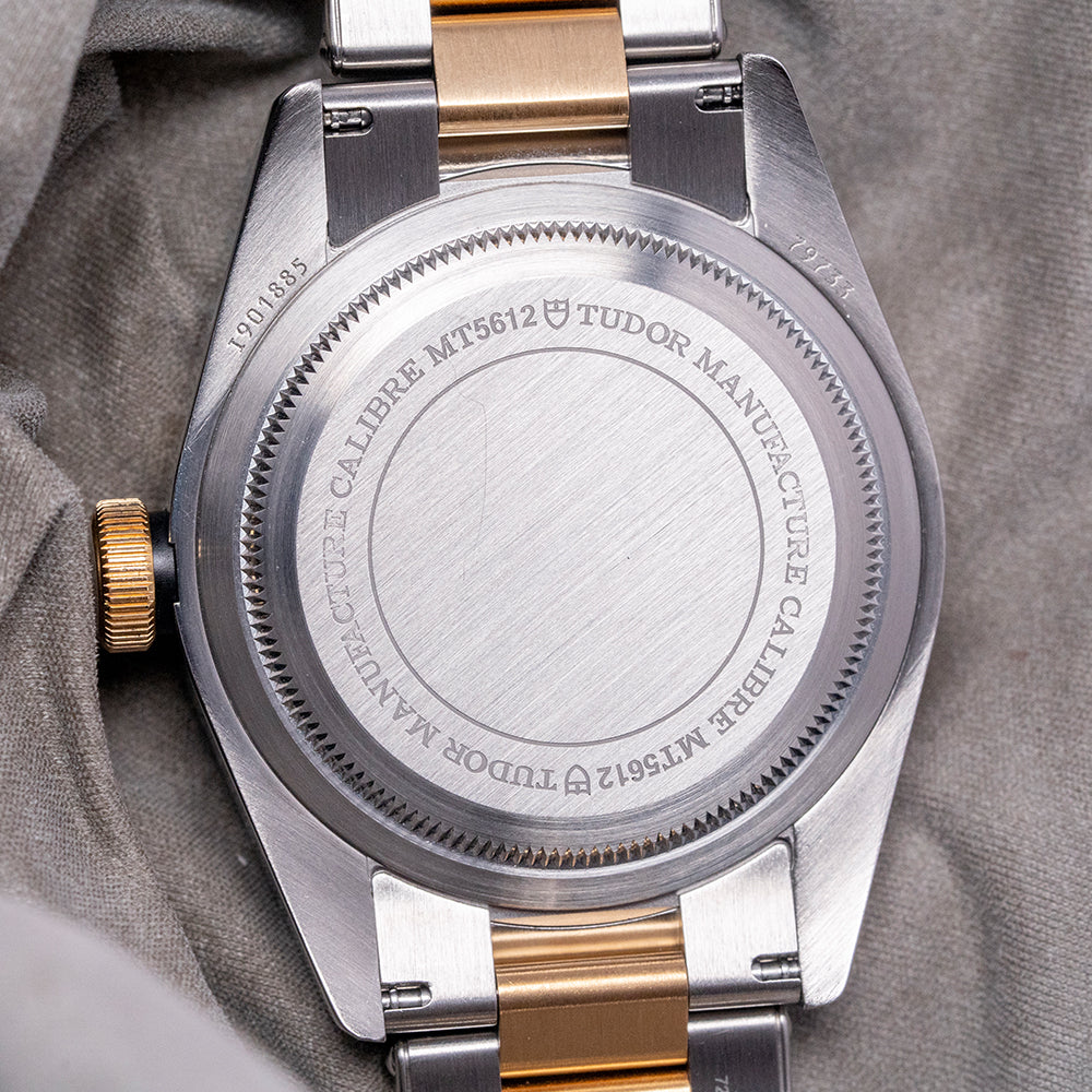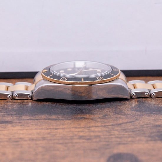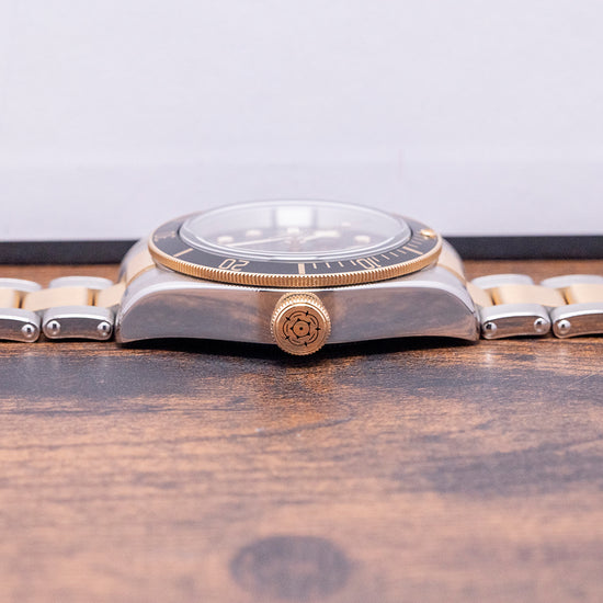 Here we have a 2016/17 Tudor Black Bay Steel & Gold Black 79733N on a Bracelet. A curvaceous 41mm stainless steel and Yellow Gold case curves over your wrist thanks to the tapered lugs. Its polished and satin-finished flanks lead to a lug-to-lug length of 50mm and a case thickness of 14mm, giving the watch an impressive wrist presence; on the right side is a screw-down signed 0.3mm Yellow Gold cap crown and a black anodised aluminium tube, a 0.3mm Yellow Gold cap covers the bidirectional stainless steel bezel and has a black anodised aluminium dive insert with gold numerals and markings, holding a domed sapphire crystal above a matte black dial, a gold outer minute track surrounds applied disc and baton indexes mark the hours, at 3 o’clock a date window, Yellow Gold outlined Snowflake hands filled with Super-LumiNova are complimented with a Snowflake sweeping second hand. On the reverse, a screw-down coin-edged case back, inside we have the automatic Tudor Cal. MT5612, in-house COSC Certified 26 jewels, 28,800 beats per hour with hacking seconds, silicon balance spring and a bi-directional rotor. The watch comes paired with its original 22mm Faux Rivet Oyster stainless steel and 0.2mm 18ct Yellow Gold cap centre link, with its Tudor signed clasp and fliplock, all links included, and the watch also comes with its original Tudor presentation box.