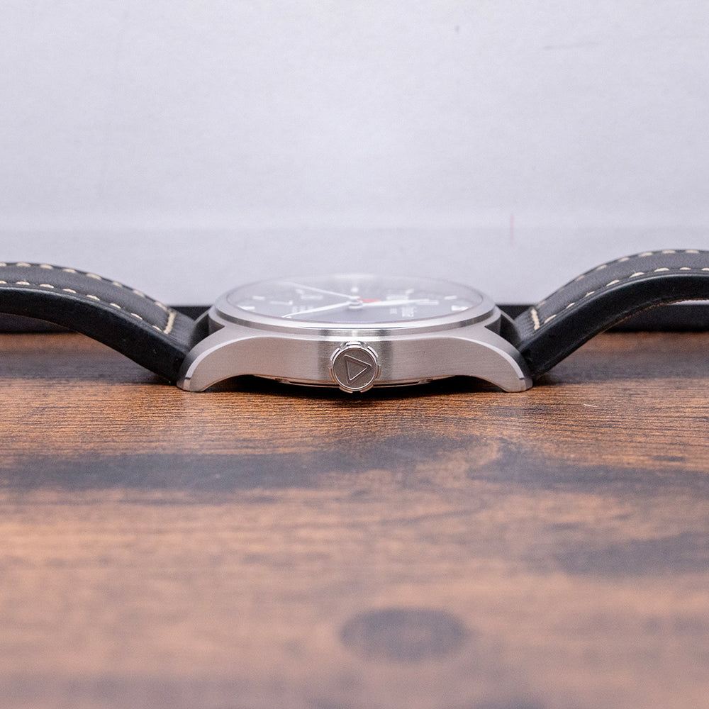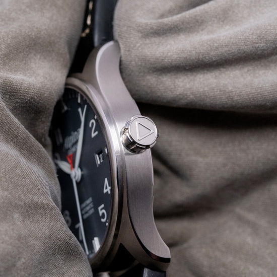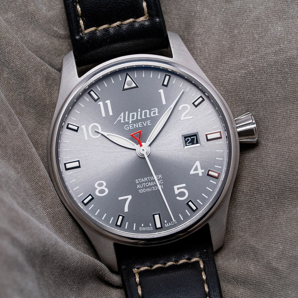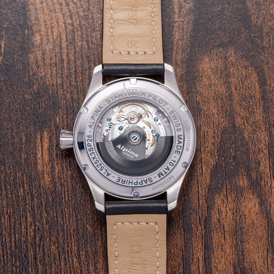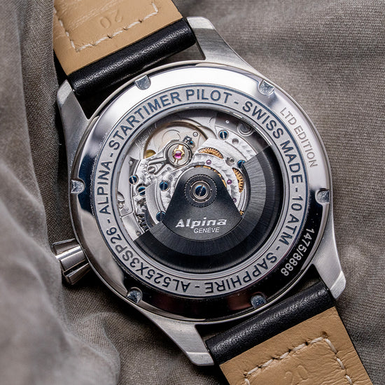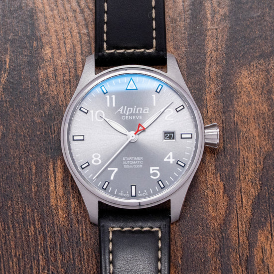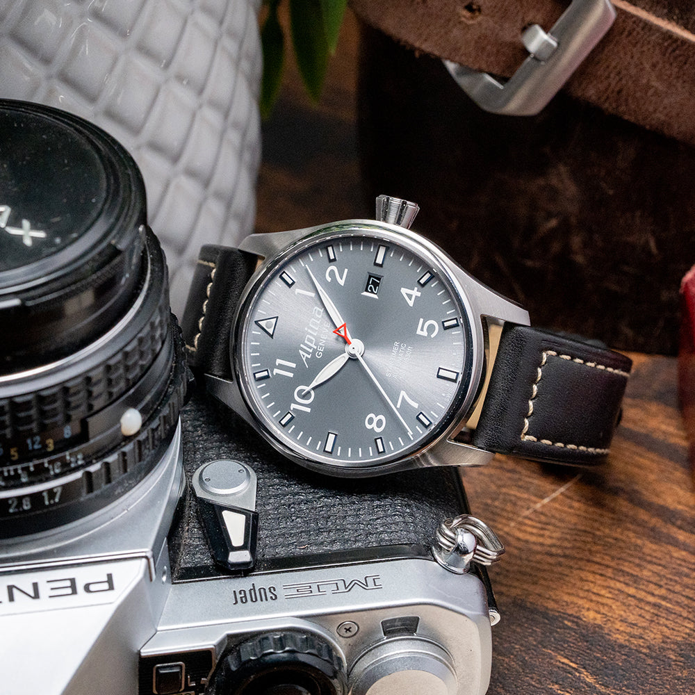Here we have a 2016 Alpina Startimer Pilot Auto AL-525G3S6 Limited Edition 1475/8888 pieces. The 40mm round stainless steel case sits comfortably on your wrist thanks to the tapered flat-ended lugs. Its brushed flanks lead to a lug-to-lug length of 47.5mm and a case thickness of 10mm, giving the watch an impressive wrist presence. On the right side, a deeply knurled signed crown. The polished and brushed smooth bezel holds a flat sapphire crystal AR-coated above a sunburst grey dial. An outer minute track with applied baton indexes at the hour surrounds Arabic numerals marking the hours. At 12 o’clock, we have the characteristic Triangle present on pilot watches. At 3 o’clock, a date window. Slender, white-framed leaf hands filled with SuperLumiNova are complemented by a red ‘A’ counterweighted, sweeping second hand. At noon, we have the Alpina motif and at 6 o’clock, Startimer Automatic 100m/330ft, completing this highly legible pilot watch. On the reverse, a polished stainless steel exhibition case back engraved with its Limited number around the edge and with the details of the watch in relief, inside an automatic Alpina Cal. AL525, based on the Sellita SW200-1, 26 jewels, beating at 28.800 beats per hour, this workhorse movement has hand winding, hack seconds and quick-set date functionality for your convenience. It comes paired with its 20mm leather strap and signed pin folding clasp. This watch is sold with its original Alpina box, swing tag and paperwork.