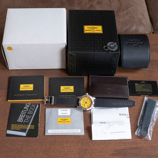 Here we have a 2016 Breitling Avenger II Seawolf 45mm Cobra Yellow A1733110, Breitling stands for high precision, outstanding performance and functionality. The all-brushed 45mm stainless steel case curves over your wrist with thick tapered lugs, and a lug-to-lug length of 55.5mm and a case thickness of 18mm give the watch an impressive and comfortable purposeful fit. The screw-down non-slip crown has a patented seal system; it can be easily gripped with dive gloves due to the deep grooved design. On the left side of the 18mm thick case, we have a Helium escape valve necessary when dealing with the incredible 3000m/10000 ft water resistance. The unidirectional 120-click bezel has a deeply engraved stencil style numeral minute track, raised 15, 30, 45 giving it that characteristic Breitling profile and a large lume pip at 12 o’clock, screw detailing adds to the tool watch aesthetic. A thick domed Sapphire crystal with AR Coating on both sides protects the textured bright Cobra Yellow dial. An outer minute chapter ring surrounds polished Arabic numerals in stencil form that are broad and clearly visible, a framed date window sits at the 3 o’clock position. Large baton hands are fully lumed with Super-luminova and only need a little amount of light to charge, complemented by a red arrow tipped sweeping second hand. At 12 o’clock we have the Breitling motif "Chronometre Officiellement Certifie”, a red ink “Automatic” and “3000m/10000 ft” complete this incredible dive tool watch. On the reverse a screw-down case back with Breitling proudly sitting in relief and the details of the watch engraved around the edge, at the heart of the Avenger Seawolf is the Breitling Caliber 17, based on the ETA 2824-2 automatic movement, it has been assembled and tuned by Breitling Chronométrie in La-Chaux-de-Fonds, Switzerland, 25 jewels, beating at 28,800 beats per hour, the rotor is bidirectional making it an efficient automatic. The watch comes paired with a 22mm Breitling thick rubber strap with a signed buckle plus an additional Unworn 22mm Breitling rubber strap with a signed buckle in the box and the watch comes with its Breitling presentation box and paperwork.