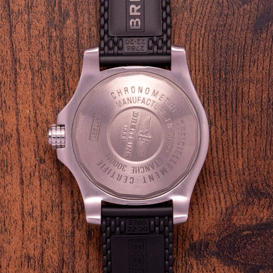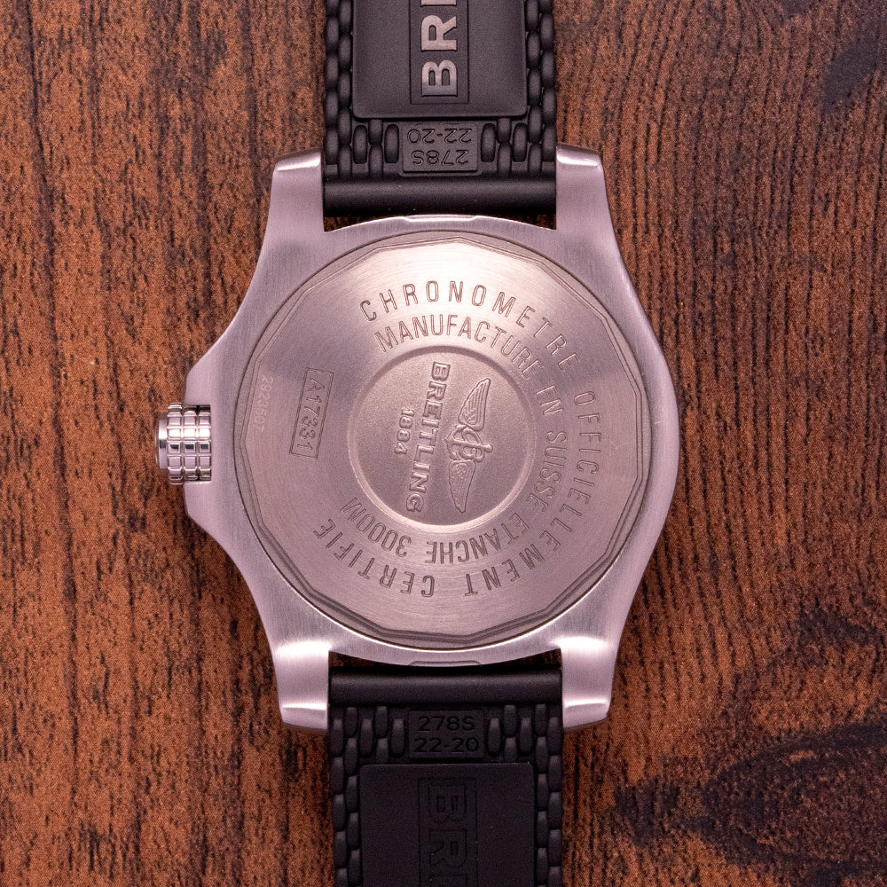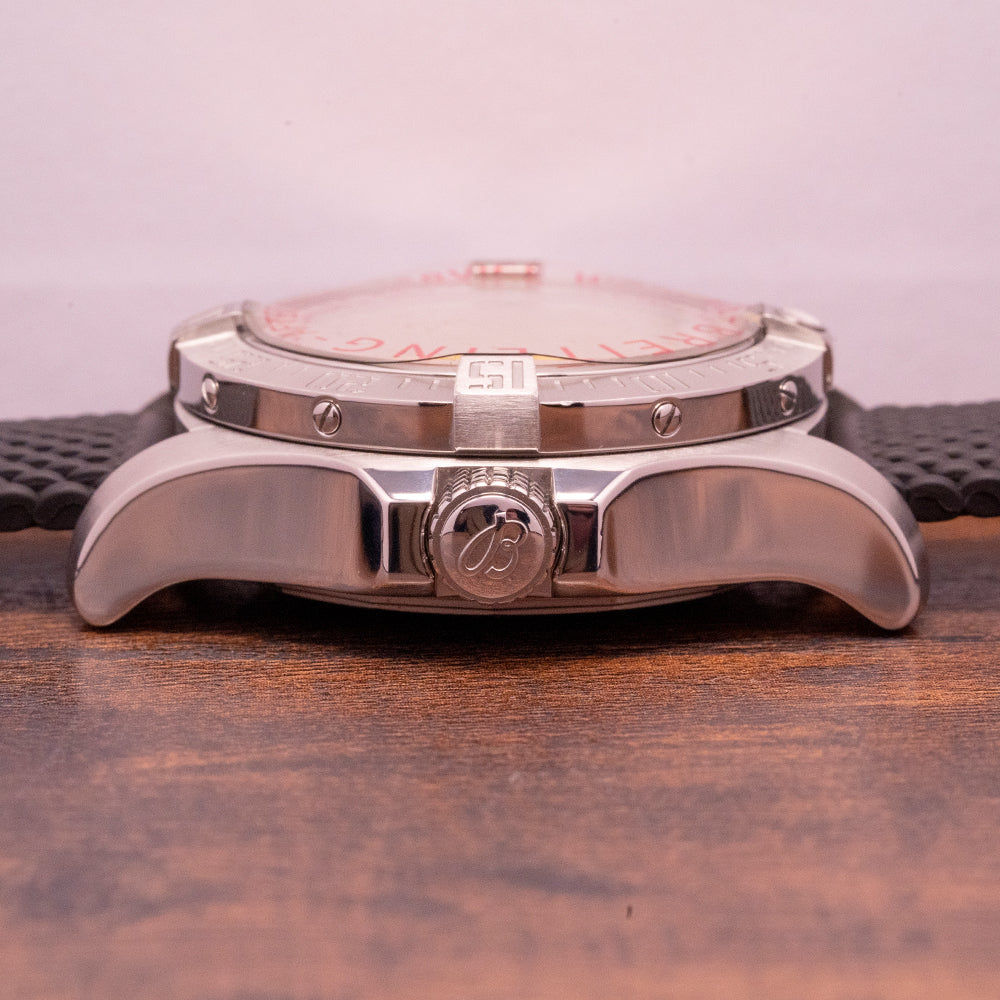 This watch is sold with its original Breitling box and original Breitling paperwork, the watch is from May 2016. The watch comes paired with a 22mm Breitling thick rubber strap with a signed buckle plus an additional unworn 22mm Breitling rubber strap with a signed buckle. The watch is in worn condition but is overall very fair, as you can see in the photos. It comes fresh from a Breitling full service, paperwork provided. The watch additionally comes with our 12-Months Warranty.
