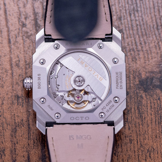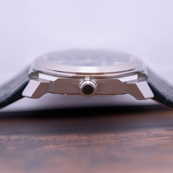 Here we have a 2016 Bulgari Octo Automatic Blue BGO38S, a design that is quintessentially Gerald Genta. This watch is made of 38mm brushed and polished stainless steel and boasts a unique eight-sided design with distinct angles and chamfered edges. The diamond-shaped lugs slide smoothly over your wrist, giving it an impressive presence, with a lug-to-lug length of 44mm and a case thickness of 10mm, this watch is comfortable to wear due to its cushioned design. A perfect blend of Italian design and Swiss horology combining the worlds of the jeweller and the watchmaker. On the right side is a screw-down crown with deep knurling for extra grip and a black ceramic insert. A smooth brushed round bezel sits on a polished platform of straight lines and curved corners, the sapphire crystal sits above a sunburst blue octagonal dial with a lacquer-polished finish. An outer minute track has applied Arabic 12 and 6 and baton indexes in between marking the hours, polished edges play with the light as you rotate your wrist, at 3 o’clock a date window, polished skeletonised Dauphine hands are complemented by a sweeping tapered second hand. At 12 o’clock we have the Bulgari motif completing this charismatic dress watch. On the reverse, a screwed-down exhibition case back has polished pentagon-shaped screws, showcasing an automatic Bulgari Cal. BVL191, 26 jewels, beating at 28,800 beats per hour, a modified bidirectional rotor has Bulgari engraved into it and the movement is decorated in attractive perlage and Cotes de Geneve stripes. The watch comes paired with its original fitted 27mm Bulgari leather strap with a signed deployment buckle and the watch comes with its Bulgari presentation box and paperwork.