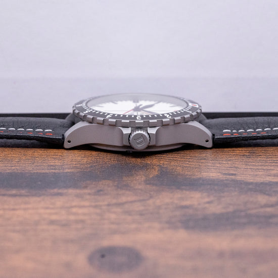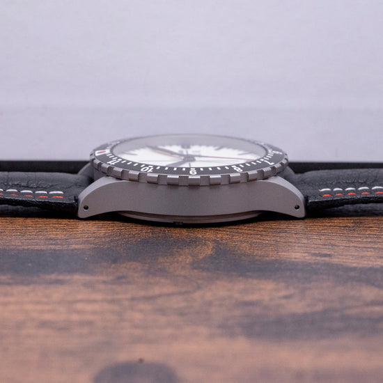 Here we have a 2016 Damasko DA45 Full Lume Dial Automatic with a 40mm ice-hardened bead-blasted nickel-free stainless steel case that curves over your wrist with tapered lugs, the DAMEST® hardened surface makes the watch case more resistant to scratches, and a lug-to-lug length of 47.5mm and a case thickness of 12mm give the watch an impressive wrist presence. Small crown guards protect a hardened, signed screw-down crown with triple gaskets for improved water resistance and deep knurling for extra grip on the right side. A bidirectional ice-hardened bezel has deep knurling and a black 12-hour insert with a red pip triangle at 12 o’clock coated in a proprietary DAMEST® hardener, making it more resistant to scratches and abrasions, holding a flat sapphire crystal AR coated on both sides for excellent viewing. The white, cross-hair fully luminous dial, coated in CL1 SuperLuminova, features an outer minute track precisely executed. Large black Arabic numerals mark the hours, and at 3 o’clock, a colour-matched day/date window is present. Striking matte black sword hands are complemented by a red-painted sweeping second hand. Above the date, we have the Damasko motif. On the reverse, a screw-down sapphire exhibition case back houses an automatic ETA Cal. 2836-2, featuring 25 jewels and beating at 28,800 beats per hour. This workhorse movement offers hand-winding and hack seconds for your convenience. It comes with a Damasko leather strap and a pin buckle, and the watch is accompanied by its Damasko presentation box.