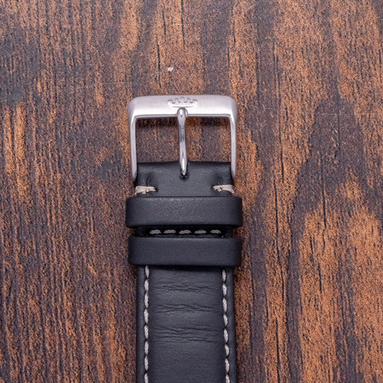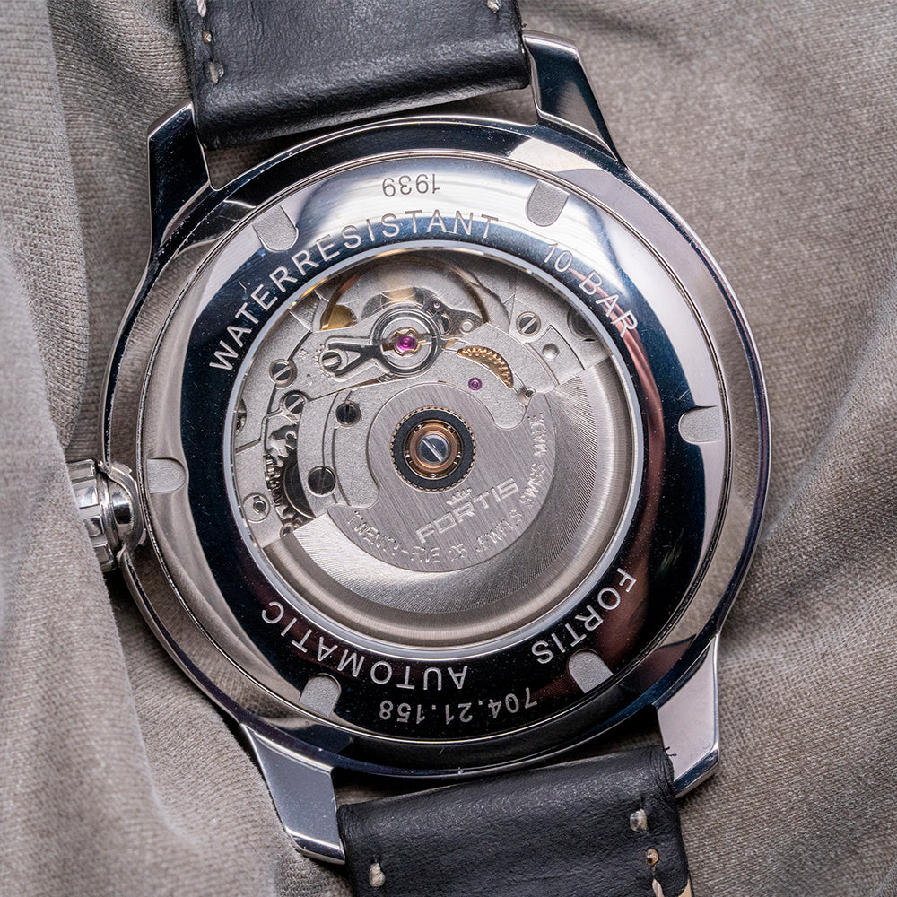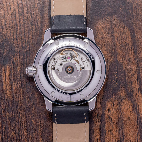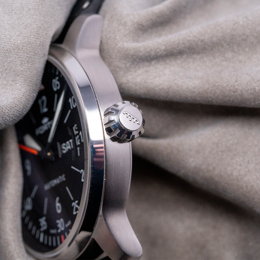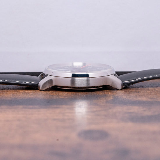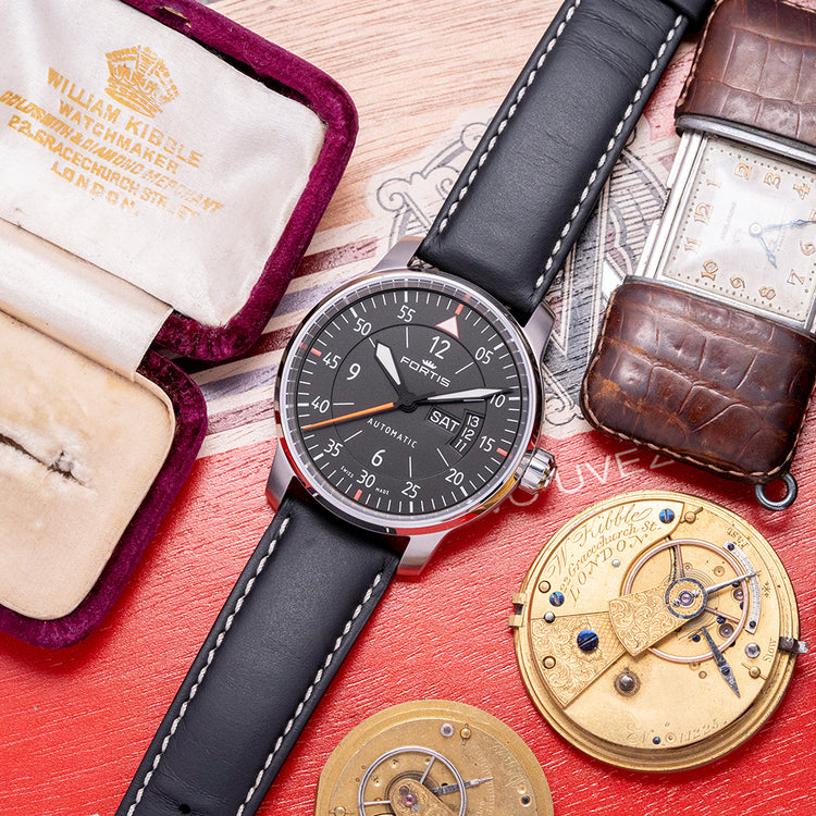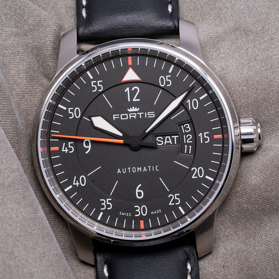 Here we have a 2016 Fortis Aviatis Cockpit Two Black Automatic with a 41mm brushed stainless steel case, the case perfectly curves over your wrist with its thick lugs and a lug-to-lug length of 47mm and a thickness of 10.5mm, ensuring a comfortable fit on the wrist. On the right side, a deep knurled signed crown. The smooth, polished bezel holds a domed sapphire crystal AR-coated for perfect viewing angles. The matte black sector dial has a 60-minute track with a red outlined triangle at noon and red highlights, Arabic 12, 6 and 9 and stick indexes are precisely painted in white SuperLumiNova marking the hours, at 3 o’clock a day/date window in a configuration resembling the Altimeter found in a cockpit, broad sword hands with an orange sweeping second hand, at 12 o’clock we have the Fortis motif with “Automatic printed at 6 o’clock complete this Aviatis timepiece. On the reverse, a screw-down exhibition case back with the details of the watch engraved around its edge, inside an automatic ETA 2836-2, 25 jewels, 28,800 beats per hour, this quality movement has hand winding and hacking seconds for your convenience. It comes paired with its original 20mm Fortis black leather strap and signed pin buckle. The watch comes with its original Fortis presentation box and papers.
