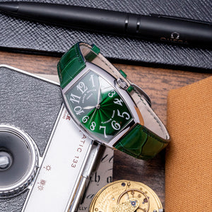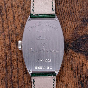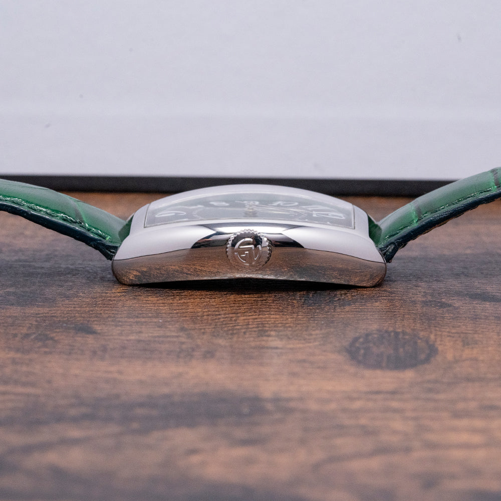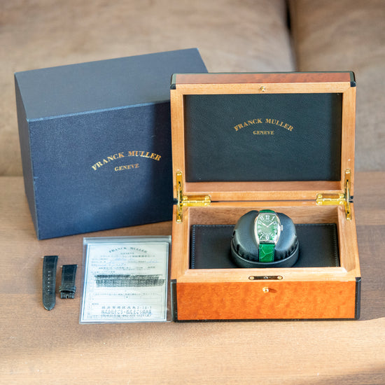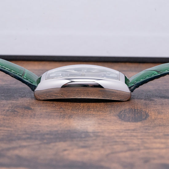 Here we have a 2016 Franck Muller Cintrée Curvex Green Automatic 5850 with a curvaceous 32mm Tonneau-shaped high polished stainless steel case that gently curves over your wrist with a lug-to-lug length of 44.5mm and a case thickness of 11mm ensuring a comfortable fit. On the right side is a signed crown, and a domed curved sapphire crystal sits above a stunning green Guilloché dial with a beautiful sunburst effect. Large Arabic white painted numerals radiate from the centre marking the hours, elegant steel sword hands filled with Super-LumiNova are complemented by a tapered sweeping second hand, at 12 o’clock we have the Franck Muller motif and at 6 o’clock “Platinum Rotor” completes this exquisite flamboyant dress watch. On the reverse, a screwed-down case back perfectly curved with deep engraving “Master of Complications”, inside a modified automatic ETA 2892A2 (Platinum Rotor), 21 jewels, beating at 28,800 beats per hour. The watch comes paired with its original extra-long Franck Muller 18mm leather strap with a Franck Muller pin buckle, an aftermarket regular black strap is provided, and this watch is sold with its Franck Muller presentation box.