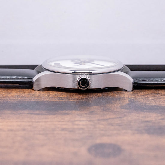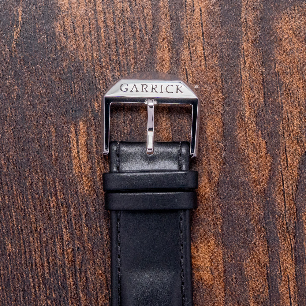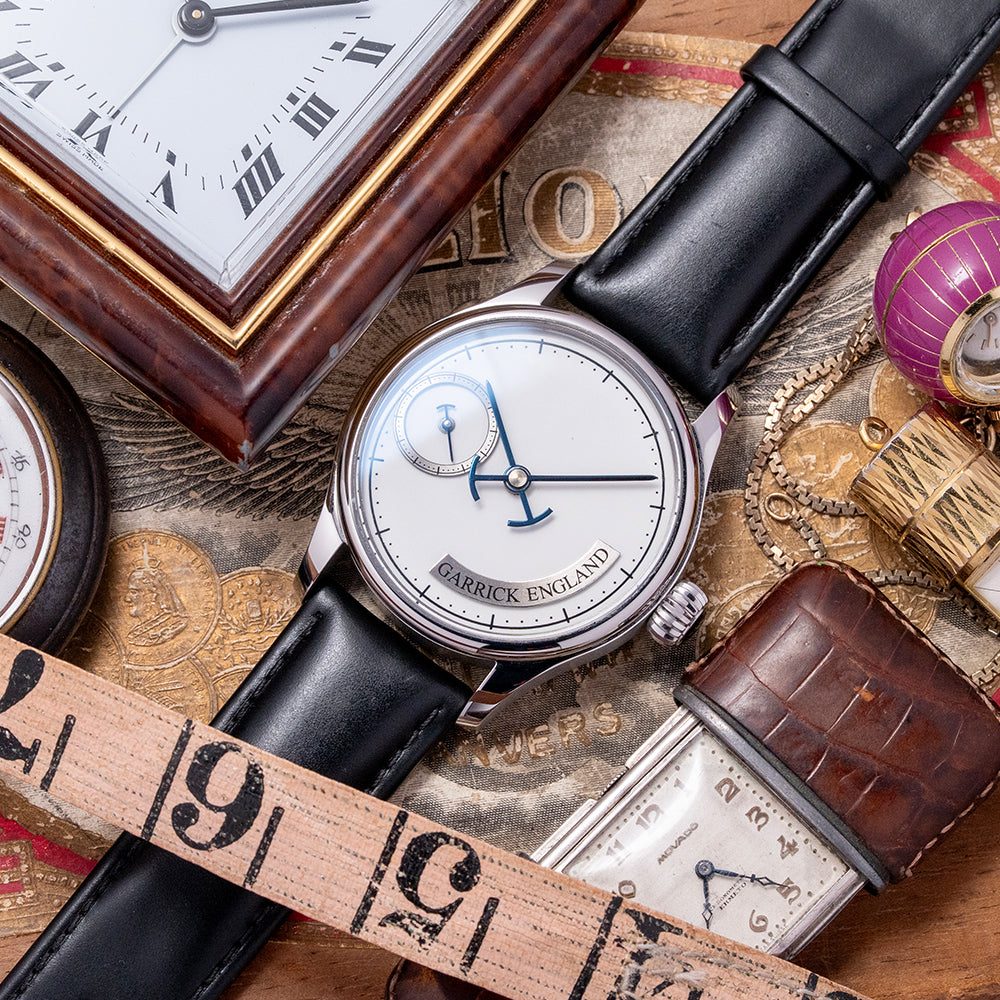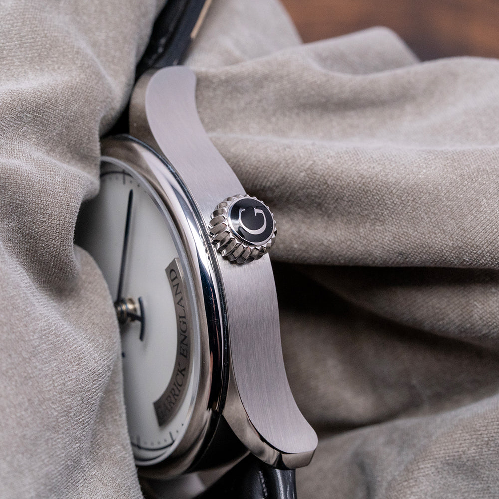 Here we have a 2016 Garrick Norfolk 'Special' White Dial taking its inspiration from maritime instruments. This is the first model to showcase the brand's innovative DNA, with a curvaceous 42mm polished and brushed stainless steel case that curves over your wrist thanks to the tapered lugs. The polished top surface of the lugs leads to a lug-to-lug length of 50.5mm and a case thickness of 13mm, ensuring a comfortable fit on your wrist. On the right side, an onion crown. The smooth, polished bezel holds a sapphire crystal AR-coated above a stunning white enamel dial, crafted from machined silver with an enamel coating applied to both sides to prevent warping. Designed by Freelance designer Michael Horlbeck and David Brailsford. An outer minute track features long markers at the hour, surrounding an applied stainless steel nameplate, and sub-seconds with the same style hands. The in-house maritime-themed hands are thermally blued and resemble anchors. On the reverse a screw-down exhibition case back engraved with the details of the watch around its edge, inside an you will find instead of the usual manual wind Unitas 6497 the customer upgraded it to the Garrick Cal SM001 manual wind movement, a modified Unitas 6498 NOS manual wind movement, as found in their Shaftbury SM301 model released in 2015, beating at a leisurely 18,000 beats per hour, the balance bridge is separated from the main plate removing the standard regulator, adding a free-sprung balance, it has hacking seconds, decorated with gold-plating, thermally blued screws and Cotes de Geneve stripes. It comes paired with two 22mm Garrick straps with its original Garrick Watchmakers signed pin buckle. This watch is sold with its original Garrick Watchmakers presentation box and paperwork.