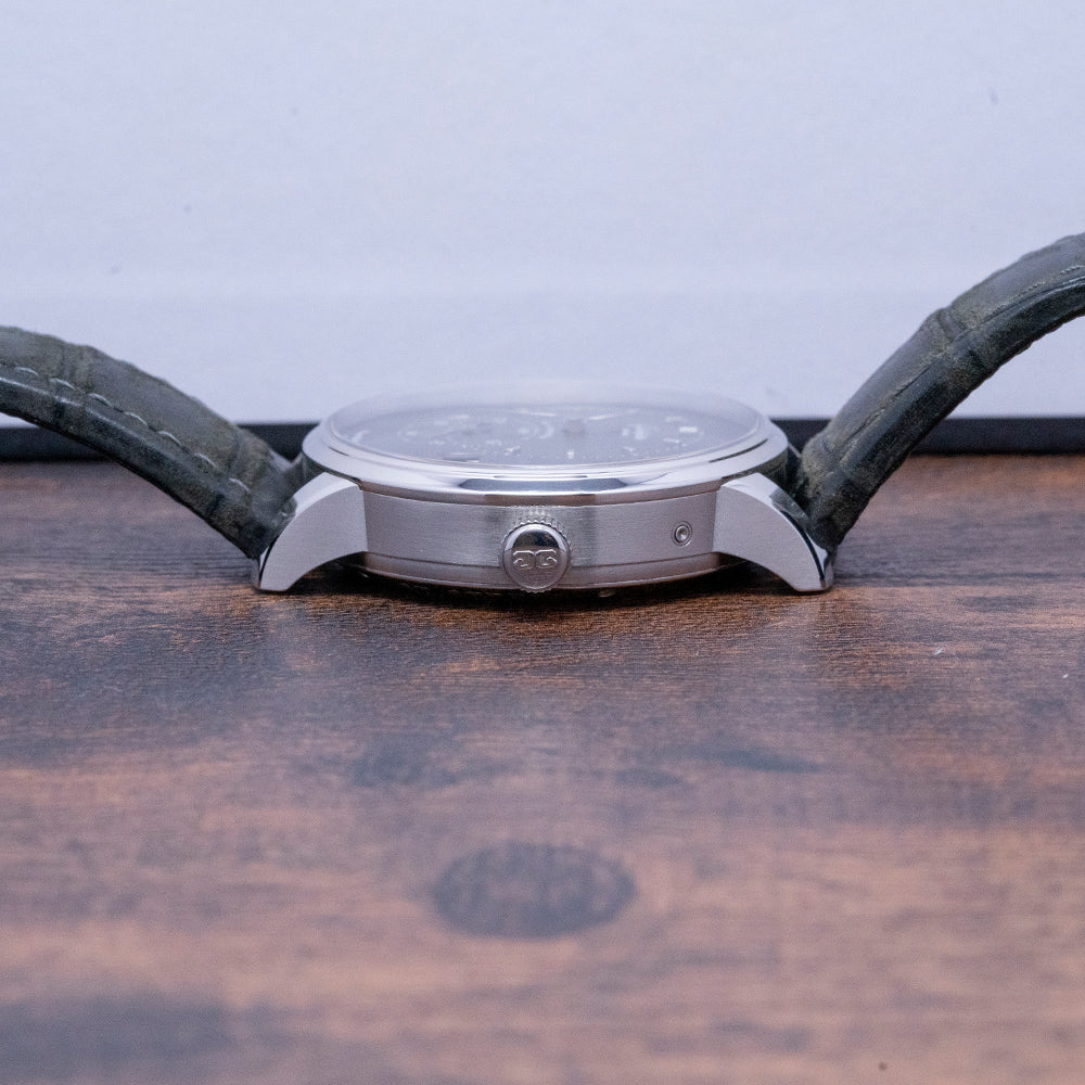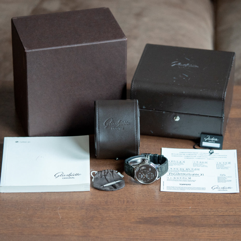 Here we have a 2016 Glashütte Original Panomatic Lunar with a 40mm stainless steel case, the chamfered-edges lugs float over your wrist with a lug-to-lug length of 47mm and a case thickness of 12mm ensuring a comfortable fit. On the right side, we have a signed crown and a small recessed pusher to adjust the moon phase disc. The polished bezel holds a domed sapphire crystal. A Galvanised ruthenium grey matte asymmetric dial with the moon phase crescent at 2 o’clock, a large framed date window, and finally the two dials the larger one has applied chamfered baton indexes marking the hours and a sub-seconds dial interconnected to create a very pleasing arrangement. Elegant Alpha hands filled with Super-LumiNova. The text is precisely executed around the dial completing the classic Glashütte aesthetic. On the reverse, a sapphire crystal exhibition screwed-down case back, inside an automatic Glashutte Original Cal. 90-02, 47 jewels, 28,800 beats per hour, this incredible movement has all the hallmarks of a master craftsman. Glashütte's three-quarter plate has a striped finish, an off-centre skeletonized rotor continues with the striped finish, the double-G logo and 21-carat gold oscillation weight catches the eye, they use a Duplex-swan-neck for fine adjustments, and their balance bridge has been engraved by hand. The watch comes paired with a grey Louisiana Alligator nubuck leather 20mm strap with a signed buckle and also comes with its Glashütte presentation box, travel case, swing tags and papers.