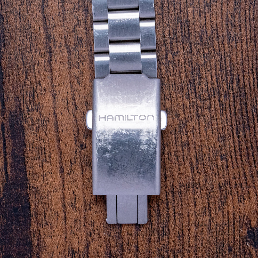 This watch is sold with its original Hamilton Box & paperwork. The watch comes paired with its Hamiton 20mm 3-link brushed stainless steel bracelet with a button-released signed folding clasp and will fit up to a 6.9-inch wrist. The watch is from November 2016 and is in worn condition as you can see from the photos, a full case and bracelet refurb can be provided at an additional cost. The watch comes with our 12-Months NON-Waterproof Warranty.