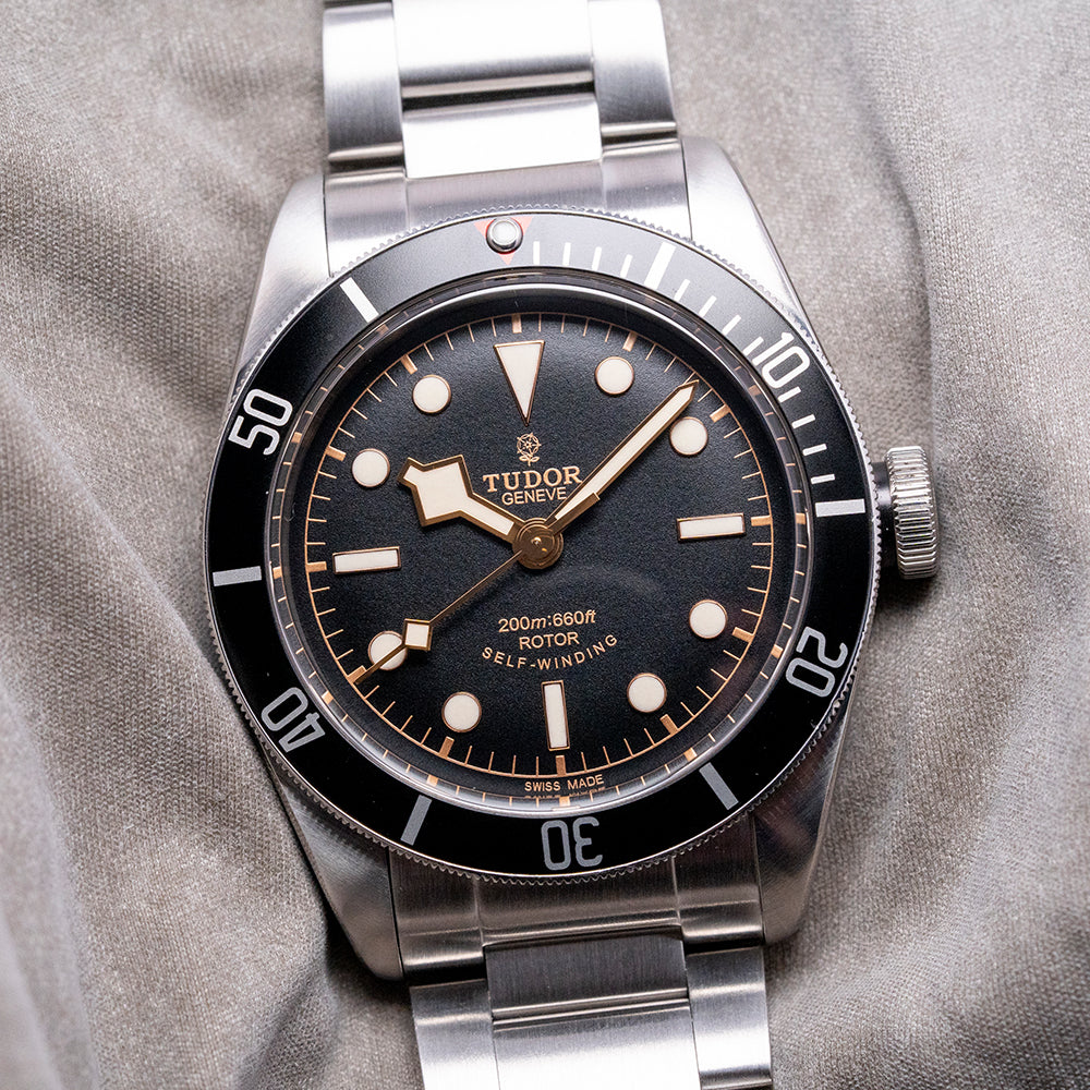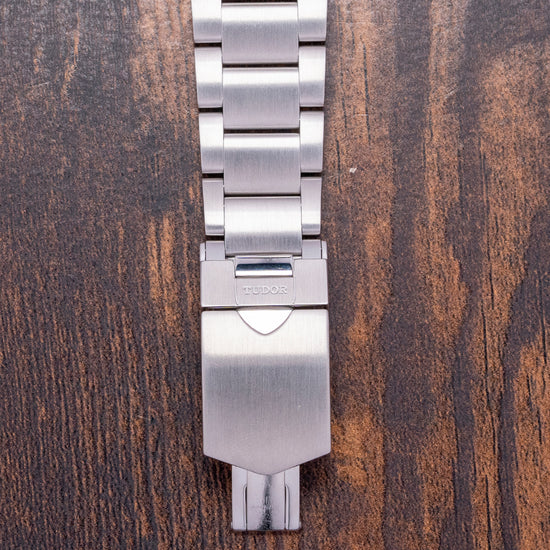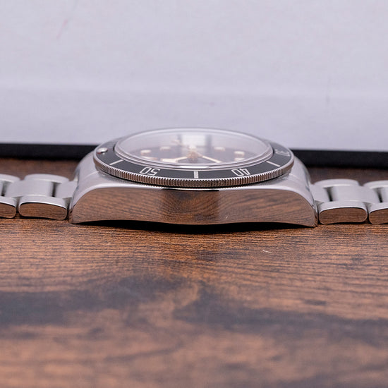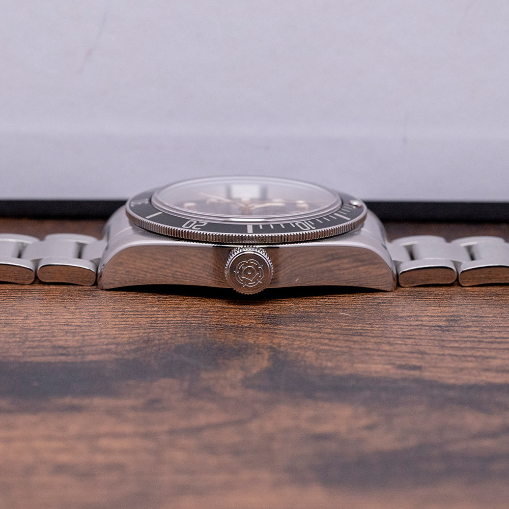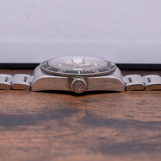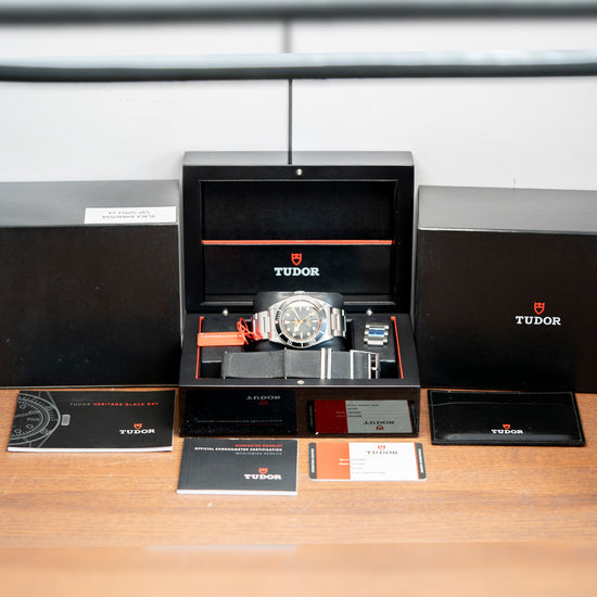The Tudor Black Bay was launched in 2012, this Tudor 79220N was launched in 2015, and at Baselworld in 2016, Tudor discontinued the 79220 references with ETA movements and replaced them with an in-house 79230 reference. Therefore, this is one of the last 79220N models produced. Here we have a 2016 Tudor Black Bay Black 41mm ETA 'Smiley' 79220N with a 41mm brushed and polished stainless steel case. Inspired by their Ref. 7922. The case curves over your wrist with a lug-to-lug length of 50mm and a thickness of 12mm, giving the watch an impressive wrist presence. Polished edges and brushed surfaces transition with crisp lines. On the right side is a signed screw-down crown with a black tube ring. The unidirectional stainless steel bezel has a red triangle at 12 o’clock and a black aluminium insert with a silver 60-minute scale protecting a domed crystal. A matte black dial features a gilt outer minute track and gilt-edged disc and baton indexes to mark the hours. The characteristic gilt-framed snowflake hands are coated in luminescence and completed by a gilt sweeping second hand. Text in gilt at 12 with the Tudor motif and at 6 with the ‘200m: 660ft’ “smiley” “Rotor Self-Winding”, indicating an ETA movement inside. On the reverse, a coin-edged screw-down case back. Inside an automatic ETA 2824, 25 jewels, 28,800 beats per hour, which has been modified by Tudor, removing the date function, changes to the antishock system, and finally updating the mainspring mechanism. It comes paired with its original 22mm Tudor Oyster stainless steel bracelet, secured by a signed deployant flip-lock clasp, plus a 22mm Tudor NATO strap and signed pin buckle. The watch comes with its Tudor presentation box, swing tag and paperwork.