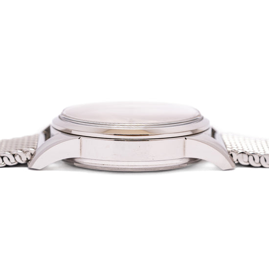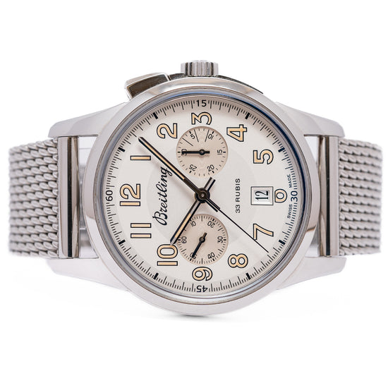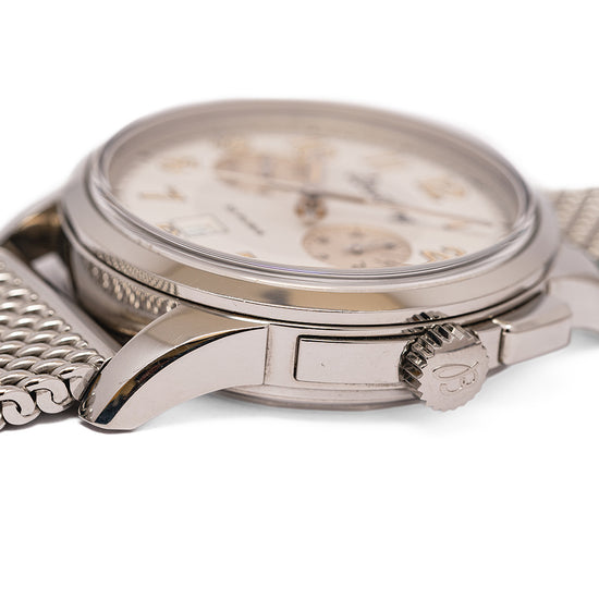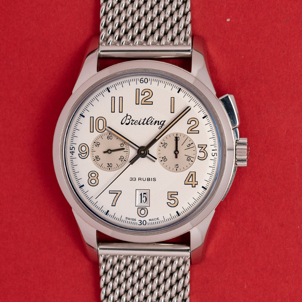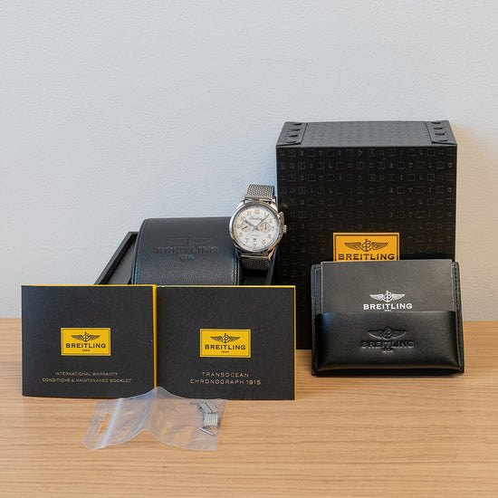 Here we have a 2017 Breitling Transocean Chronograph 1915 Limited to 1915 pieces, Breitling in 1915 was the first watch manufacturer to produce a chronograph with an independent mono-pusher at 2 o’clock. A 43.5mm polished stainless steel case has thick curved lugs that wrap your wrist with a lug-to-lug length of 54.5mm and a case thickness of 14.5mm giving the watch an impressive wrist presence. Down the right side, we have the ramp-style chronograph mono-pusher at 2 o’clock and a signed crown with deep knurling for extra grip at 3 o’clock. A slim smooth polished bezel holds a raised and domed sapphire crystal above a striking white dial, the outer edge has the 60-minute track precisely executed, just underneath we have Arabic numerals coated in faux aged Super-Luminova marking the hours, at 6 o’clock a framed date window, at 3 o’clock a 30-minute register and finally at 9 o’clock a small seconds register. Long sword hands are infilled with faux-aged Super-Luminova luminescence complemented by a tapered chronograph hand. At 12 o’clock we have the old “Breitling” motif and “33 Rubis” printed underneath completing this vintage-inspired bicompax mono-pusher chronograph. On the reverse a screw-down exhibition case back with the number out of 1915 and model information engraved in an attractive font, inside a manual Breitling Cal. B14M, 33 jewels, 28,800 beats per hour. This in-house two-tiered, double-column wheel chronograph has the same movement name as the original 1915 Breitling mono-pusher and is COSC certified. The watch comes fitted on its original Breitling 22mm Milanese bracelet with a signed folding clasp and the watch also comes with its Breitling presentation box and paperwork.