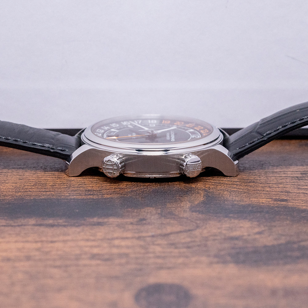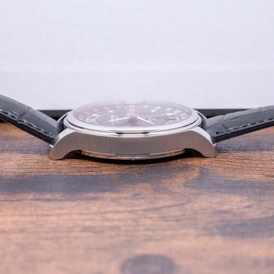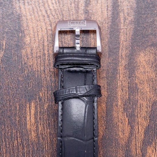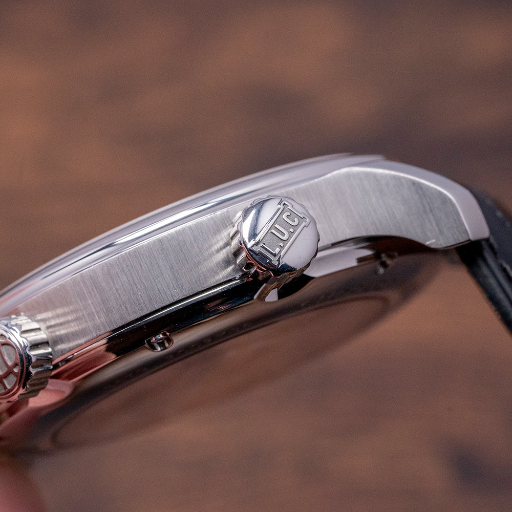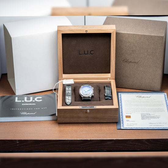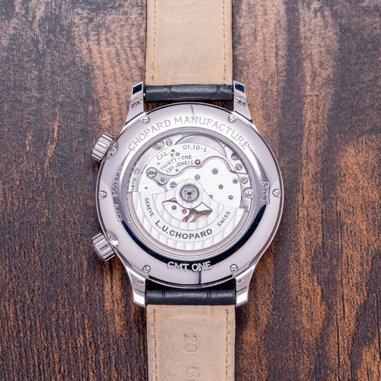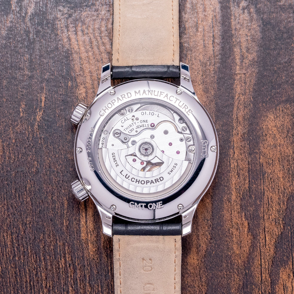 Here we have a 2017 Chopard LUC GMT One Automatic 168579-3001 with a curvaceous 42mm stainless steel case, polished and brushed surfaces transition with crisp bevelled edges and elegantly tapered lugs with a lug-to-lug length of 50.5mm and a case thickness of 11mm ensures a comfortable fit on your wrist. Down the right side, we have a top-signed crown that adjusts the time and date, and the bottom crown adjusts the 24-hour GMT rotating inner bezel. The beautifully sculpted smooth bezel holds a flat sapphire crystal above a striking satin-brushed black dial; around the edge, we have the 24-hour rotating bezel in black and white with contrasting orange and white Arabic numerals to differentiate day and night, an inner concentric ring reminiscent of the sector dials of the past has applied Arabic numerals and faceted dagger indexes coated in Super-LumiNova marking the hours, at 6 o’clock a framed colour matched date window perfectly balances the form and function of the dial, the orange GMT arrow hand hits the mark and is easily read, Chopard signature sword hands complemented by a tapered sweeping second hand are infilled with Super-LumiNova complete this dynamic vintage inspired travelling companion. At 12 o’clock, the L-U-Chopard motif “Chronometer” and “Automatic GMT” are printed underneath. On the reverse, a screwed-down exhibition case back with sapphire crystal and engraved around the edge the watch’s hallmarks and model name, inside an automatic L.U.C cal. 01.10-L, 31 jewels, 28,800 beats per hour, COSC Certified movement is exquisitely decorated in Côtes de Genève. It comes paired with a well-suited 20mm leather strap with a signed Chopard buckle plus the original worn 20mm Chopard leather strap, and the watch comes with its Chopard presentation box, swing tag and paperwork.