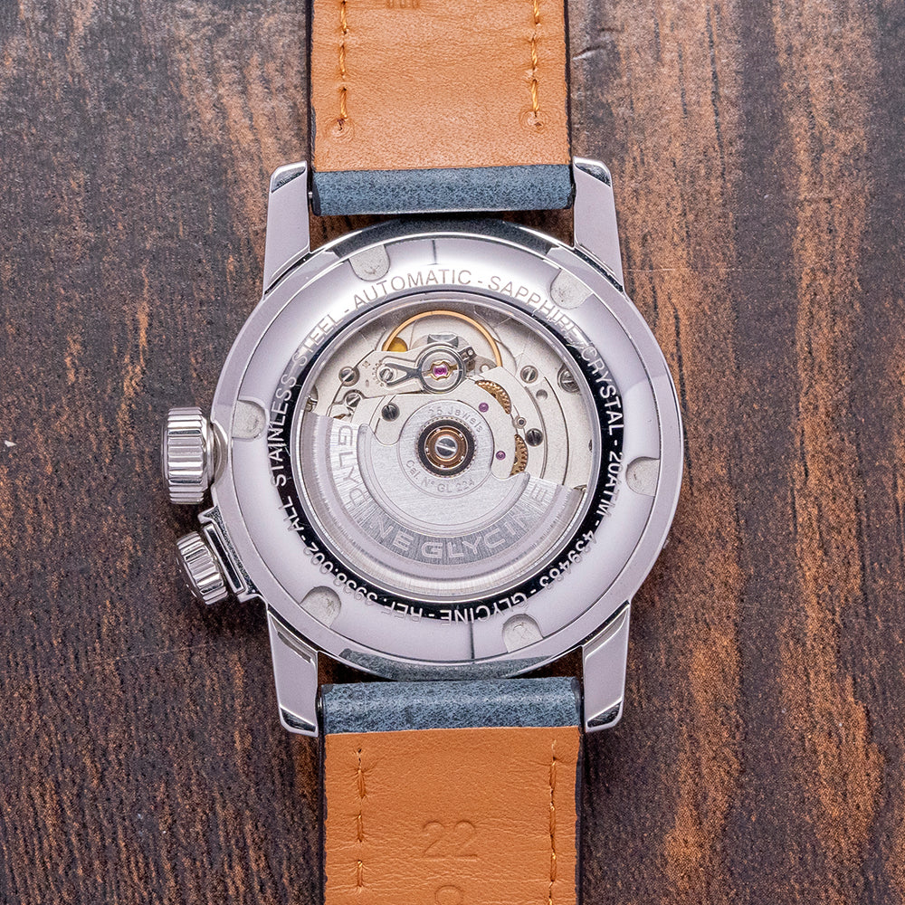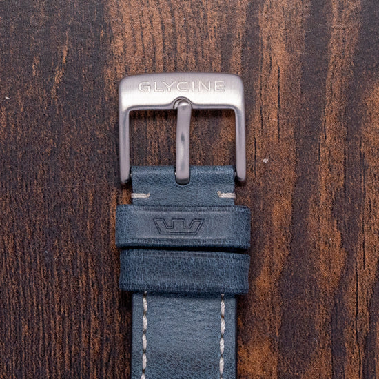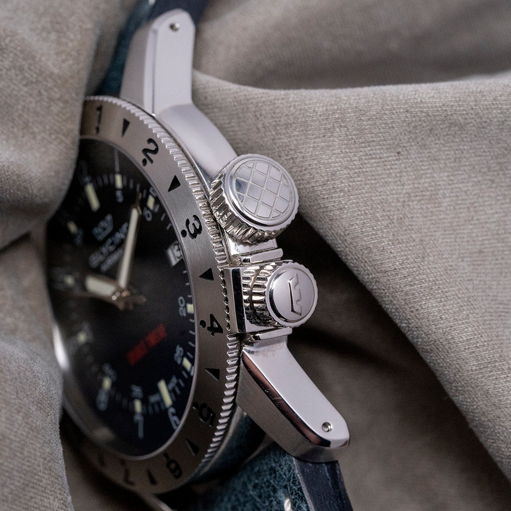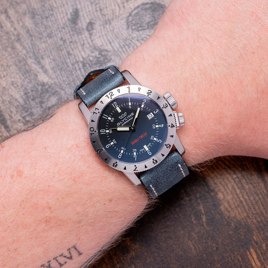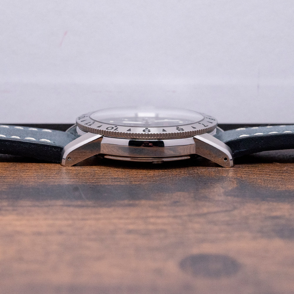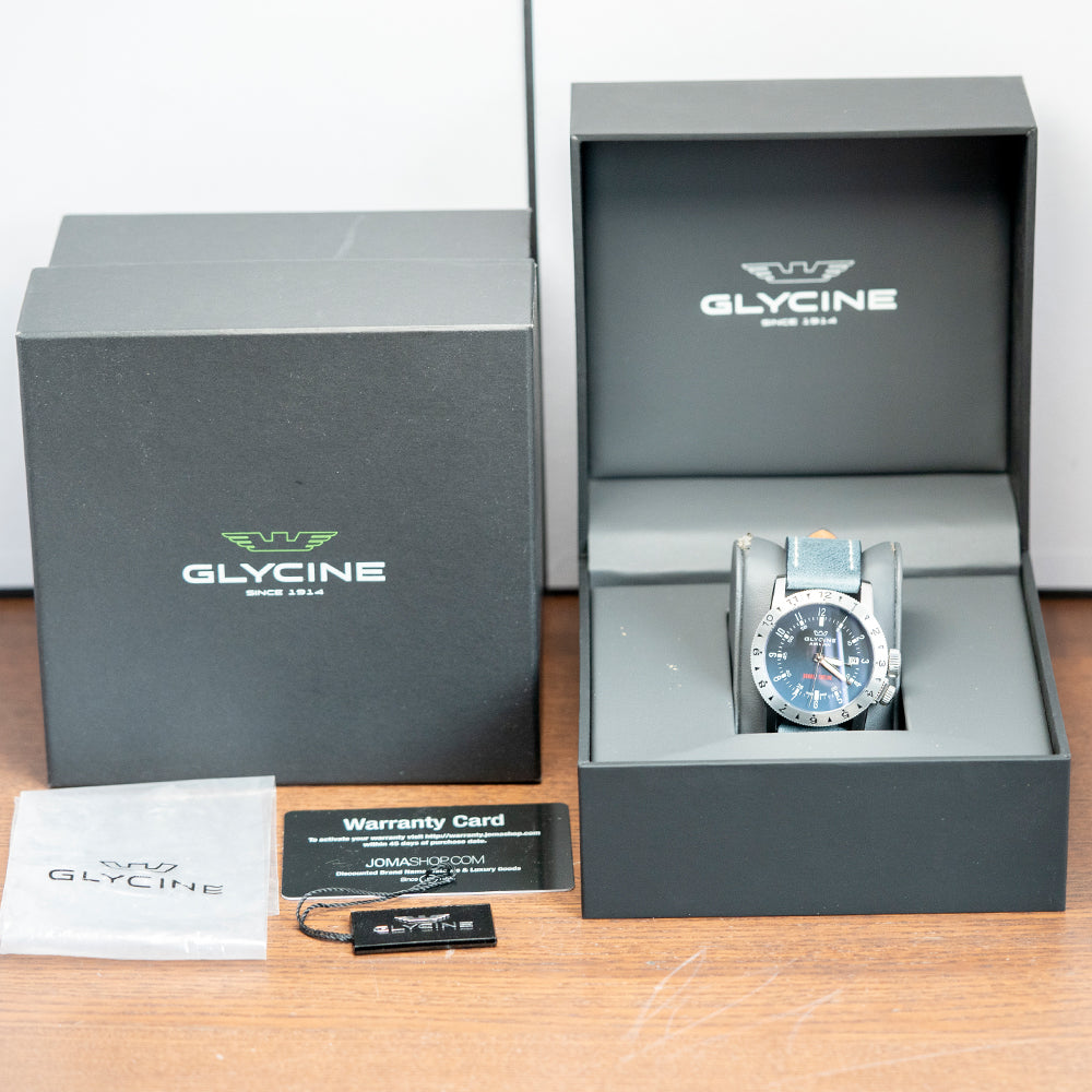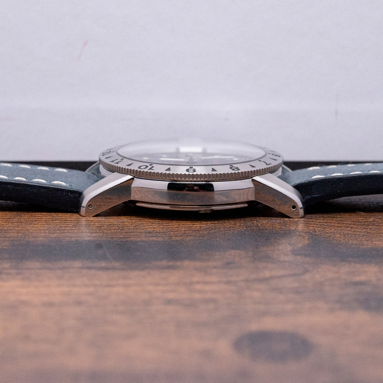 Here we have a 2017 Glycine Airman Double Twelve Automatic 3938, this is the first Airman since its launch in 1953 to have the Double Twelve configuration. The 40mm stainless steel case hugs the wrist, with polished and brushed surfaces that transition smoothly to crisp edges. A lug-to-lug length of 48mm and a case thickness of 11.5mm give the watch an excellent wrist presence. On the right side, at 3 o’clock, a screw-down crown to adjust the time and date. At 4 o’clock, a second crown that locks the friction-fit bezel in place. The bi-directional stainless steel friction-fit bezel features black 12-hour numerals deeply engraved. A flat sapphire crystal sits above a blue dial. An outer 12-hour chapter ring with minute tracks and lumed baton indexes underneath marks the hours, and at 3 o’clock, a date window is located. The syringe hour hand and minute hand are complemented by a tapered steel sweeping seconds hand. At noon, we have the Glycine motif “Airman” printed underneath and at 6 o’clock in red “Double Twelve”. On the reverse, a screw-down case back. Inside an Automatic GMT. The watch comes fitted with its Glycine 22mm leather strap with a signed buckle and also comes with its Glycine presentation box, swing tag and papers.