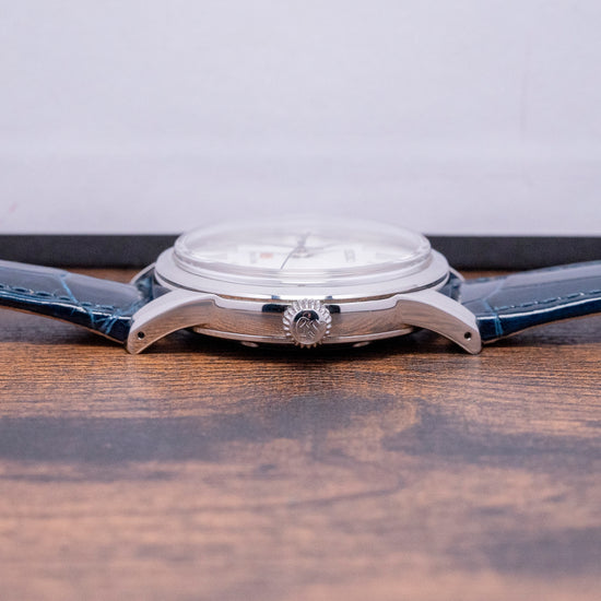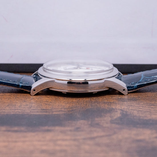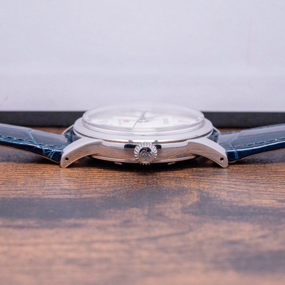 Here we have a rare 2017 Grand Seiko "Guilloche" Mechanical SBGW049, a Limited Edition of 200 pieces, launched in 2016; it brings together the sophistication of a dress watch with the craftsmanship of true experts at Grand Seiko. The 37mm stainless steel case has perfect polishing, something we sometimes take for granted on a Grand Seiko; it’s not until we have one on the wrist that we can truly appreciate the sheer brilliance of the Zaratsu polishers. A lug-to-lug length of 44mm and a thickness of 11.5mm give the watch excellent wrist presence; the drilled lugs gently curve over your wrist for a comfortable fit, and on the right side, a signed crown. A stepped polished bezel holds a slightly domed box-shaped sapphire crystal with an AR coating on the inside, and the stunning white Guilloche dial has an outer minute track with applied steel batons and precisely chamfered edges. Zaratsu polished. As you rotate your wrist, the dial magically plays with the light, steel dauphine hands that have been Zaratsu polished are complemented by a blue tapered sweeping seconds hand, precisely applied Seiko at 12, an applied gold-toned “GS” and printed “Grand Seiko” underneath at 6 o’clock complete this mesmerising dress watch. On the reverse, a screwed-down exhibition case with sapphire crystal showcases the movement, inside a manually wound Grand Seiko Cal. 9S64, 24 jewels, 28,800 beats per hour, and an impressive 72-hour power reserve, the movement has been adjusted to six positions and temperatures at the factory, finished with attractive Cotes de Geneve decoration, the movement has been developed with Micro Electro Mechanical Systems (MEMS) Technology where precise components are produced using advanced semiconductor manufacturing. The watch comes fitted on a 19mm Grand Seiko strap with a signed buckle, and it comes with its Grand Seiko presentation box and paperwork, plus an additional Grand Seiko strap.