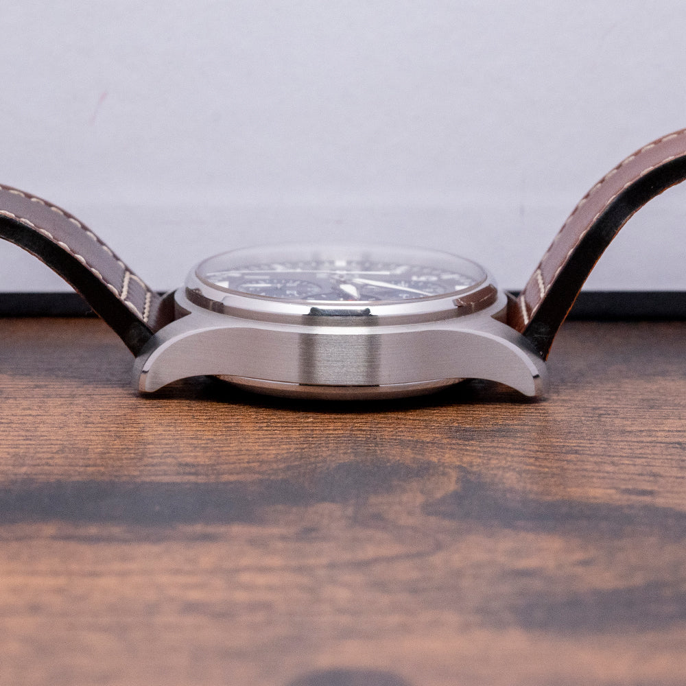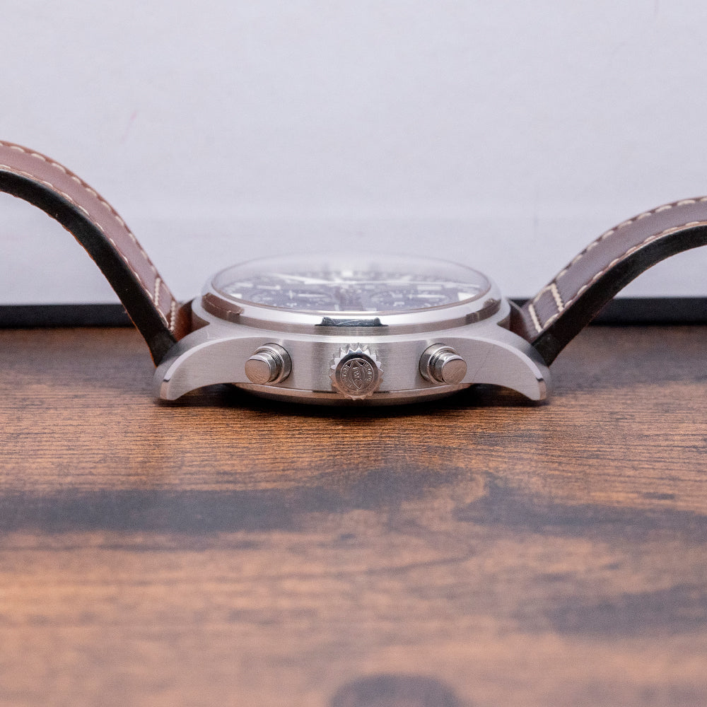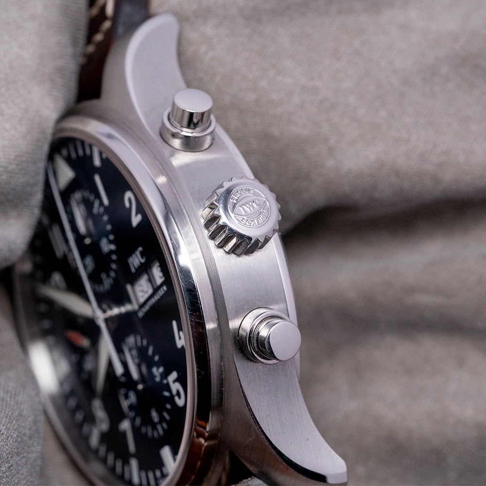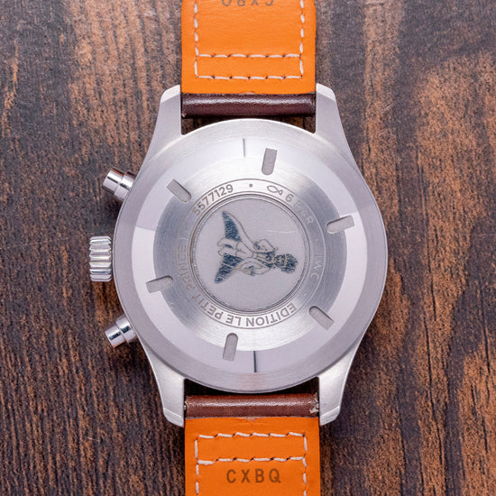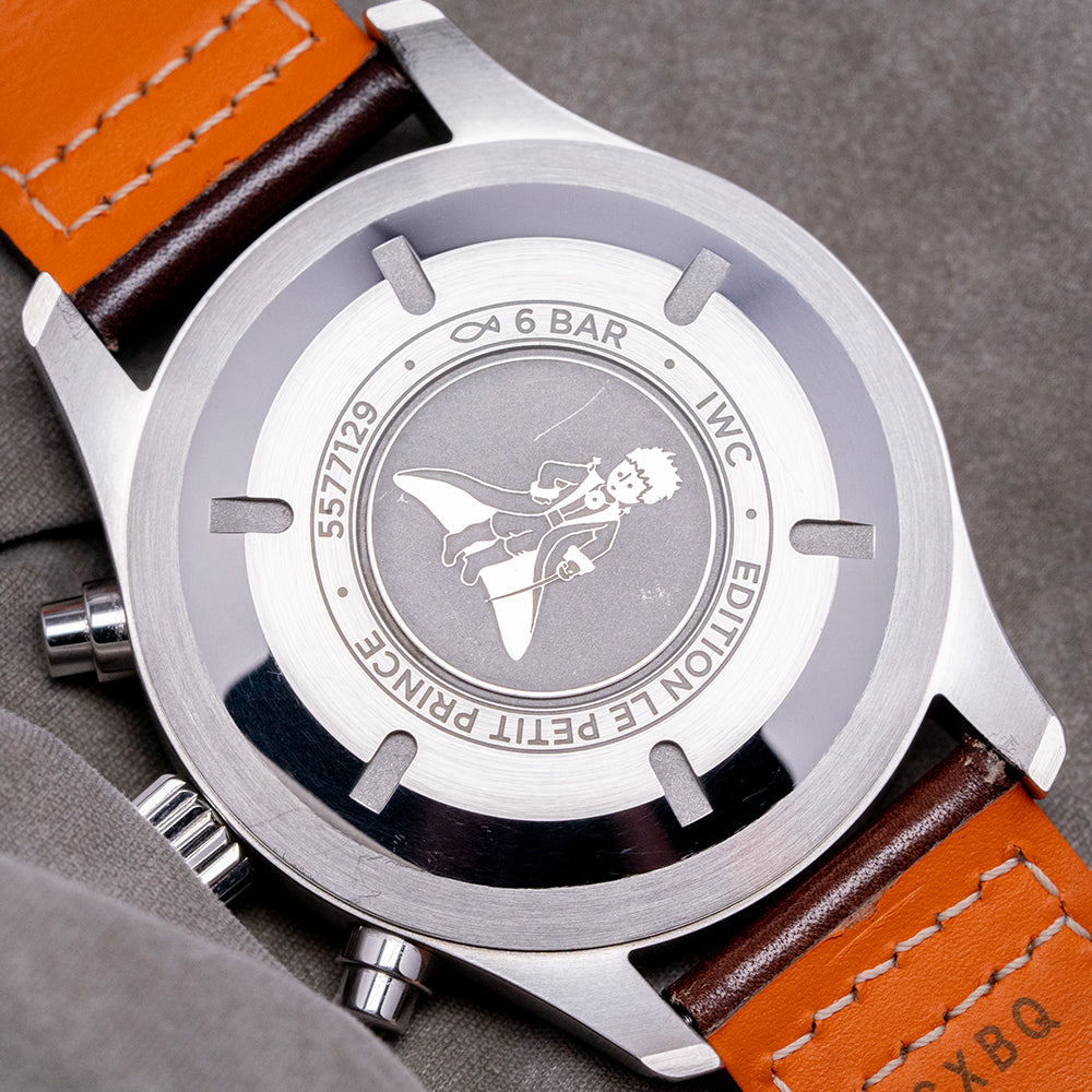 Here we have a 2017 IWC Pilot's Chronograph 'Le Petit Prince' Blue 43mm IW377714, the “Le Petit Prince” was written in 1942 by Antoine de Saint-Exupéry, who was a French aristocrat, writer, and military aviator. IWC has worked closely with its descendants since 2005 and has auctioned off many special timepieces to raise funds for its charity to help children and young people in unfortunate circumstances. The 43mm satin brushed stainless steel case has a soft iron inner case that protects the watch from a magnetic field, similar to a Faraday cage. The subtle curve of the case leads to a lug-to-lug length of 53mm and a case thickness of 14.5mm, giving the watch an impressive wrist presence. Down the right side, we have the polished chronograph pushers and a screw-down signed crown in the centre, a smooth bezel with chamfered edges, and a convex sapphire crystal AR coated on both sides. A glossy deep blue sunburst dial has an outer minute track with baton indexes coated in Super-LumiNova C1 luminance marking the hours, large Arabic numerals lay just underneath again coated in Super-LumiNova C1 luminance with the triangle and pips at 12 o’clock, a characteristic seen on many pilot timepieces, at 3 o’clock a day/date window. The chronograph consists of a 30-minute register at 12 o’clock, a 12-hour register at 6 o’clock and finally, a running seconds register with a red hand at 9 o’clock. Each register has a concentric circular pattern. Elegant Alpha hands coated in luminance complemented with a tapered chronograph hand, at 3 o’clock, we have the IWC motif completing this military-inspired chronograph. On the reverse, a screw-down case back with the “Little Prince” engraved in the centre. Inside an automatic IWC Cal. 79320, 25 jewels, 28,800 beats per hour, based on the ETA 7750 movement, IWC modified it to their exact specifications. It comes paired with a 21mm calf skin leather strap and signed pin buckle. The watch also comes with its IWC presentation box and papers.