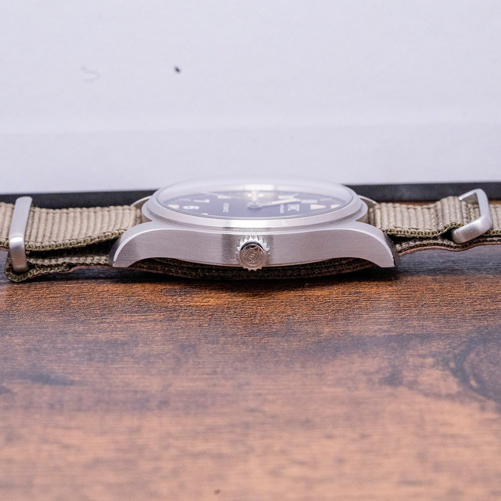 This 2017 IWC Pilot's Watch Limited to 1948 IW327007 pays tribute to the IWC Mark XI Edition, the Mark XI was produced from 1948 until the 1980s. It was mainly issued to the Royal Air Force but also was issued to the Commonwealth armed forces. The robust case and legible Arabic numerals made this a firm favourite amongst the many users of the Mark XI. This special edition was initially available exclusively from Harrods in London for a period of three months in July 2017, after that time, it was available for purchase in all IWC boutiques and authorised retailers, limited to 1,948 watches. A 40mm brushed and polished stainless steel case gently curves at the tapered lugs, and a lug-to-lug length of 51mm and a thickness of 10.5mm give the watch an impressive wrist presence. On the right side is a screw-down signed crown. A convex sapphire crystal with AR coating on both sides for excellent viewing angles sits above a matte black dial. An outer minute track with lume plots at 12, 3, 6, and 9, large Arabic numeral indices mark the hours coated in luminescence, and at 12 o’clock the iconic triangle. At 3 o’clock a date window. The baton hands are coated in luminescence complemented by a fine tapered sweeping second hand with a leaf counterweight. Text is precisely printed at 12 and 6 respectively. On the reverse, a screw-down case back with the special edition details and number out of 1948 engraved into it, inside an automatic IWC Cal. 35111, 25 jewels, 28,800 beats per hour, based on the Sellita SW300-1 developed using only 163 components. The watch comes fitted on its 20mm IWC NATO strap with a signed buckle and also comes with its IWC presentation box and papers.