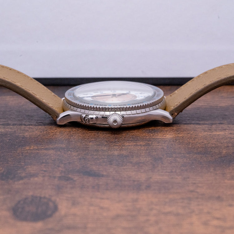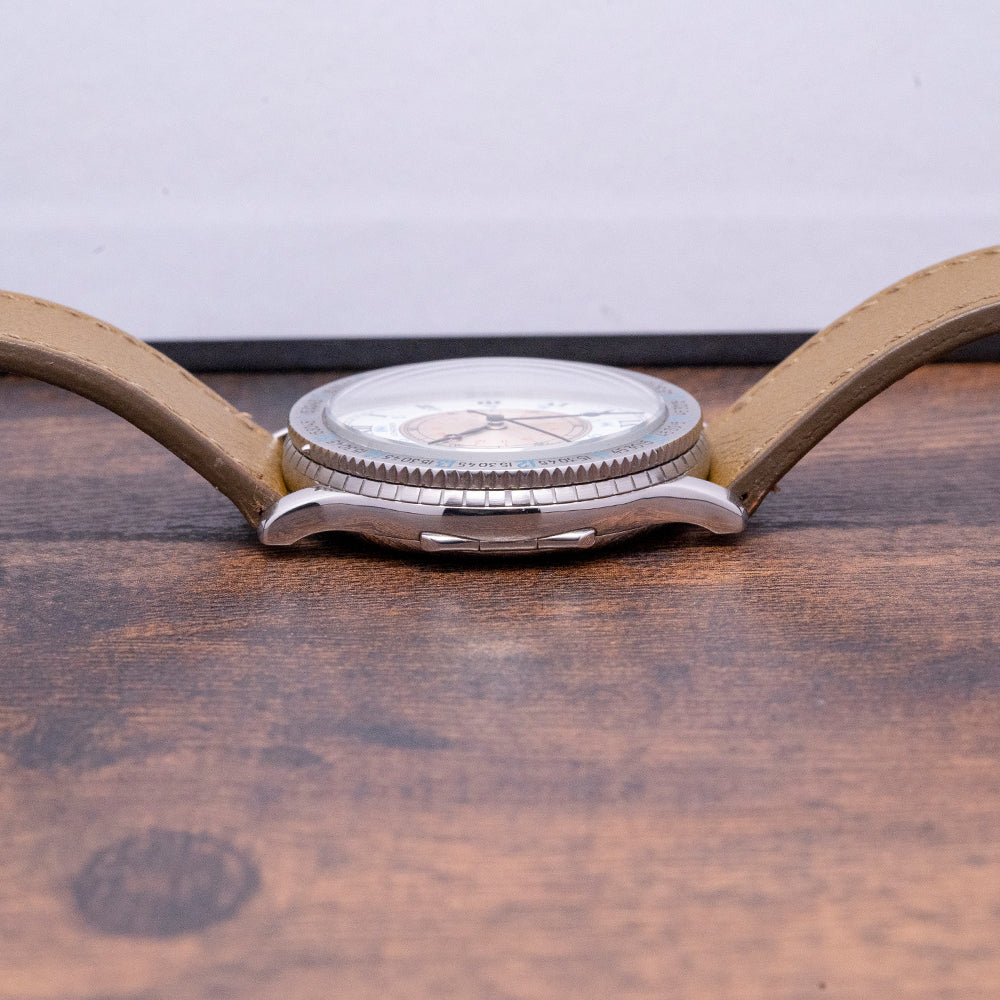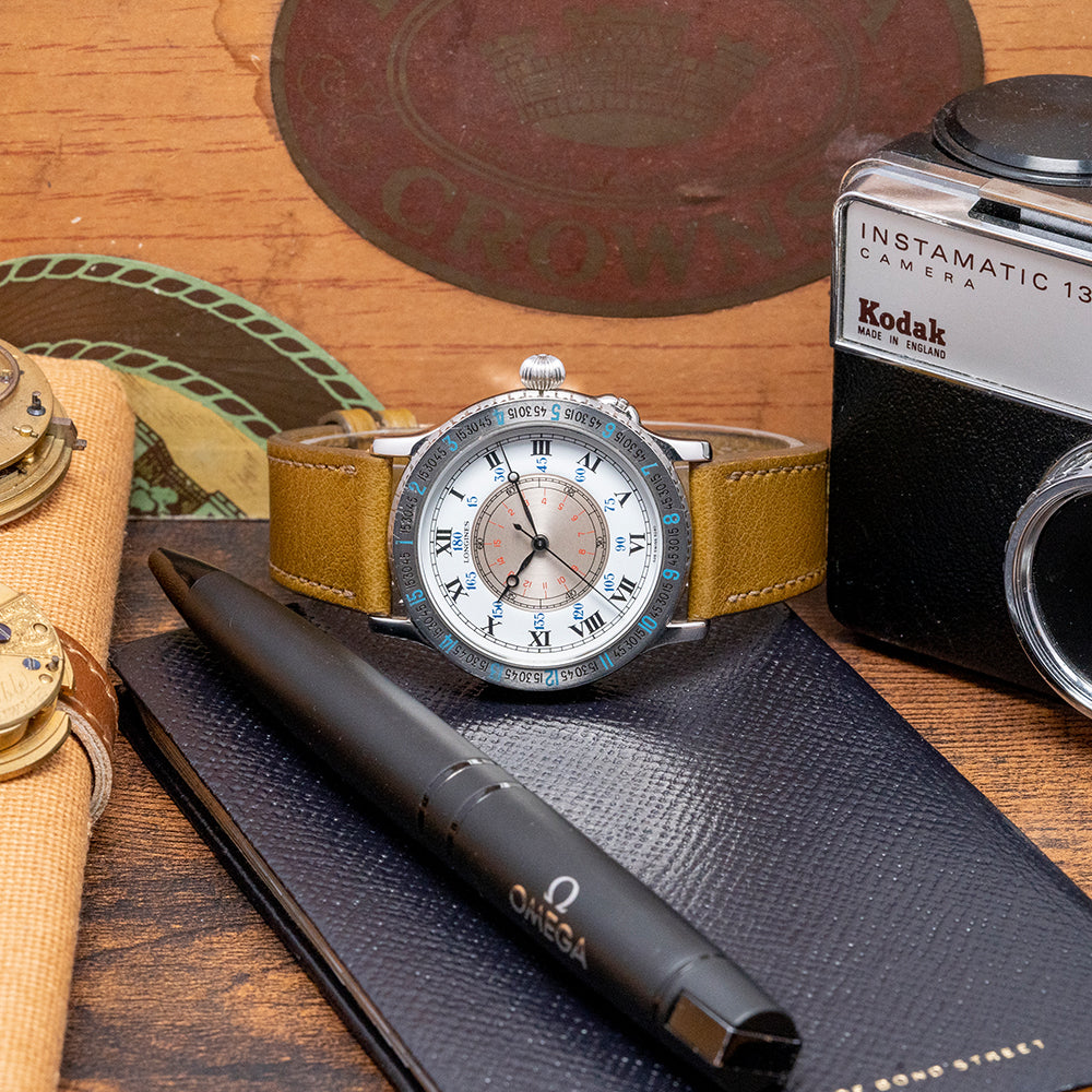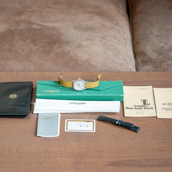 Here we have a 2017 Longines Lindbergh Hour Angle Automatic 628.524 celebrating the 90th anniversary of the first solo transatlantic flight made by Charles Lindbergh. In 1927 Charles Lindbergh flew solo from New York to Paris, it took him 33 and a half hours. After this intrepid flight, he came up with the idea of The Hour Angle system that uses a timepiece, the location of the sun, and maths calculations to provide the user’s longitudinal location on the earth's surface, very helpful for navigation. Part of the Longines Heritage Avigation collection, a play on words of Aviation and Navigation, this is a smaller version of their original 47mm Longines-Wittnauer, timepiece released in 1930-31. The 38mm polished stainless steel case curves over your wrist with finely tapered lugs, and a lug-to-lug length of 42mm and a case thickness of 11.5mm ensure a comfortable fit. On the right side an onion-style crown and a pusher to open the case back, like you would find on a pocket watch. The bidirectional bezel has deep knurling for a better grip and the engraved calibrated 15-degree Angle time scale is precisely marked, a high domed sapphire crystal sits above a white lacquered and silver dial. An outer minute track surrounds Roman numeral indices marking the hours above the calibrated 180 degrees in blue, the rotating silver disc is rotated using the crown to synchronise the Radio time signal, an inner minute track surrounds a red 15 degrees scale, elegant blued steel Breguet hands are complemented by a tapered second hand, at 12 o’clock we have the Longines motif completing this interesting Aeronautic tool watch. On the reverse, a snap on the case back opened with a pusher on the side of the case, engraved with the details of the watch on the inside and the engraved Longines motif in the centre on the outside, inside an automatic Longines Cal. L628.1, 21 jewels. The watch comes paired with a 20mm leather strap and a signed pin buckle, and this watch is sold with its original Longines box, travel pouch and paperwork.