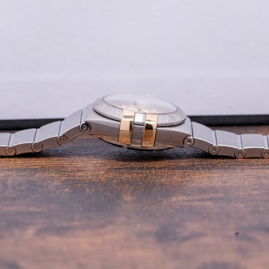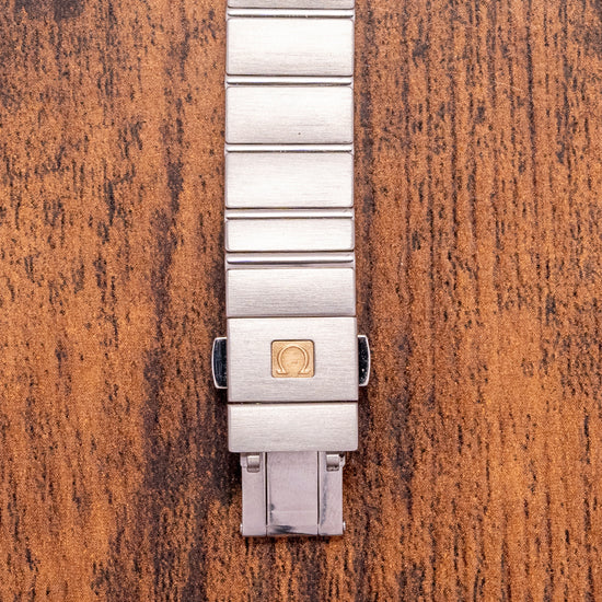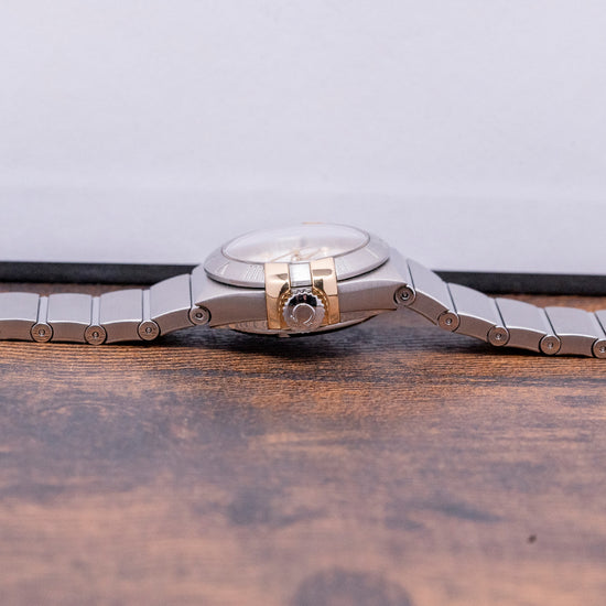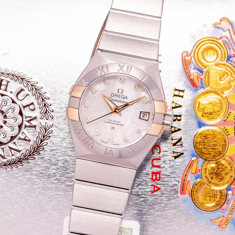 Here we have a beautiful 2017 Omega Constellation Co-Axial MOP & Diamond Dial with a 27mm barrel-shaped brushed stainless steel case; the elegantly flowing lines of the integrated tapered bracelet lead to a lug-to-lug length of 31.5mm and a case thickness of 11.5mm, ensuring a comfortable fit on your wrist. On the right side is a recessed signed crown. The domed steel bezel has large deep engraved Roman numerals and four characteristic “Griffes” or claws, a domed sapphire crystal AR coated on the inside sits above a stunning Mother of Pearl dial that shimmers in the light. The delicate diamond inset applied indexes mark the hours, and at 3 o’clock, a yellow gold framed date window perfectly balances this jewel-like dial. Elegant 18ct yellow gold Dauphins hands are complemented by a tapered sweeping second hand; at noon, we have the yellow gold Omega motif “Constellation” underneath, and at 6 o’clock, the Co-Axial Chronometer with an applied 18ct yellow gold Constellation star underneath completes this striking dress watch. On the reverse, an exhibition case back, with the details engraved around its edge, inside an Automatic Omega Cal. 8520, 28 jewels, beating at 25,200 beat per hour, fitted with a silicon-balance spring and Co-Axial Escapement, giving the rhodium-plated movement incredible precision, and durability, decorated in luxurious Côtes de Genève. The watch comes paired with its integrated Omega 17.5mm brushed stainless steel bracelet secured by a signed push-button concealed butterfly clasp and will fit up to a 7-inch wrist and comes with its Omega presentation box and paperwork.