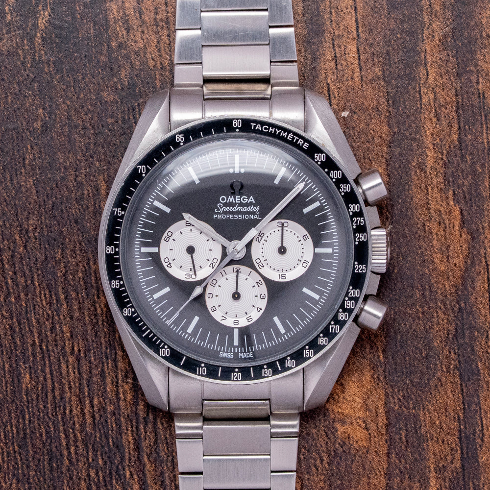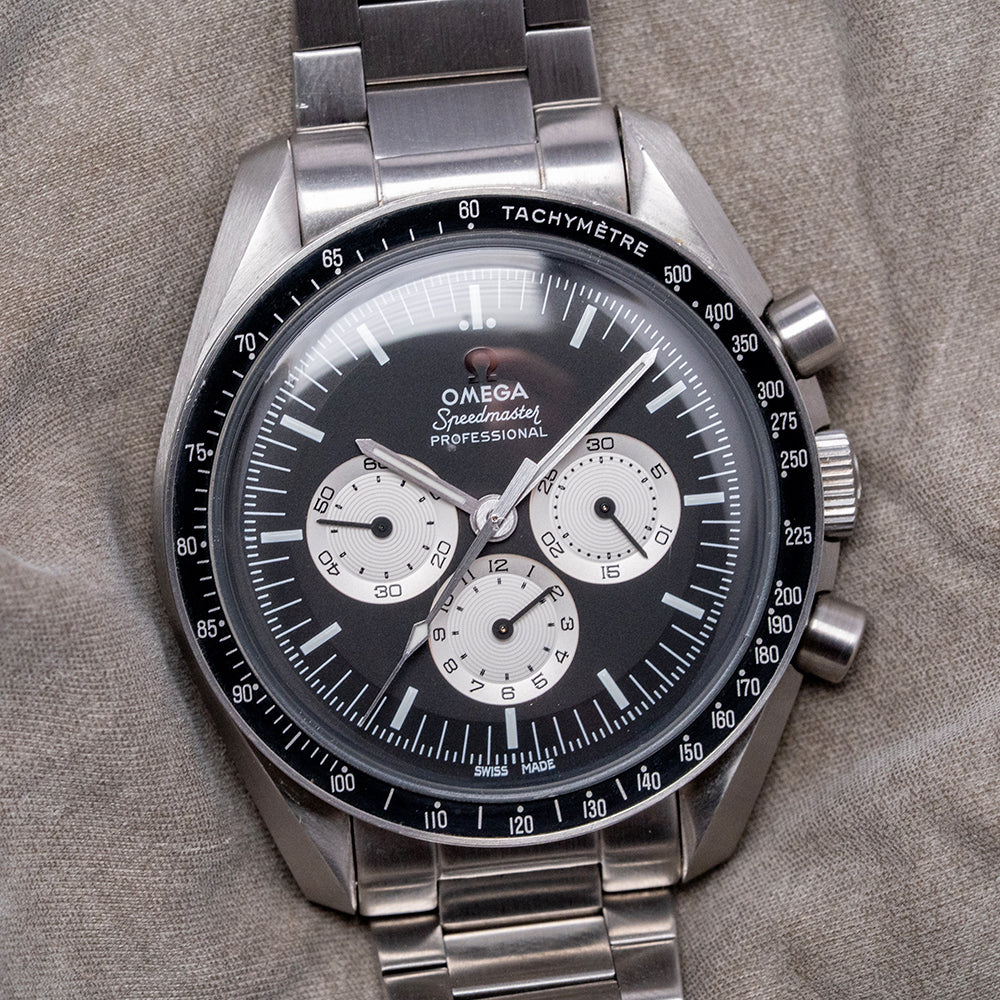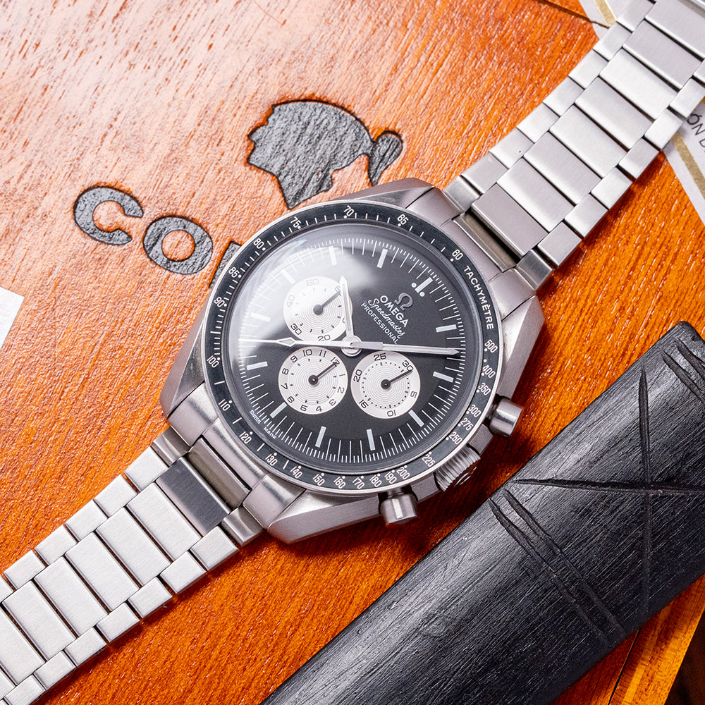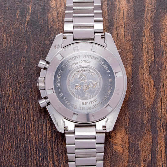 Here we have a 2017 Omega Speedmaster 'Speedy Tuesday' Limited Edition of 2012 pieces. Launched in 2017 it was an inspired tribute to the 1978 Alaska Project III edition made for NASA space shuttle program, it sold out as an online exclusive in just 4 hours, and is named after the online hashtag #SpeedyTuesday created by Robert-Jan founder of Fratello Watches in 2012, where he showed an Omega Speedmaster, it soon became a popular place to celebrate the Omega Speedmaster in all its editions, it also celebrates their #SpeedyTuesday 5th Anniversary. Featuring a 42mm stainless steel case with completely brushed surfaces that lead to the characteristic twisted tapering lugs, the crisp lines transition effortlessly around the case. A lug-to-lug length of 48mm and a case thickness of 14mm ensure a comfortable fit on the wrist. Down the right side, we have the recessed piston chronograph pushers and a signed crown in the centre. A fixed bezel has a black aluminium insert with a tachymeter scale. The matte black reverse panda dial is protected by a domed Hesalite crystal, and an outer minute track precisely executed with slim baton indexes coated in Super-LumiNova marking the hours. Three white recessed concentric patterned Sub-dials are made up of 60 seconds, 30 minutes, and 12 hours. Each of the numerals runs radially around the subdial just like the Alaska Project III watch. Slender brushed steel hands are complemented by an elegant, long central chronograph seconds hand that accurately aligns with the minute track, creating perfect symmetry on the dial. At noon, we have the Omega motif and ‘Speedmaster Professional’ completing this distinctive chronograph. The screw-down case back is engraved with ‘Speedy Tuesday Anniversary’, 'A Tribute to Alaska Project III’, inside we have the manually wound Omega Cal. 1861, featuring 18 jewels, 21,600 beats per hour, based on the Lemania 1873. The watch comes paired with a 20mm Forstner flat-link bracelet, which includes all links, as well as two Omega 20mm straps and Omega pin buckles. This watch is sold with its original Omega presentation box, swing tag, spring bar removal tool, and Omega paperwork.