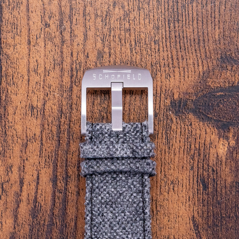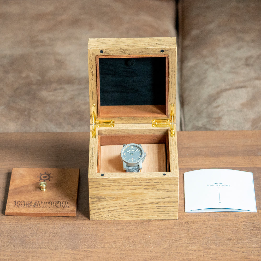Here we have an early 2017 Schofield Beater 1 Grey Enamel Dial Automatic that has a 45mm bead-blasted stainless steel case, its hand-finished industrial design adds character and uniqueness to the watch, sloping wide screw-in lugs with a lug-to-lug length of 52.5mm and a thickness of 14mm give the watch a unique wrist presence. On the right side, is a deeply knurled crown, a smooth bezel holds a flat sapphire crystal AR coated above the Grey Enamel dial, and Super-LumiNova coated numerals at 12, 3, 6, and 9 with dagger indexes in between marking the hours. An inner minute track is clearly printed, the centre cap has a small indicator which Schofield calls “Sign-of-Life” second hand and sword hands filled in SuperLumiNova. At 12 o’clock the Schofield motif and at 6 o’clock a red “B” Beater. On the reverse, a screw-down exhibition case back, inside an automatic NOS Synchron ETA movement. The watch comes fitted with its 24mm Schofield strap with a signed buckle and also comes with its Schofield presentation box and papers.