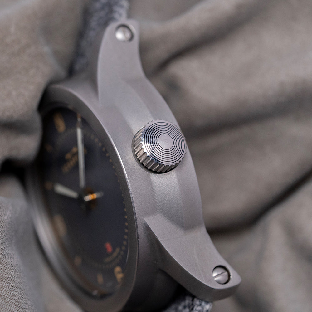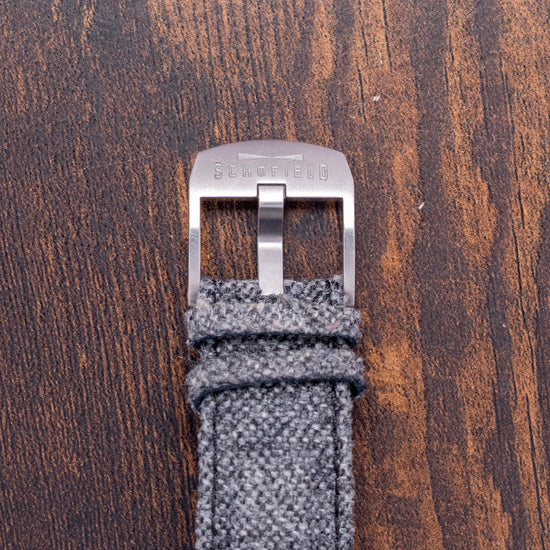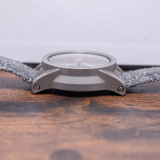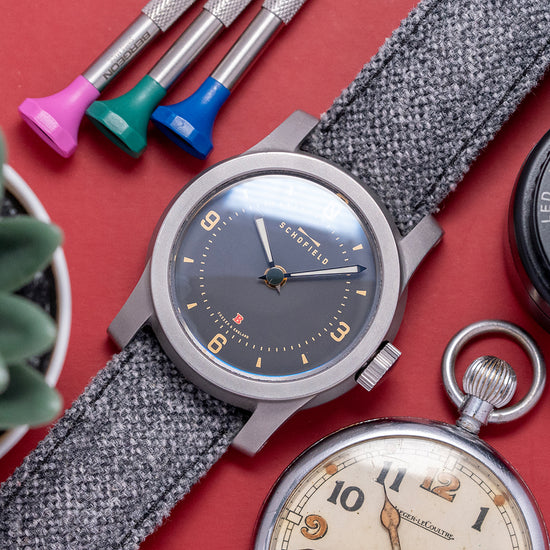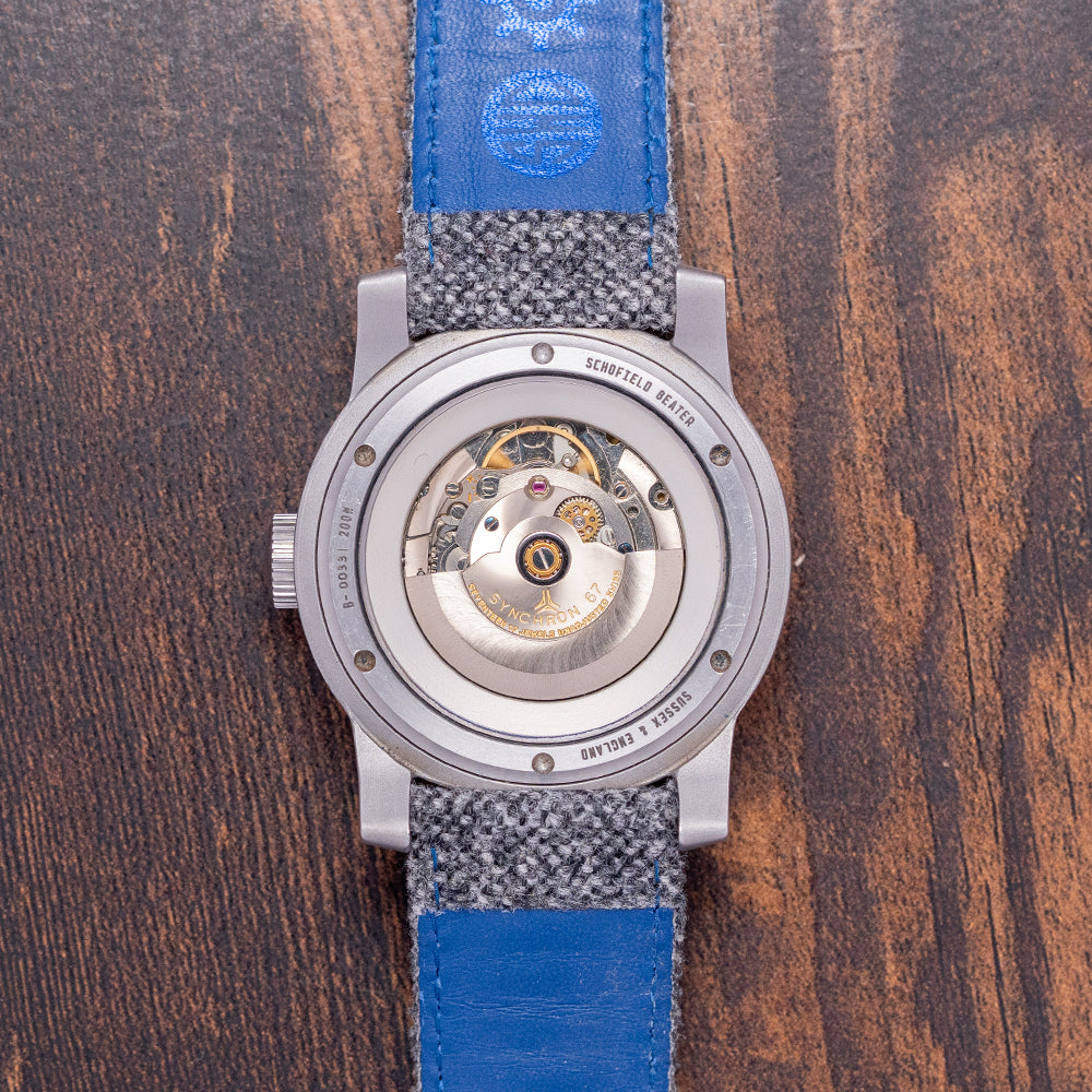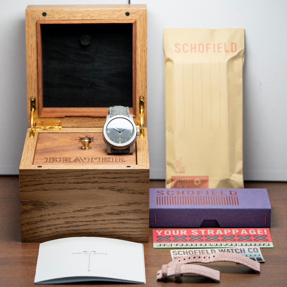 Here we have an early 2017 Schofield Beater 1, with a 44mm bead-blasted stainless steel case and a grey enamel dial. Its hand-finished industrial design adds character and uniqueness to the watch. Sloping wide screw-in lugs with a lug-to-lug length of 52mm and a thickness of 15mm give the watch a unique wrist presence. On the right side is a deeply knurled crown. A smooth bezel holds a flat AR-coated sapphire crystal above the Grey Enamel dial, and Super-LumiNova-coated numerals at 12, 3, 6, and 9, with dagger indexes in between, mark the hours. An inner minute track is clearly printed; sword hands are filled with SuperLumiNova. At 12 o’clock, the Schofield motif and at 6 o’clock, a red “B” Beater. On the reverse, a screw-down exhibition case back, inside an automatic NOS Synchron ETA movement. The watch comes with two 24mm Schofield straps with one signed buckle, and also comes with its Schofield presentation box and papers.